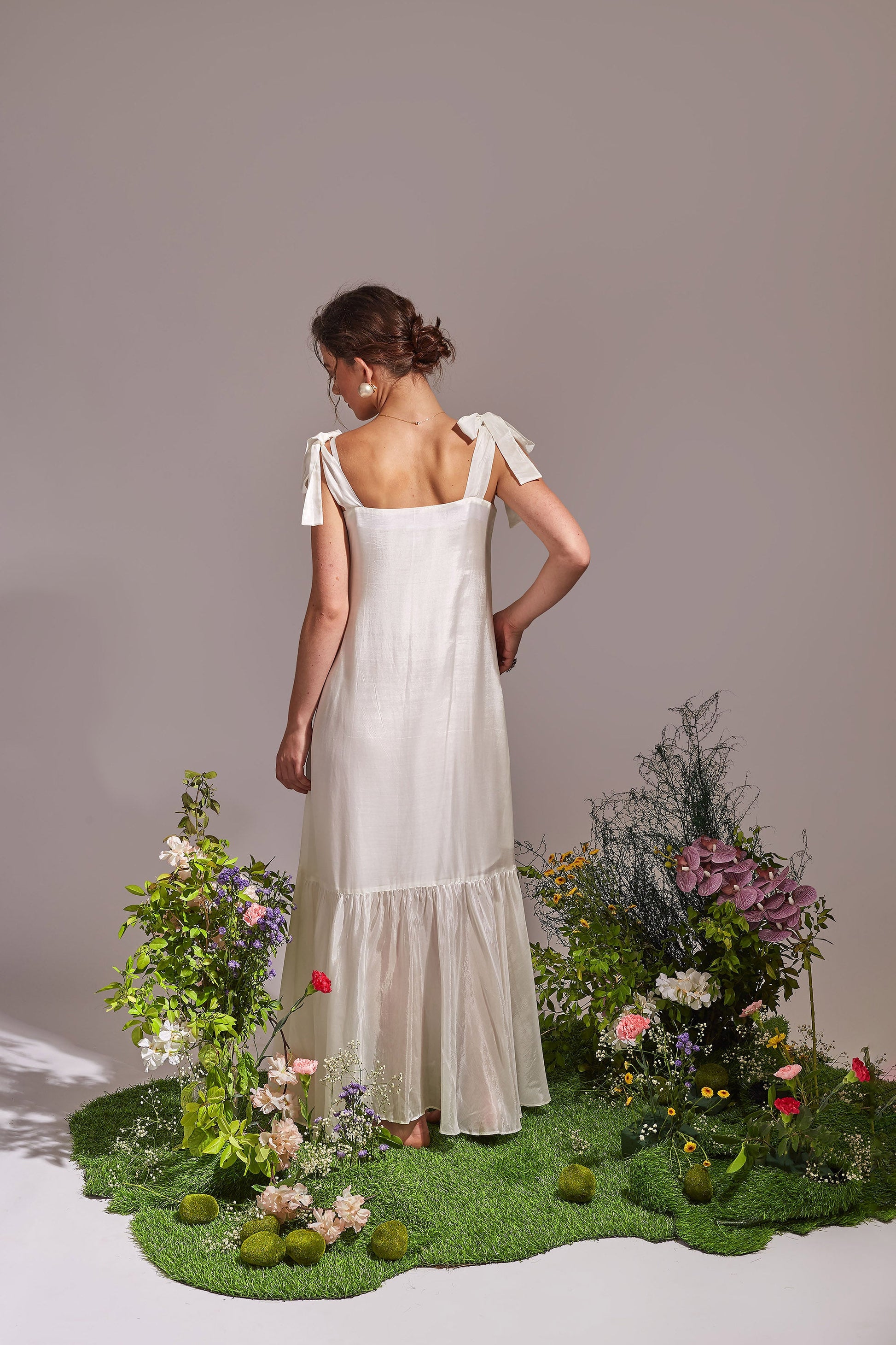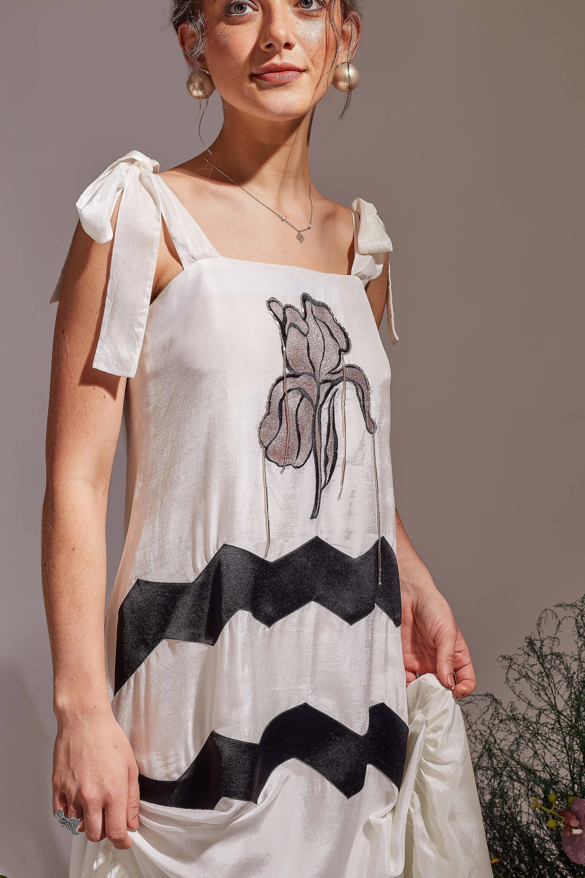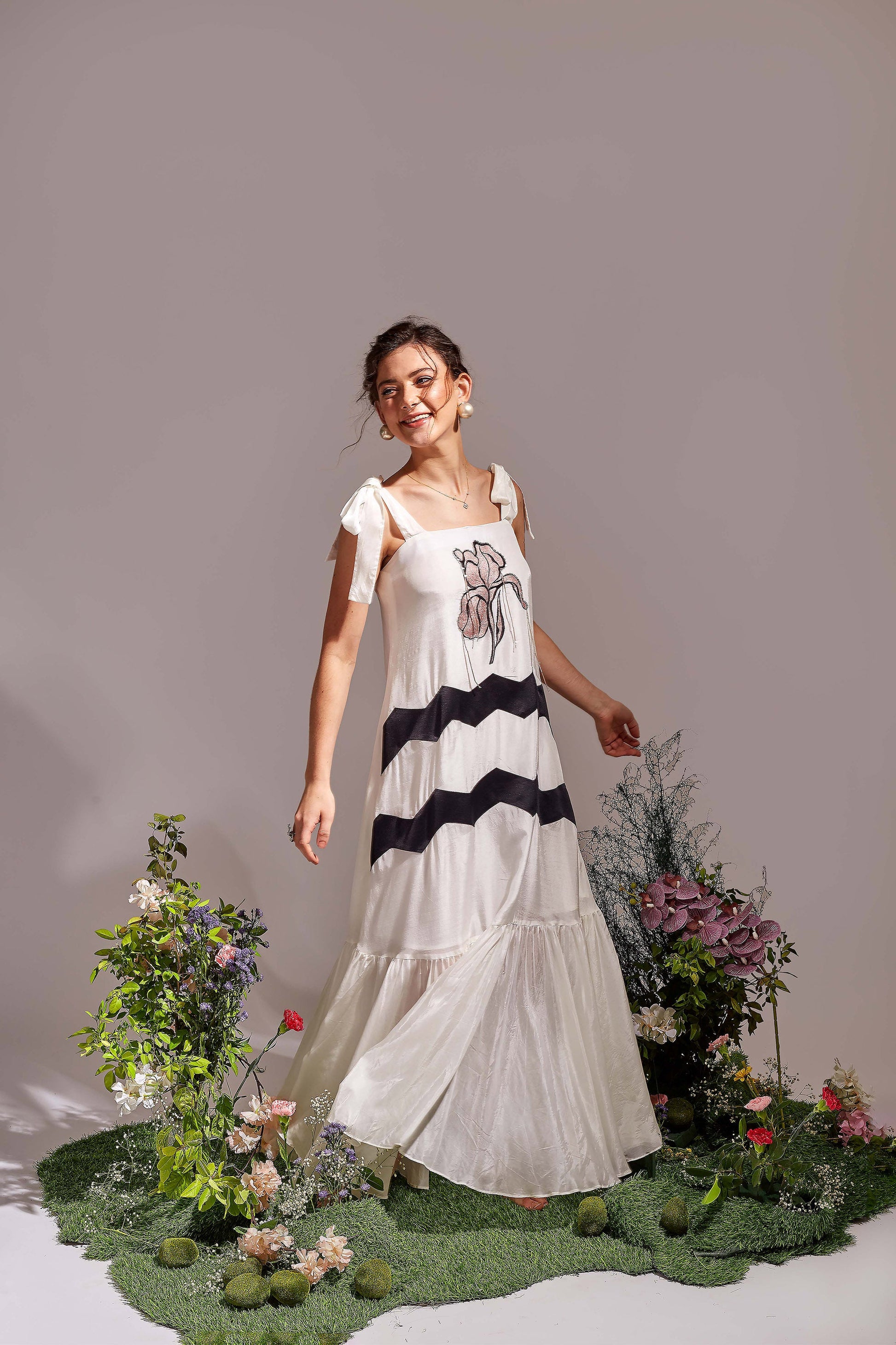 Step into timeless elegance with our white flared dress intricately adorned with delicate thread embroidery, creating a beautiful patchwork effect. To add a striking contrast, we've incorporated black cut and sew zigzag appliqué.