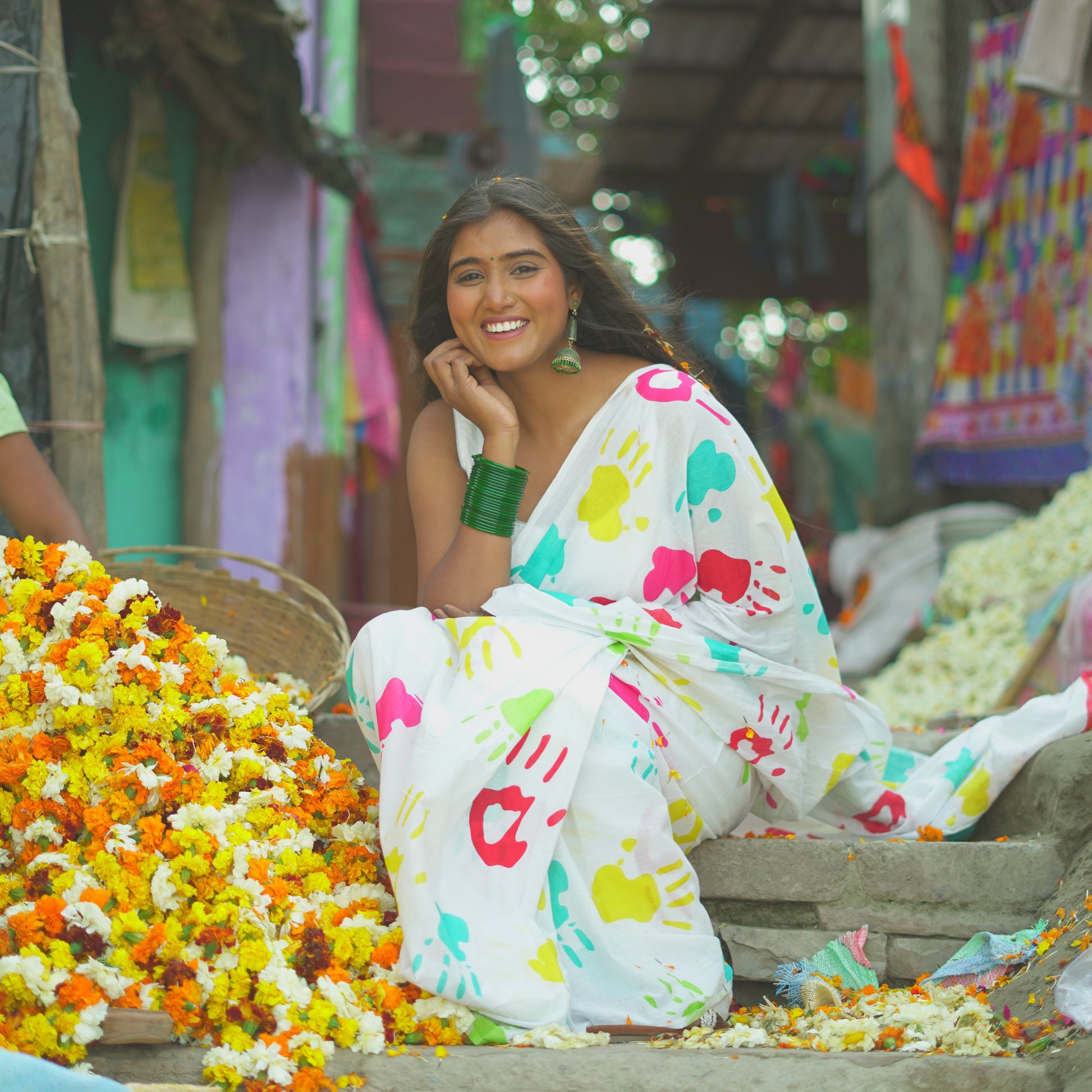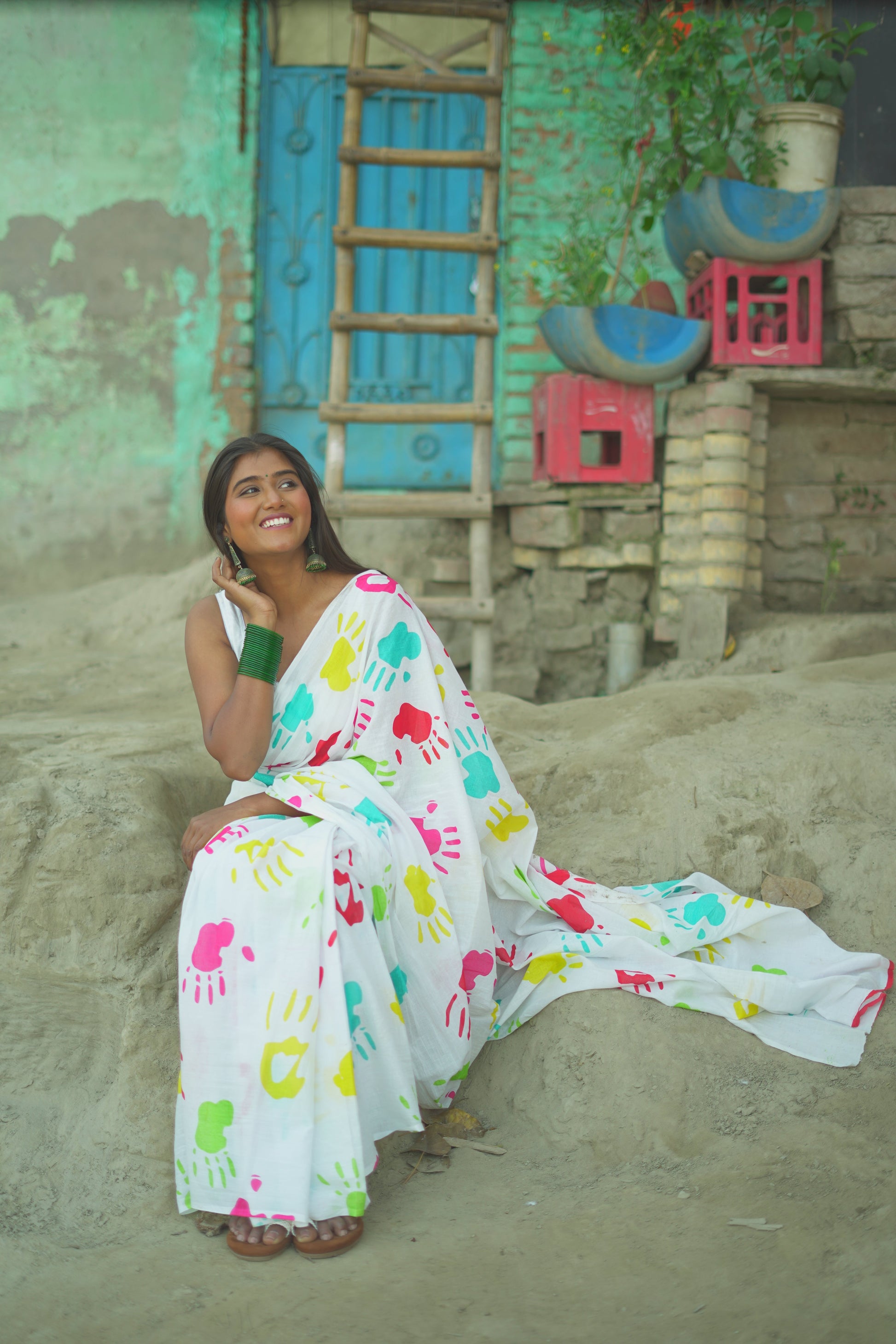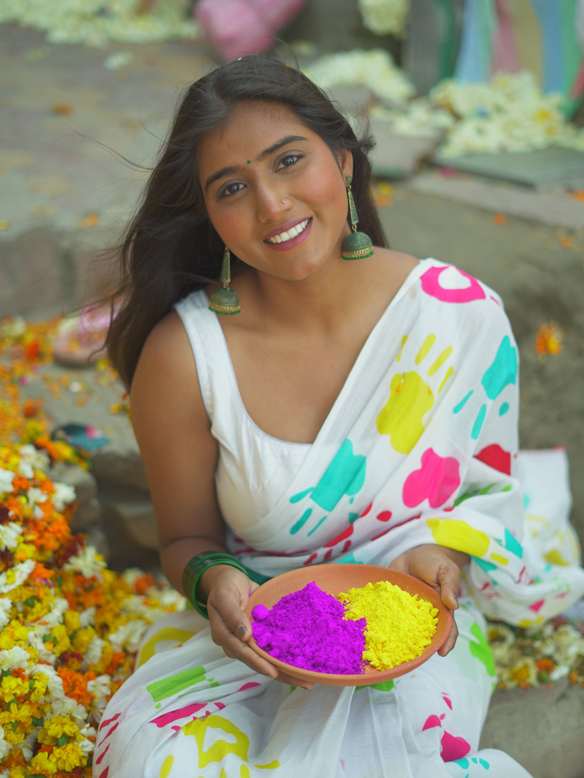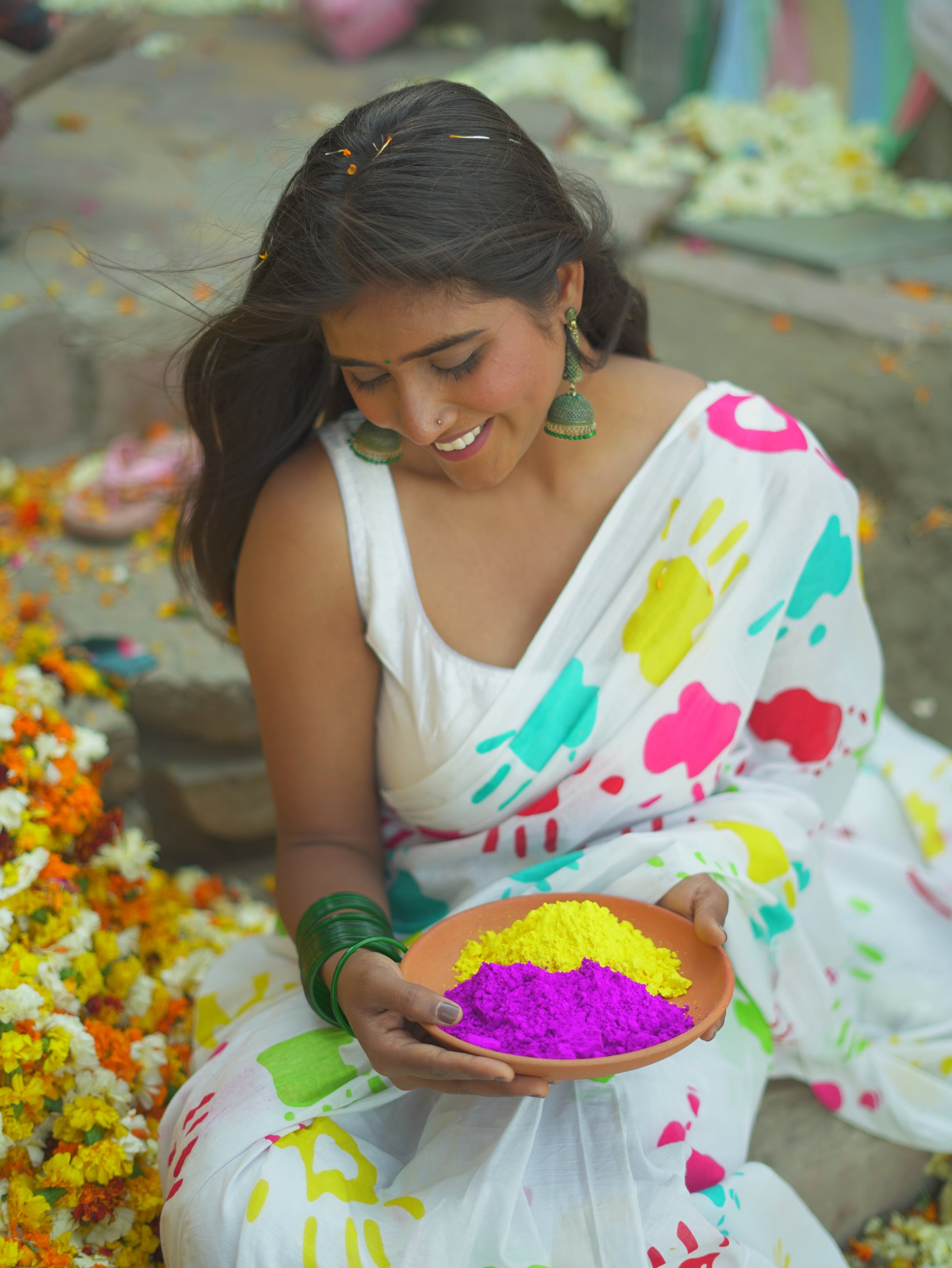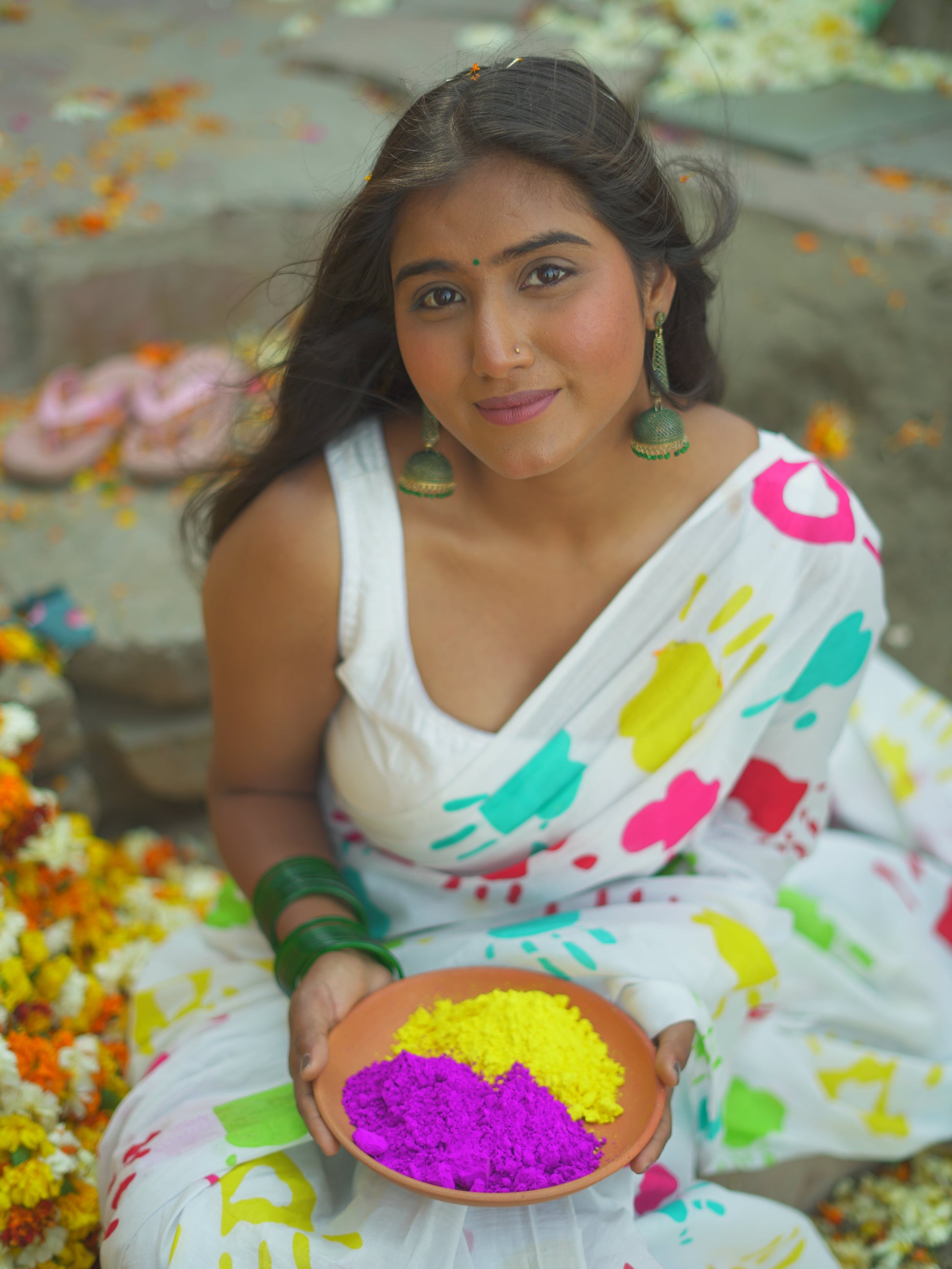 The Holi Celebration Saree is a vibrant and lightweight ensemble, epitomizing the joyous spirit of the festival. Bursting with a kaleidoscope of colors, it captures the essence of Holi's playful festivities. Intricate detailing like hand embroidery or mirror work adds a touch of sparkle and allure. Draped gracefully, it exudes joy and exuberance, perfect for dancing and revelry. Paired with colorful accessories, it creates a stunning and festive look sure to spread cheer during the celebrations.
