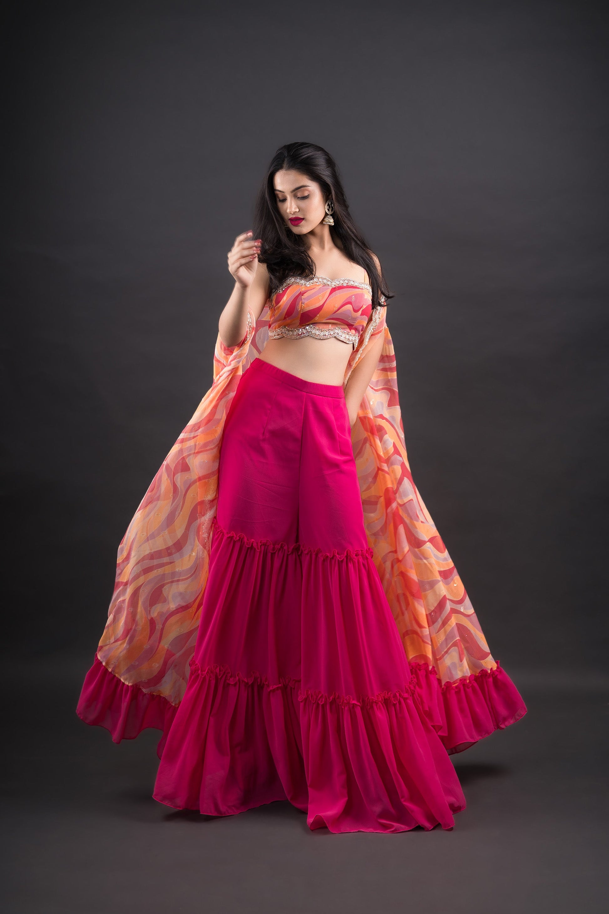 Hot pink Gharara Pants paired with abstract printed crop-top and long cape