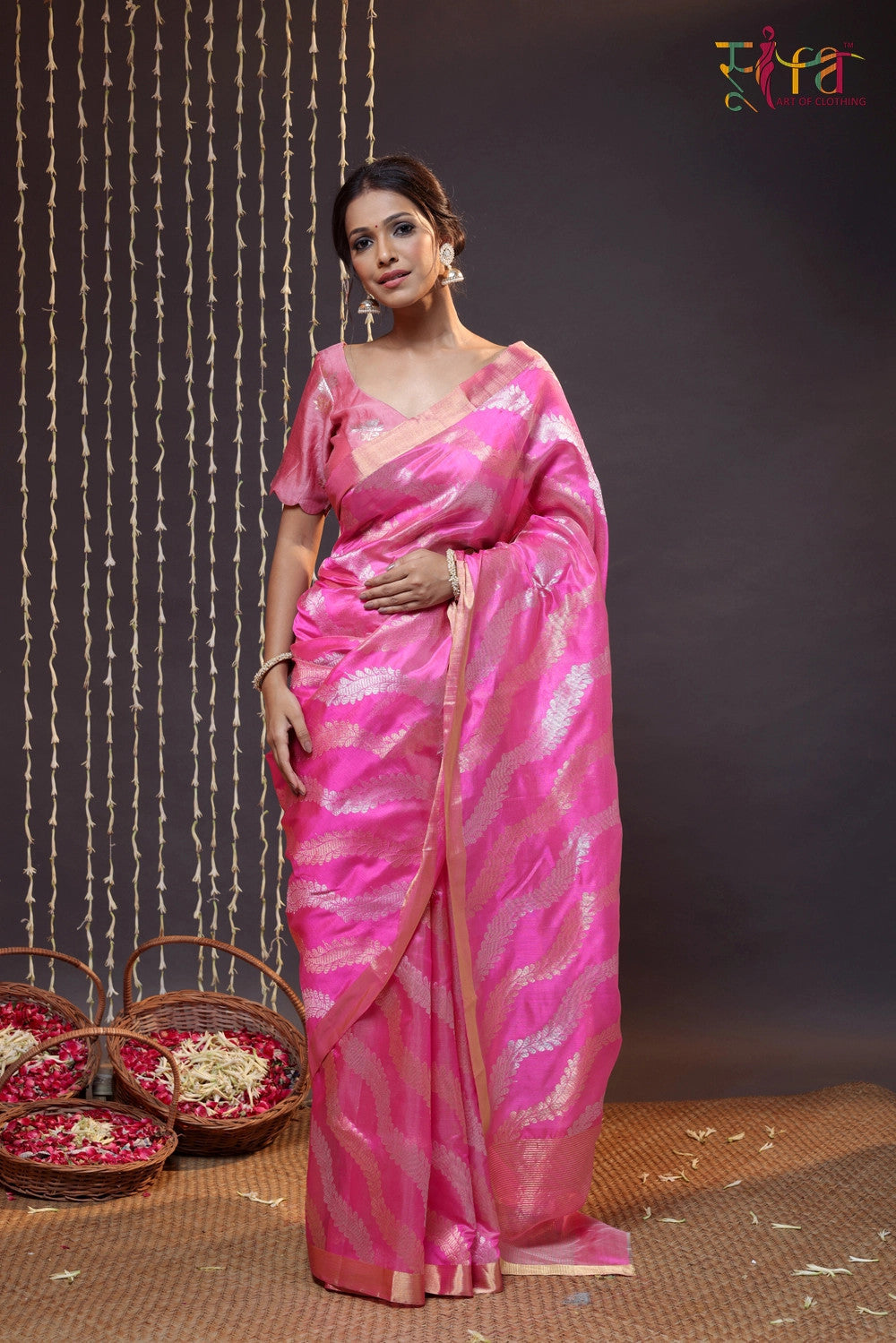 Hot Pink Handloom Chanderi Silk Saree With Zari
