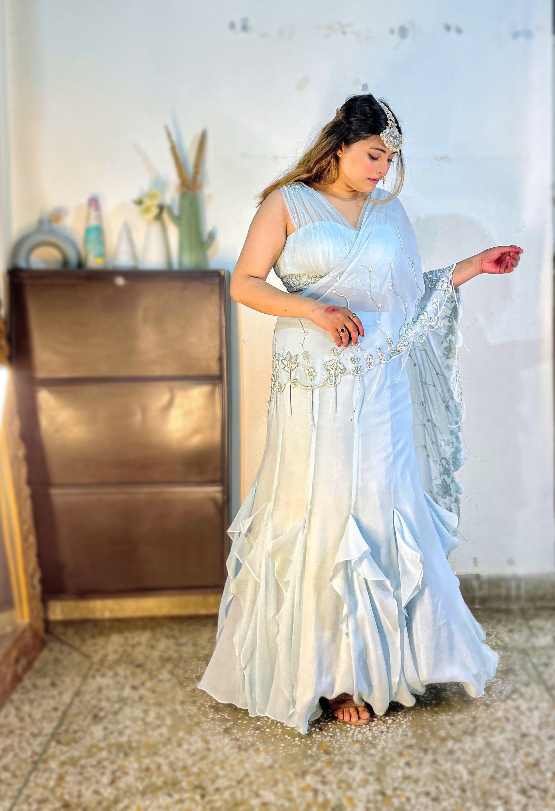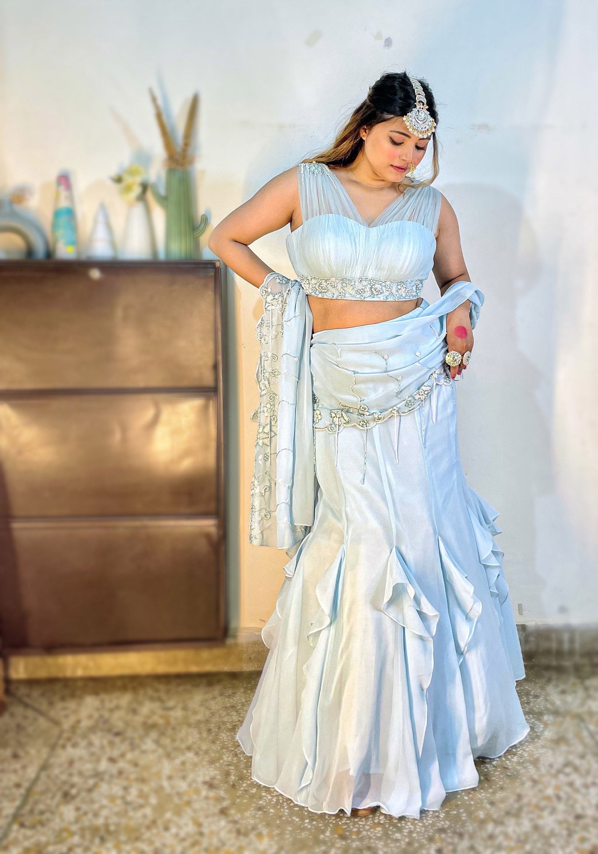 Ice Blue Georgette hand embroidered Cocktail Lehenga