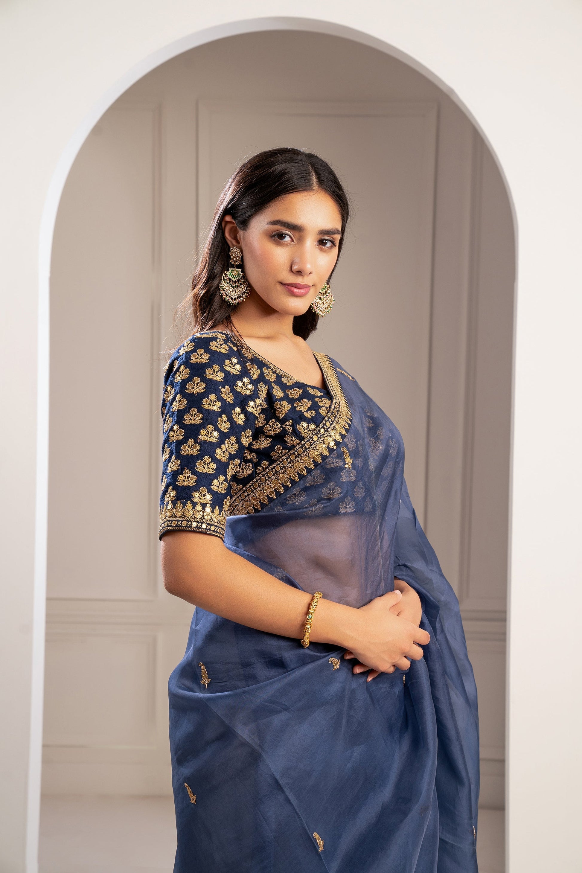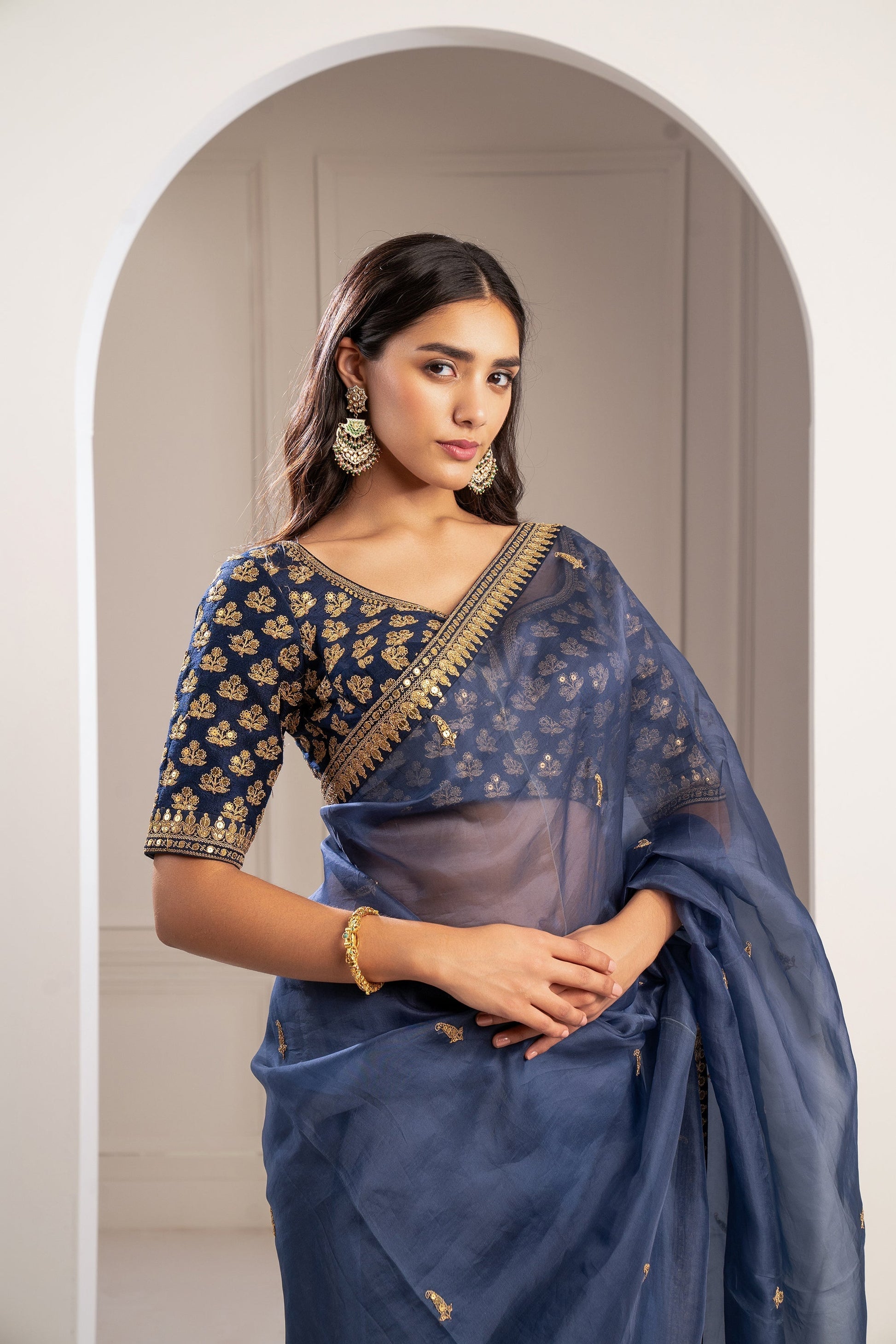 Indigo blue organza saree with machine embroidery and sequins work on borders. 2) Paired with matching padded blouse.