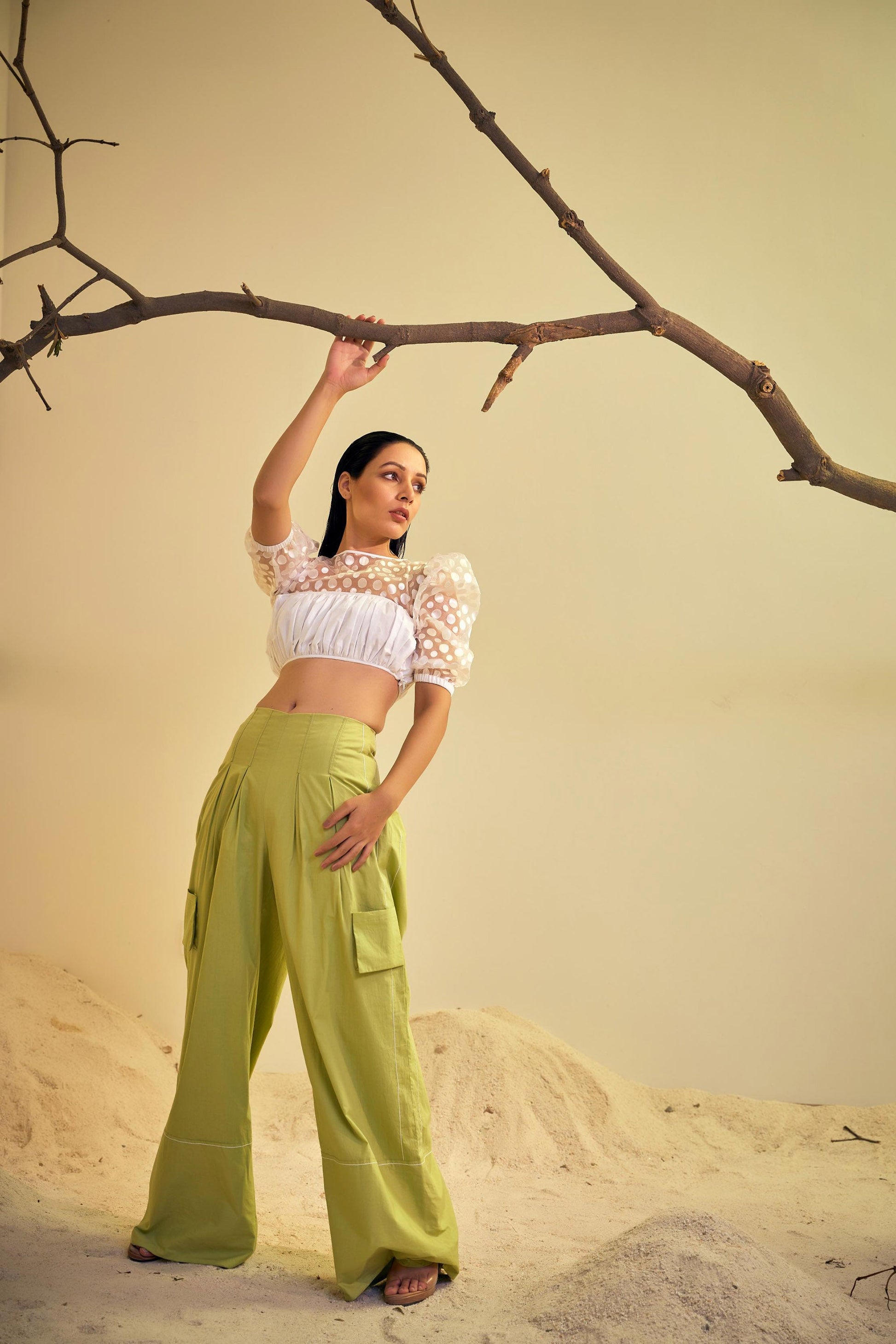 Iris is a polka mix solid crop top with gathered bustier details and puff sleeves with elasticated cuffs.