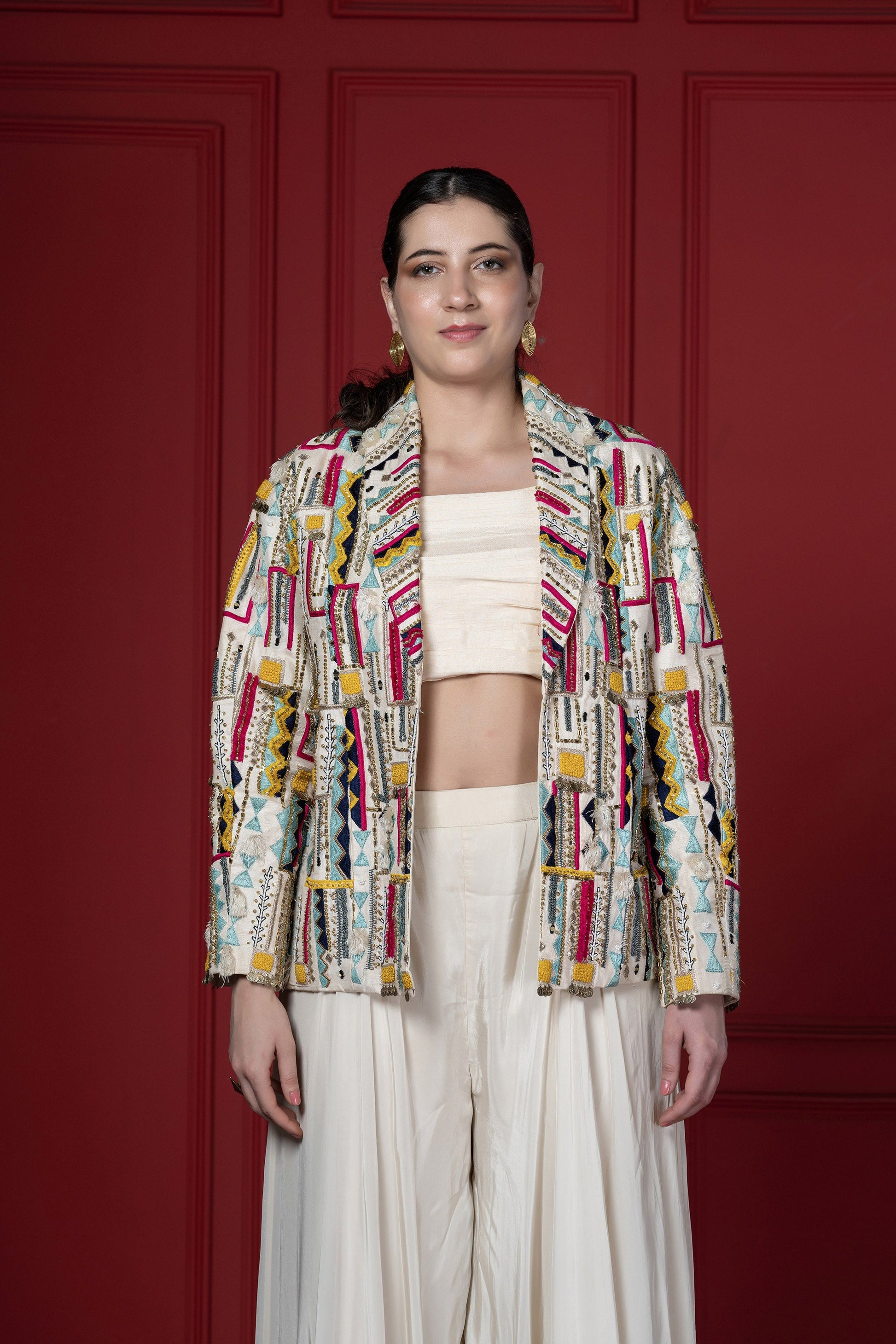 Elegant Ivory Embroidered Jacket with Multi-Colored Thread and Hand work with plain pleated spaghetti & pleated palazzo