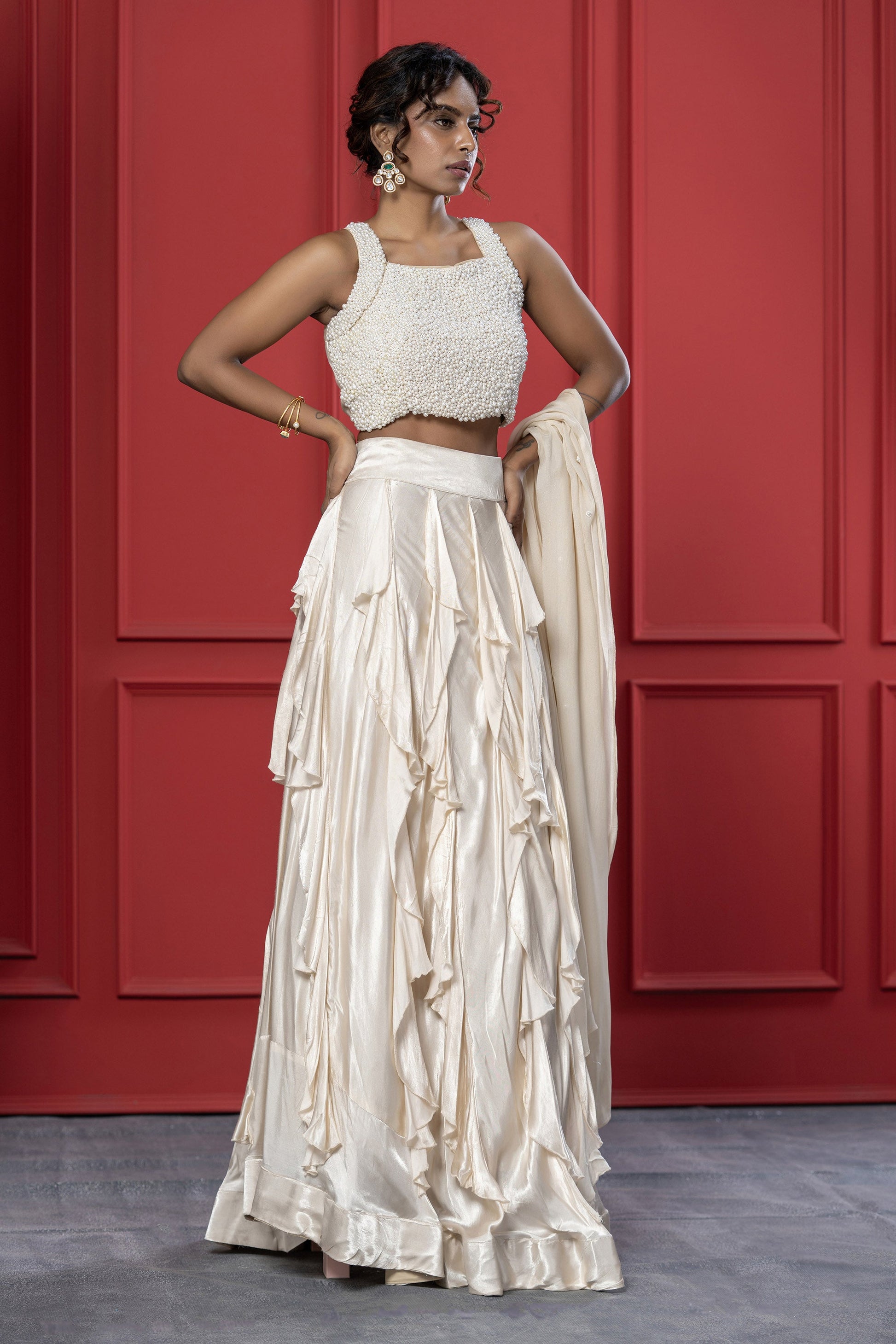 Ivory Ruffle Gaji Silk Pearl Lehenga