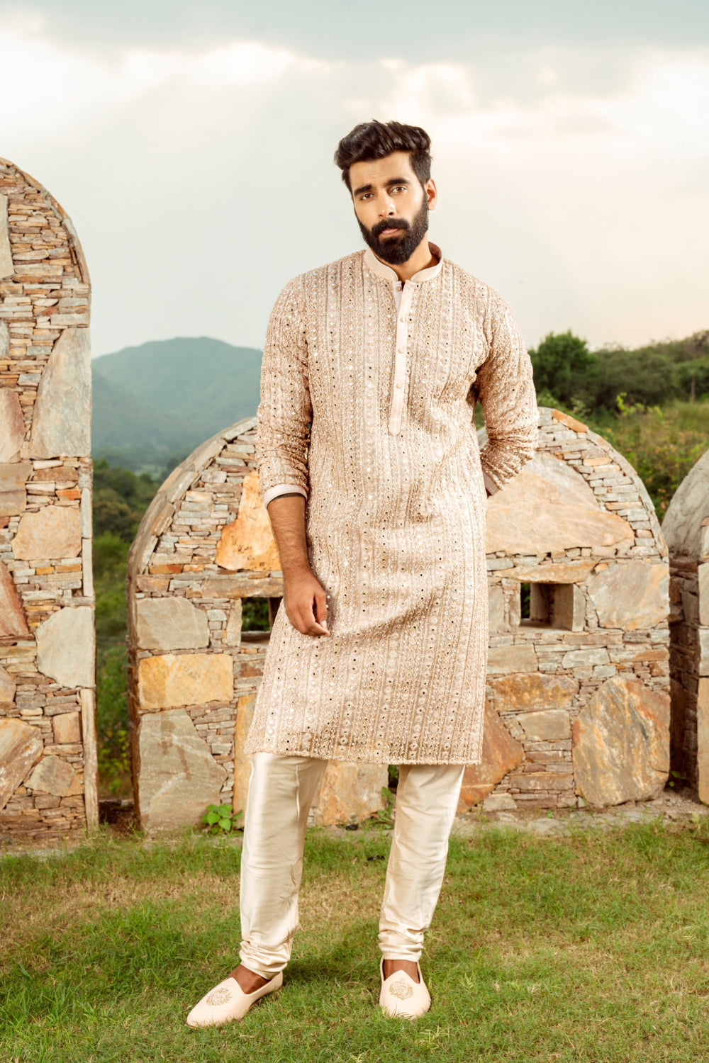 Indulge in timeless elegance with the ivory silk kurta set, lavishly adorned with mirror and thread work, creating beautiful texture. Paired with a pristine white pajama for a complete look.
