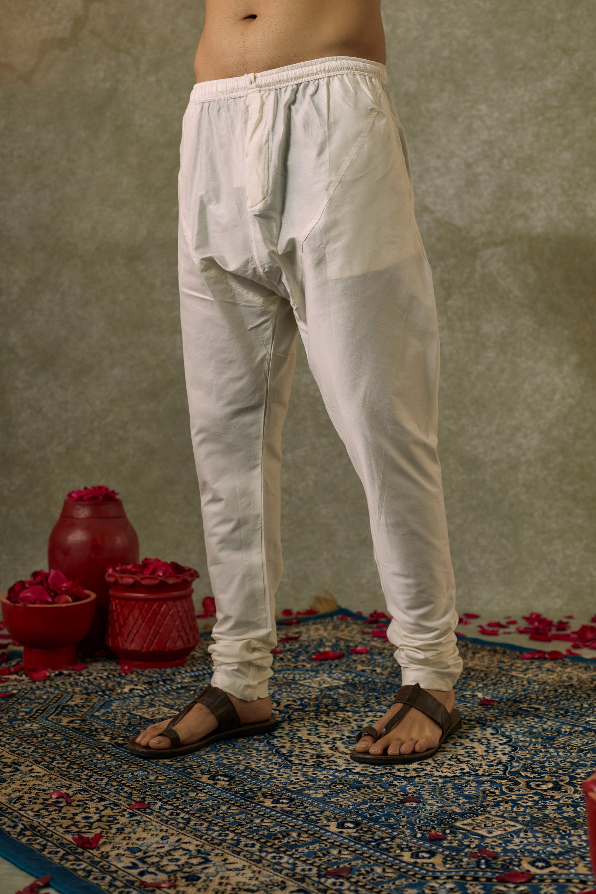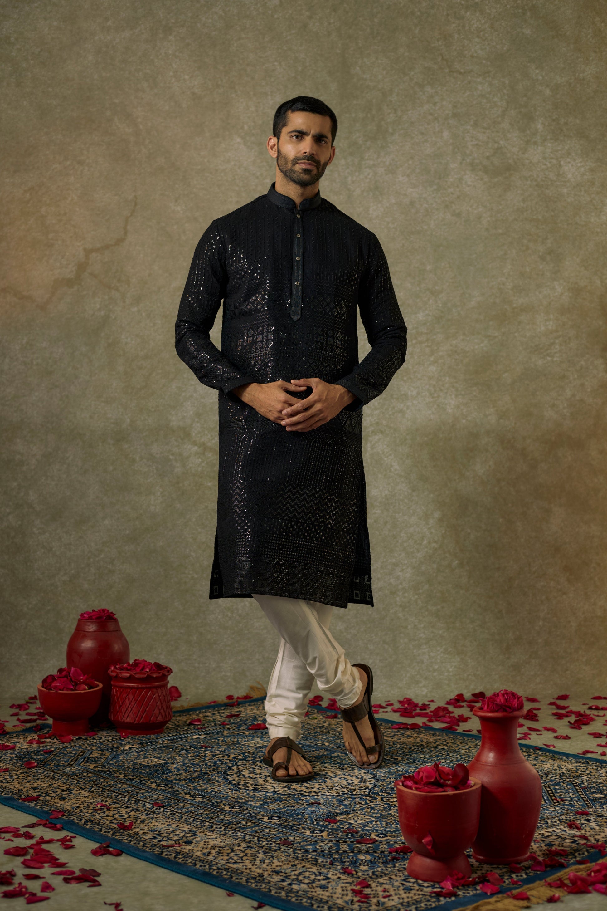 Jet Black Kurta Pajama Set in Lucknowi Fabric with Sequins paired with Cream Churidar making an ideal fits for Festive wear and Sangeet.
