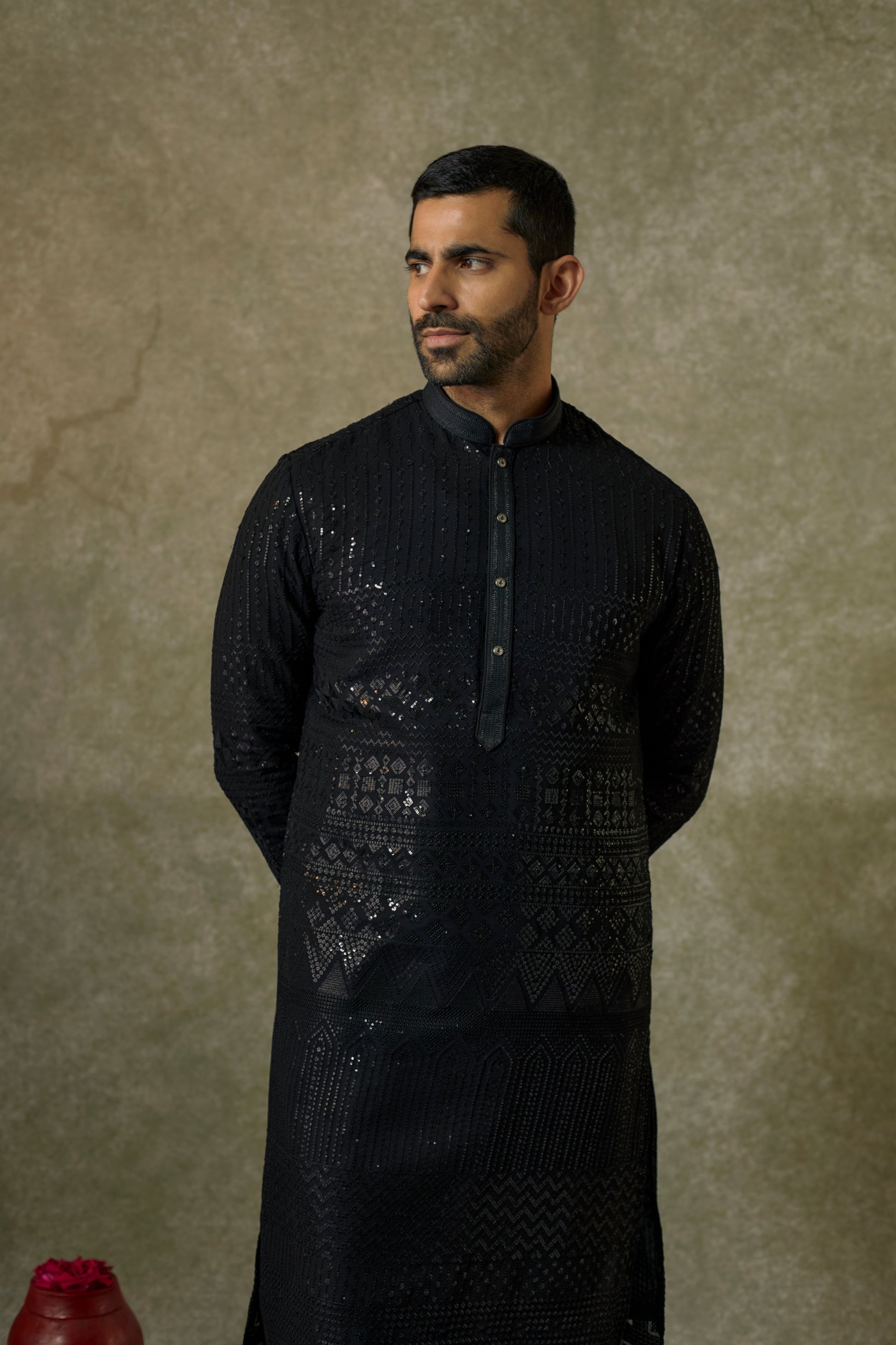 Jet Black Sequins Lucknowi Kurta Pajama Set
