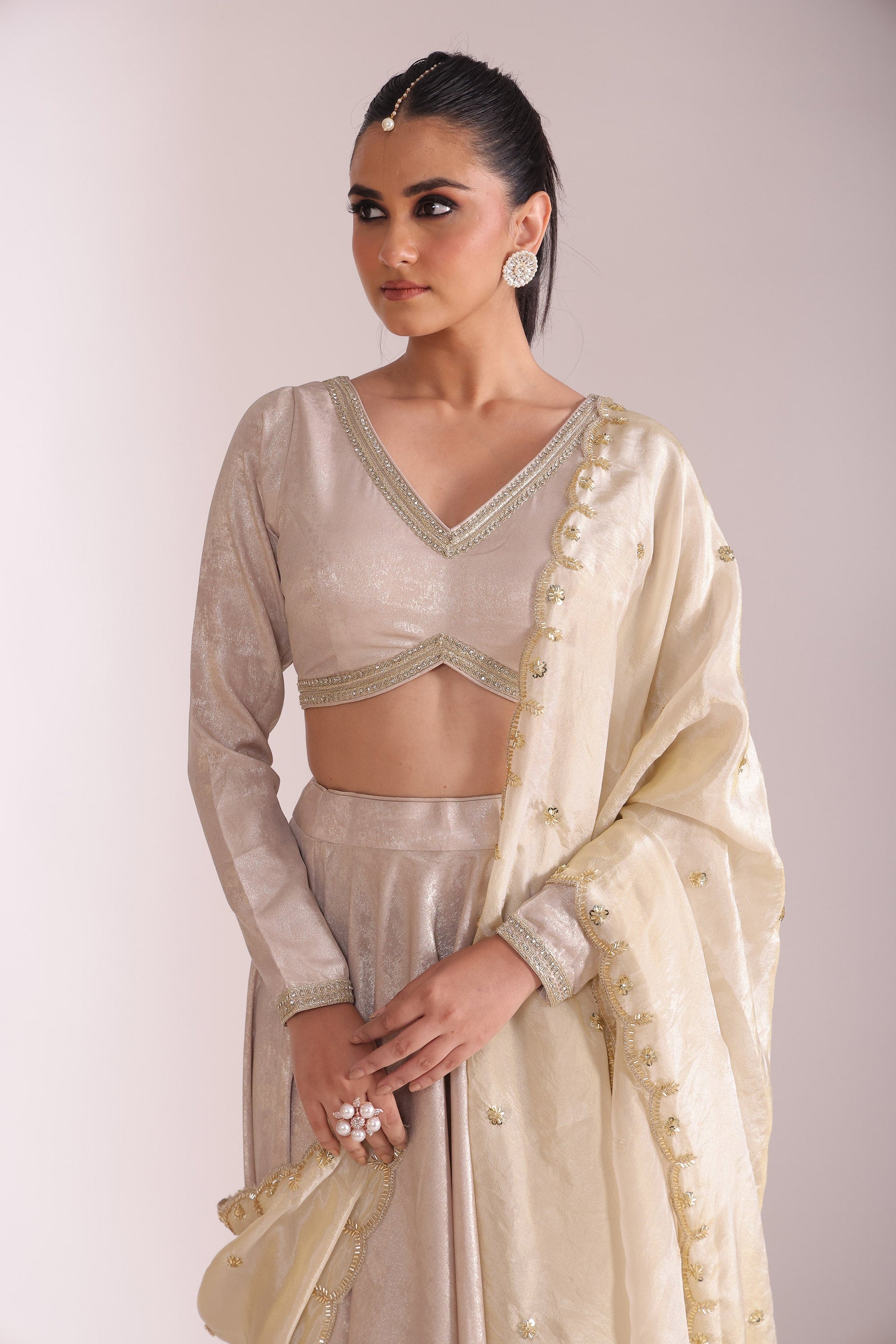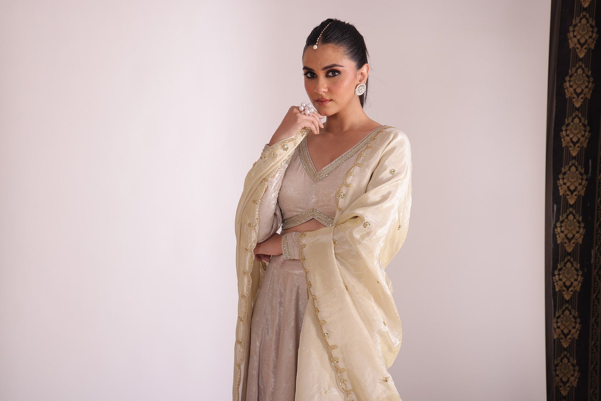 This set includes a Metallic Rose Gold Blouse, Full-Flare Lehenga, and Embroidered Tissue Dupatta. The blouse is crafted from premium dual-tone metallic crepe in a rose gold shade, padded for a structured fit and elevated with a subtle sheen. It is paired with a voluminous full-flare lehenga that enhances movement and grace. A hand-painted and embroidered tissue dupatta completes the ensemble, adding a touch of delicate artistry and elegance.