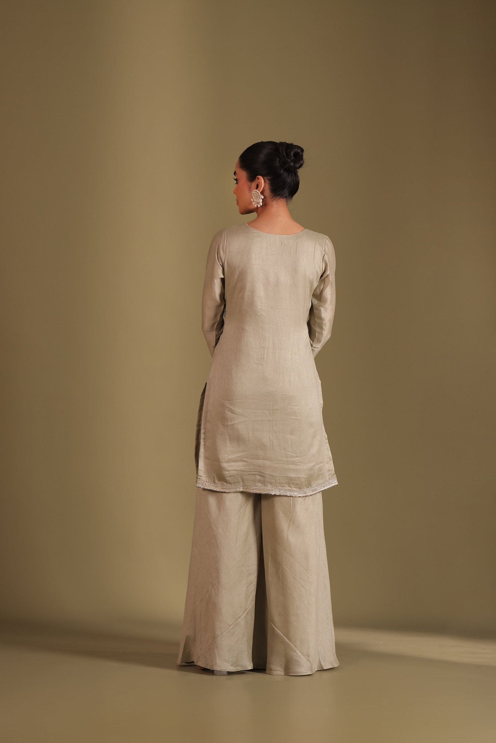 The kurta is crafted from luxurious sage Kashmiri silk, featuring intricate detailing along the hem and sleeve ends, lending a refined and graceful finish.