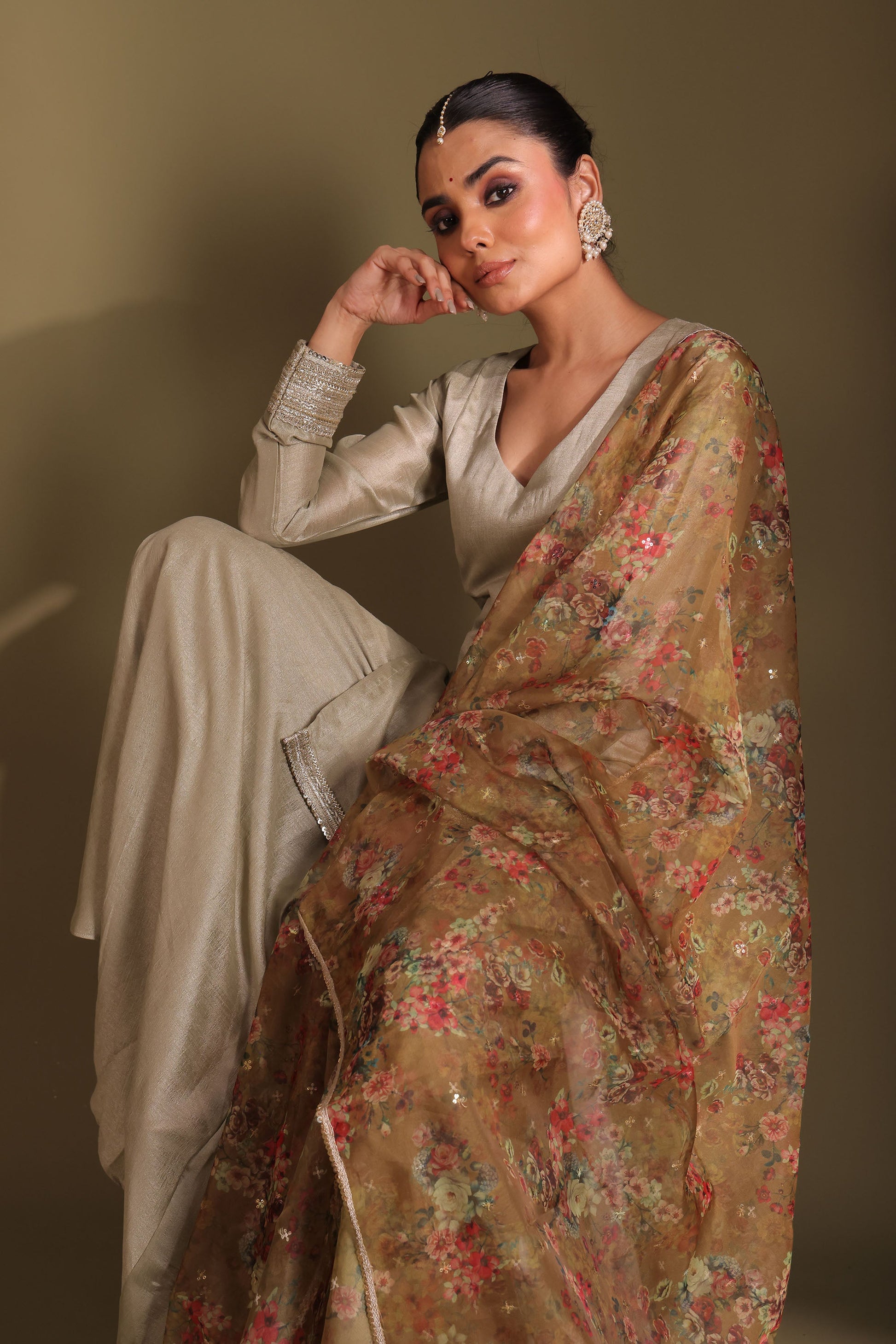 This set includes a Sage Kashmiri Silk Kurta with Full-Length Sleeves and Two Dupatta Options.