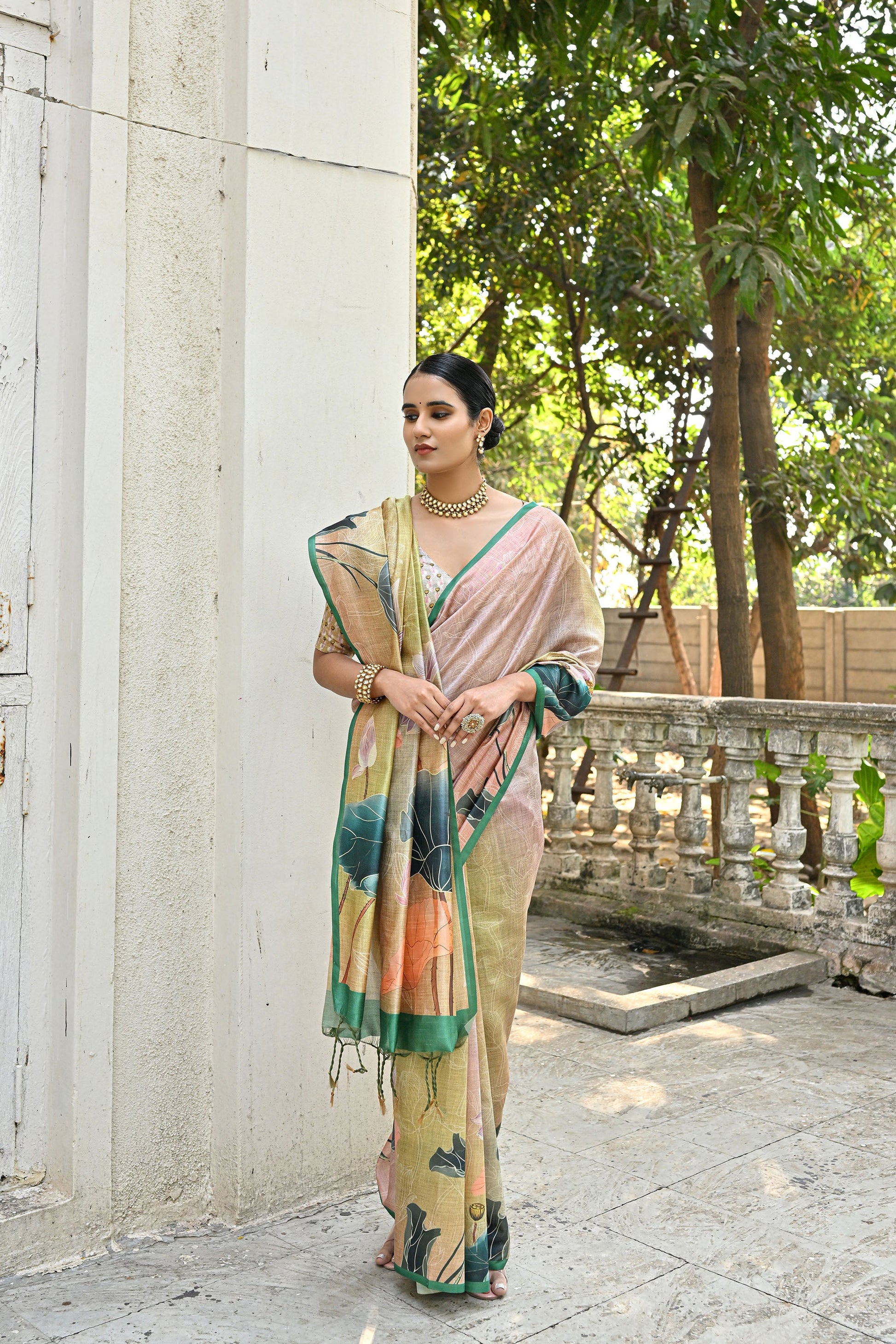 Jiyani Flower Mahendi Cotton Silk Floral printed Saree