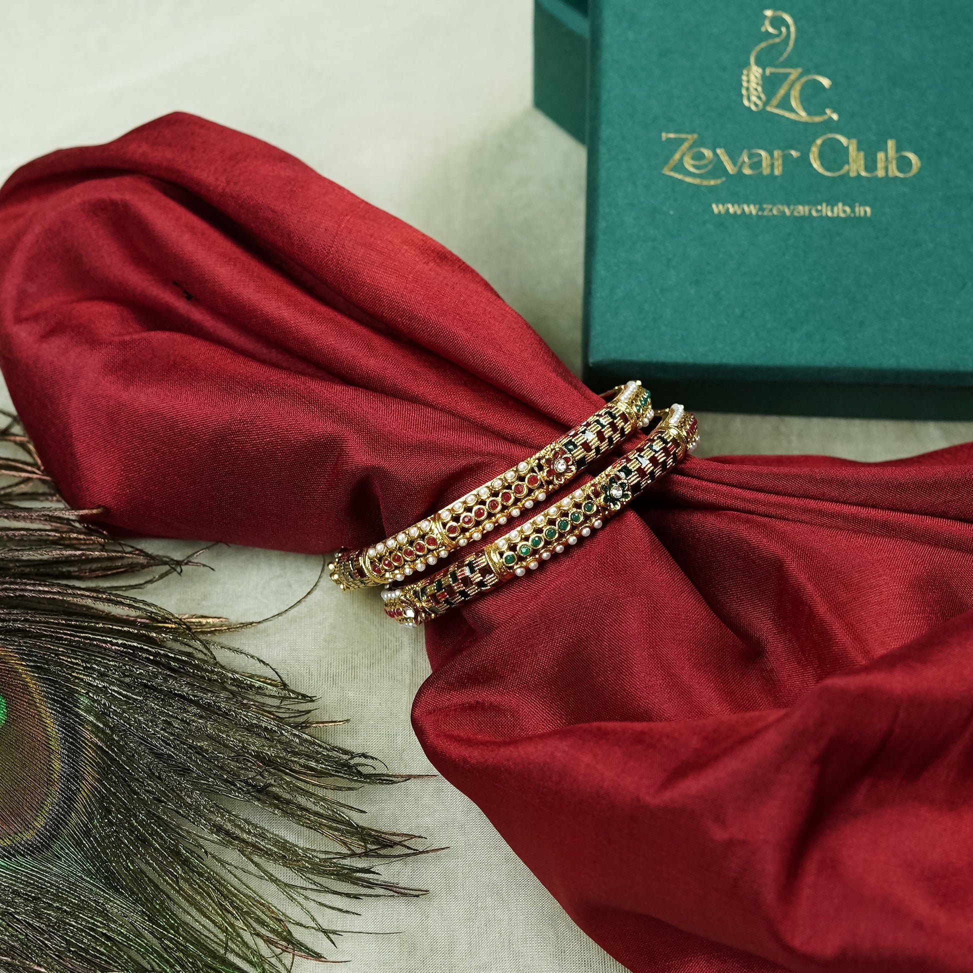 The Kanaka Multi-colour Gold Bangles from Zevar Club are a true celebration of vibrancy and elegance. Crafted from high-quality gold, these bangles feature a stunning mix of multi-coloured accents that add a bold pop of colour to any outfit. The intricate design and luxurious finish make them perfect for both festive occasions and everyday wear.