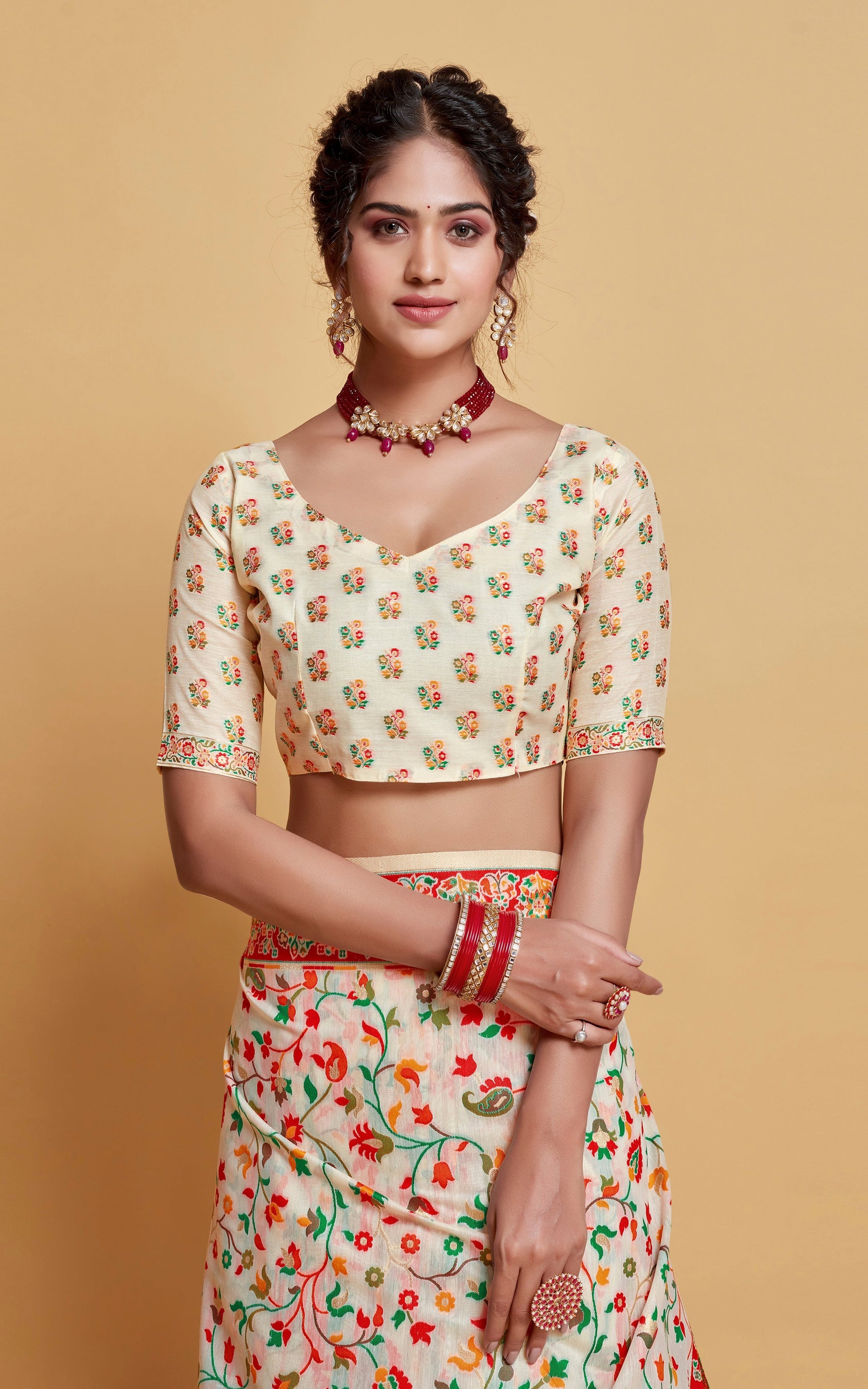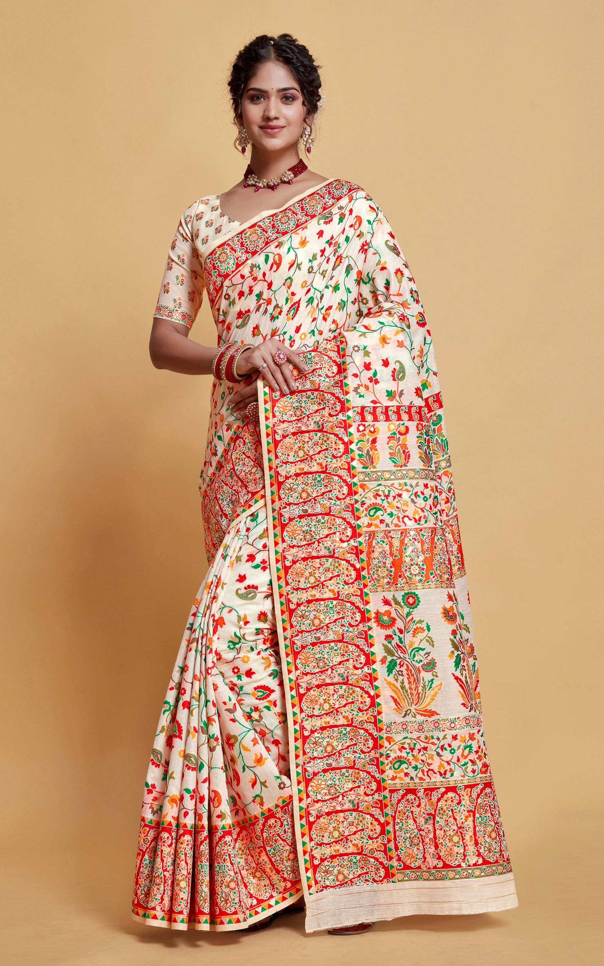 Expertly crafted in Kashmir using traditional handloom techniques, this stunning modal silk saree features intricate Kani weaving in a white, red, and multicolored palette. Experience the luxurious softness and vibrant beauty of this one-of-a-kind piece, perfect for any special occasion.