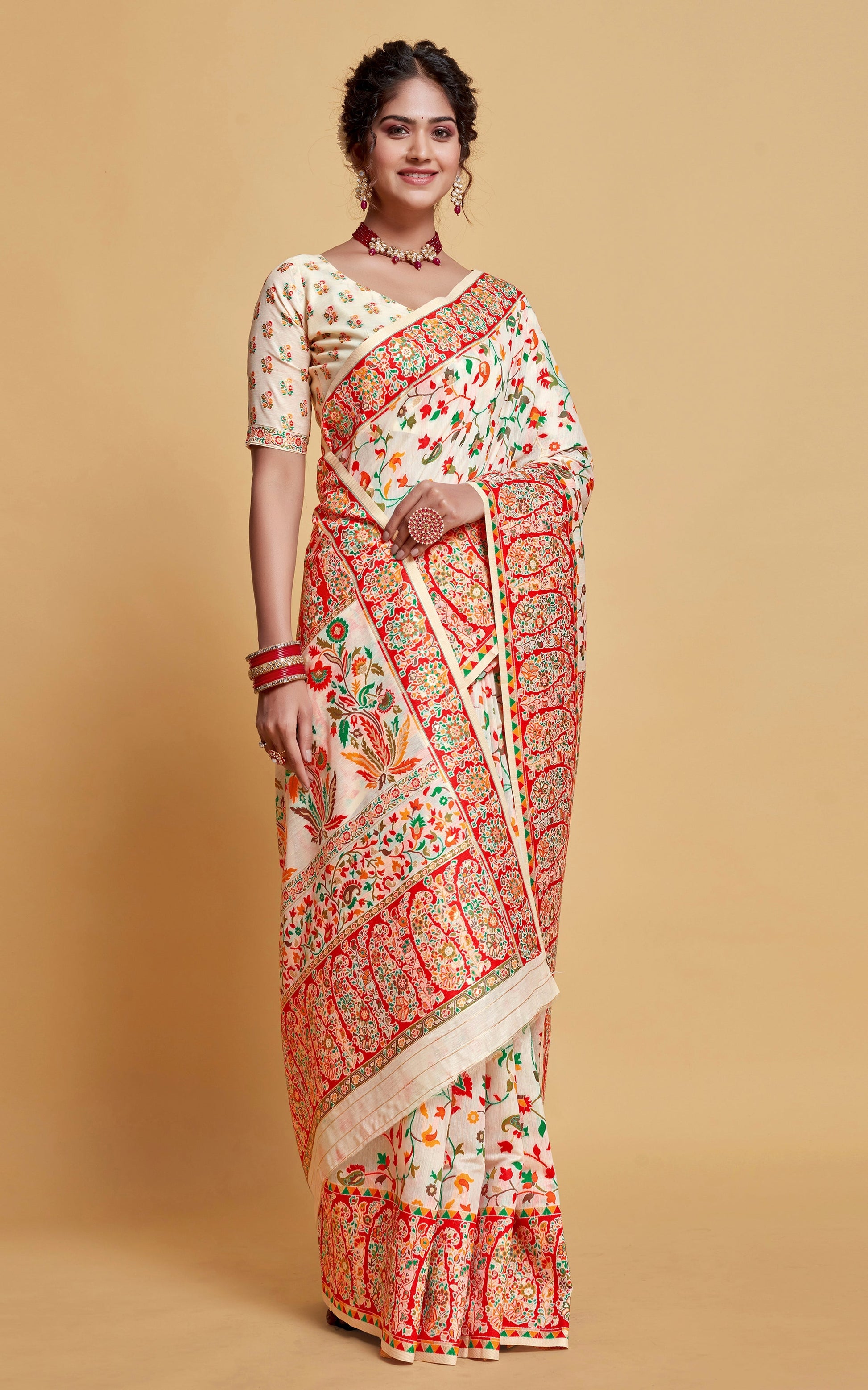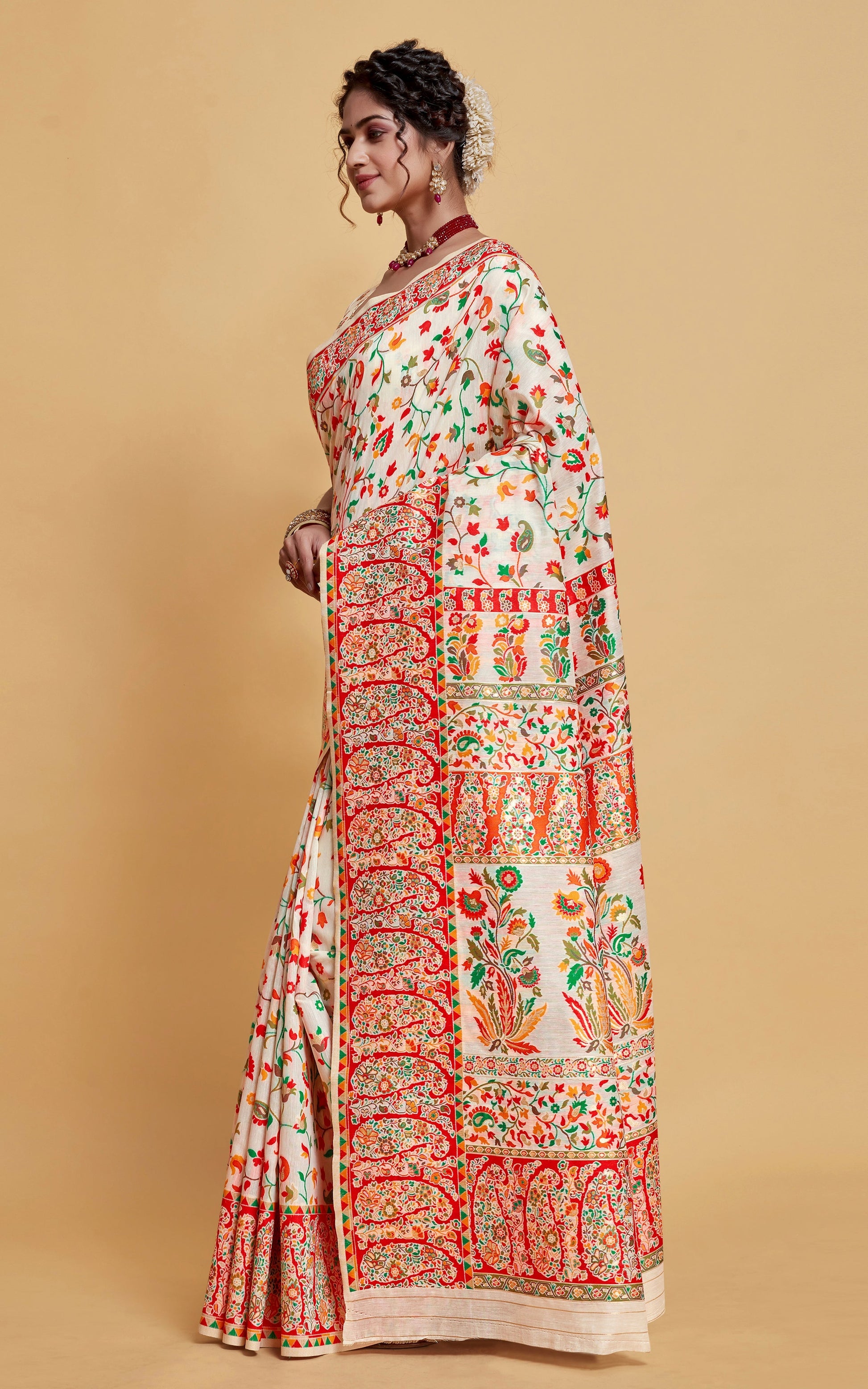 Kashmiri Handloom Modal Silk Woven Kani Saree In White, Red and Multicolored