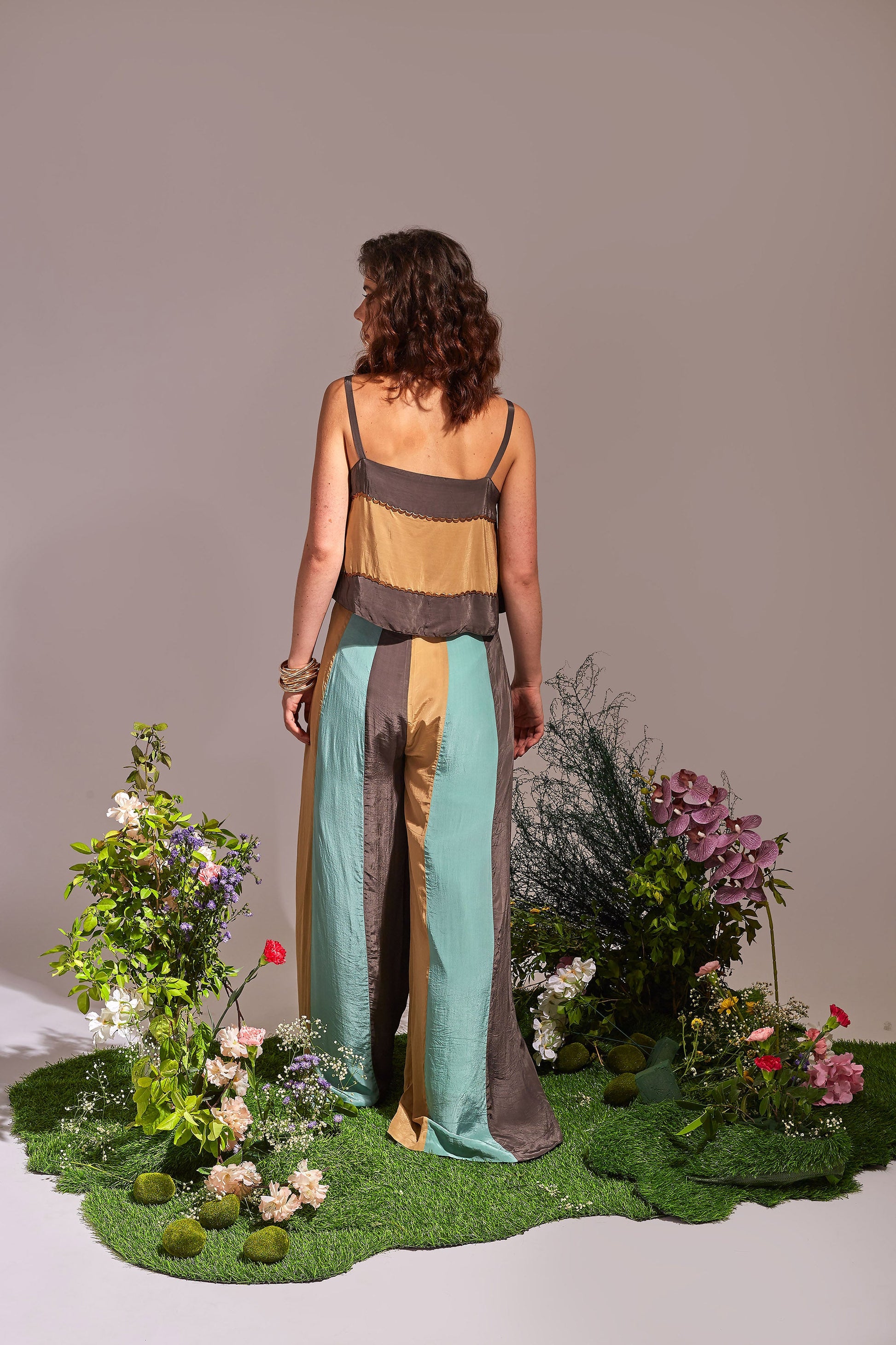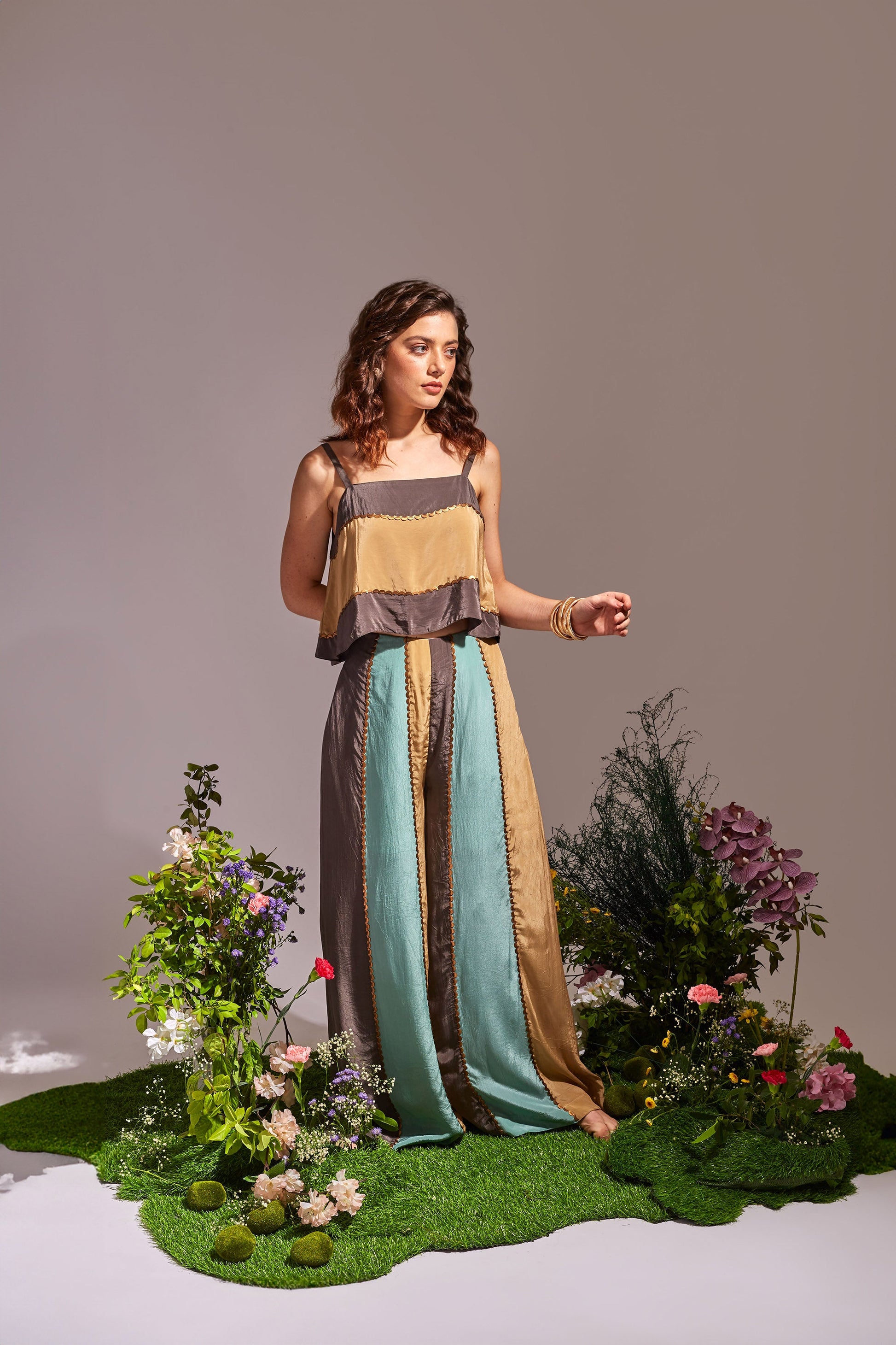 Elevate your festive look with our captivating color block co-ord set, designed for your special occasions. The strappy relaxed top is adorned with exquisite moon embellishments, adding a touch of celestial charm. Paired harmoniously with flared pants featuring accentuated kalis with moon detailing.