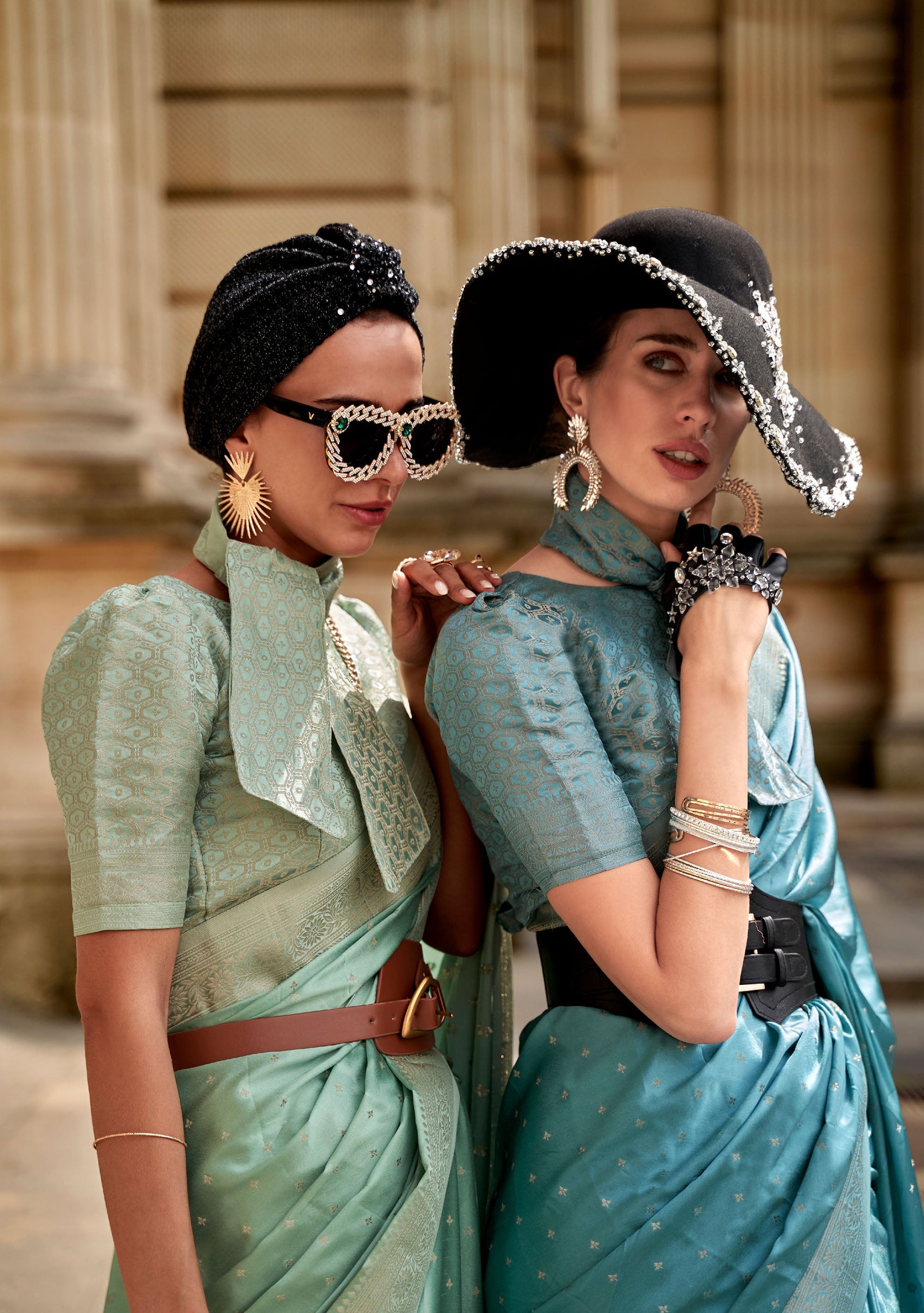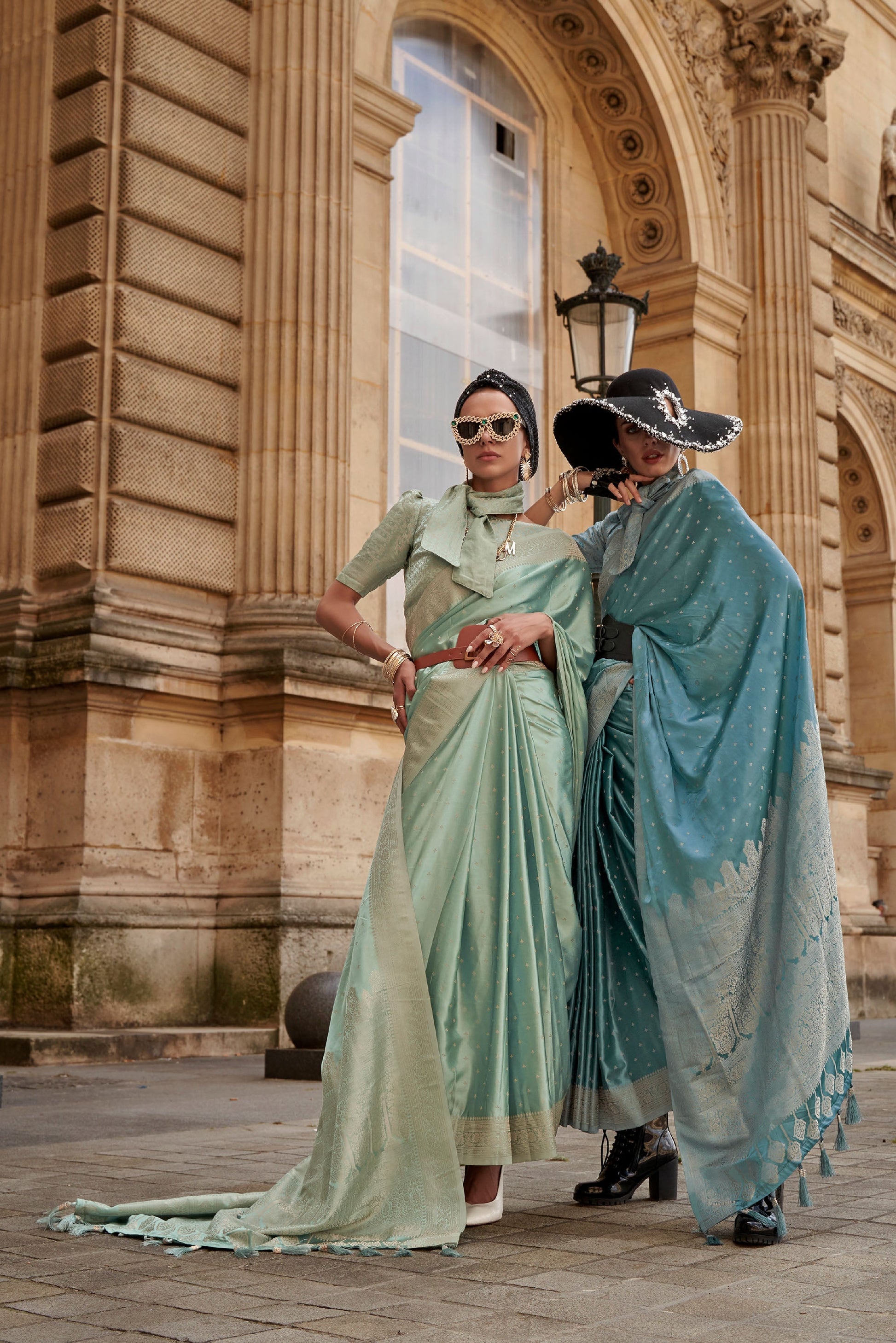 Light Green Kamzah Silk Pure Satin Nylon Handloom saree