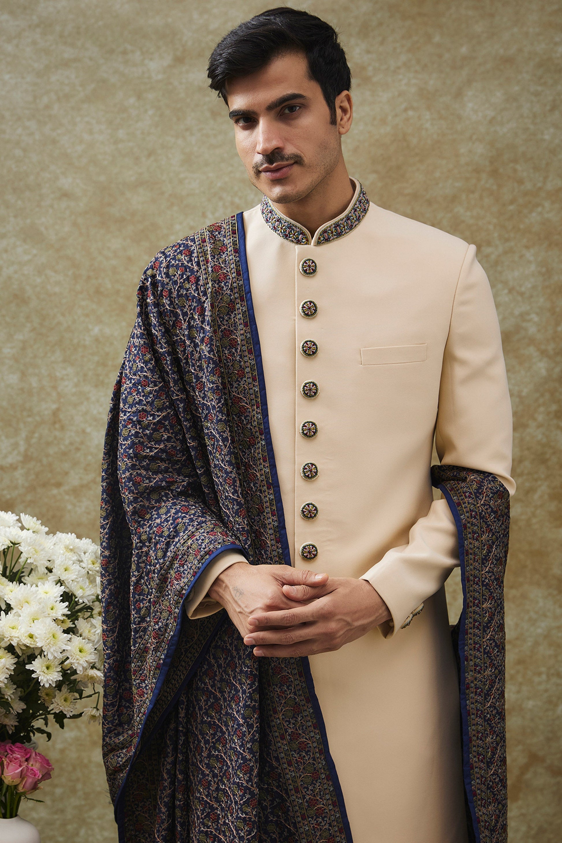 Light Pink Nawabi Indo western set in imported Italian Fabric with Hand and thread work on collar and Neck