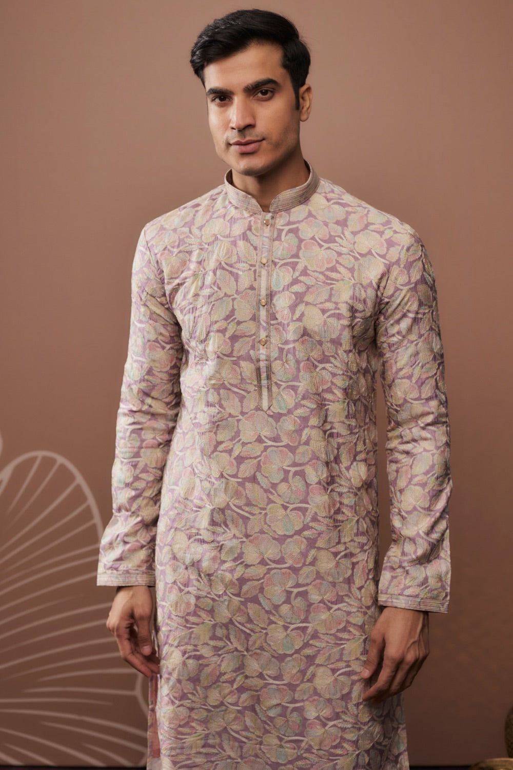 Enhance your style with our Lilac Silk Kurta Set, featuring unique position prints and elegant dori work. This stylish ensemble, paired with a matching Pajama, beautifully combines modern design with traditional craftsmanship.