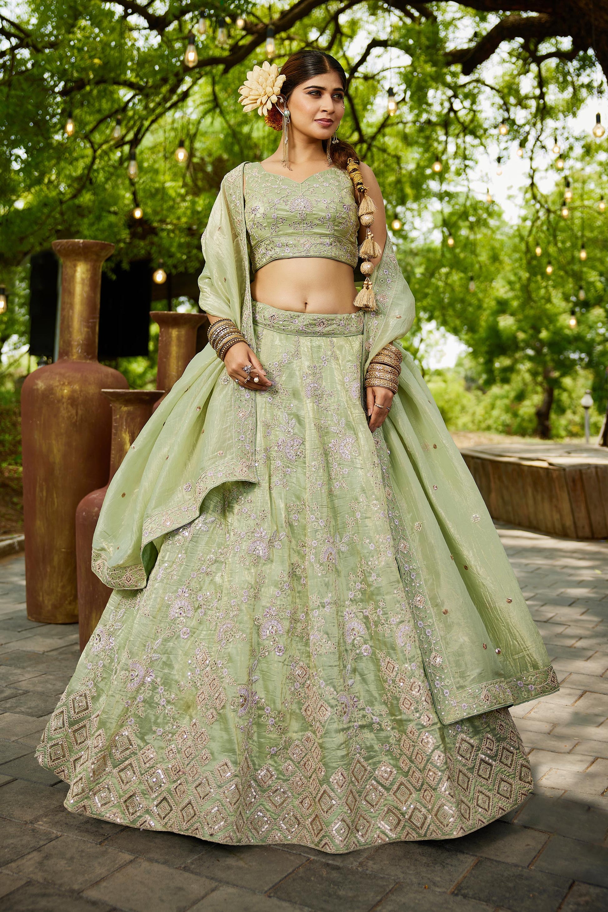 Lime Green colour Tissue Sequinse embroidery Lehenga choli & Dupatta