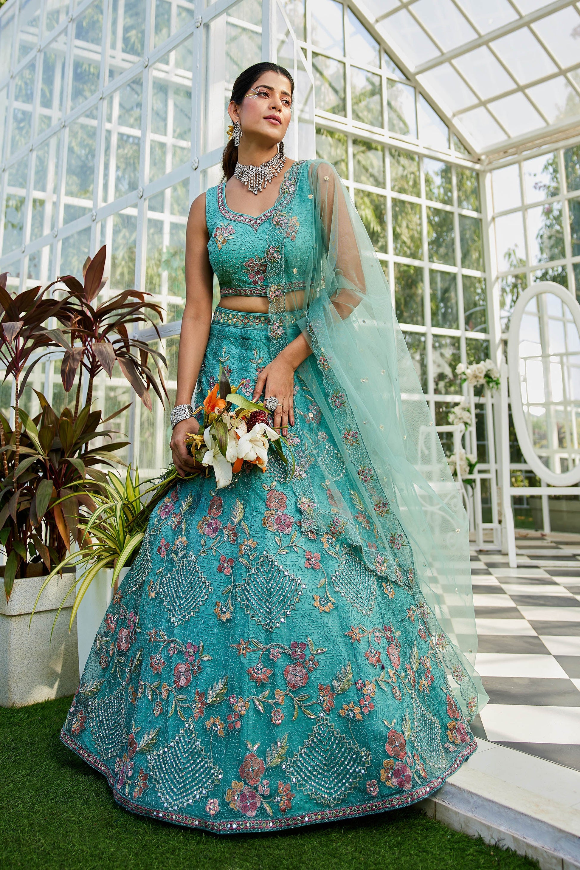 Lime Green net with Coding & Zarkan embroidery Lehenga choli & Dupatta