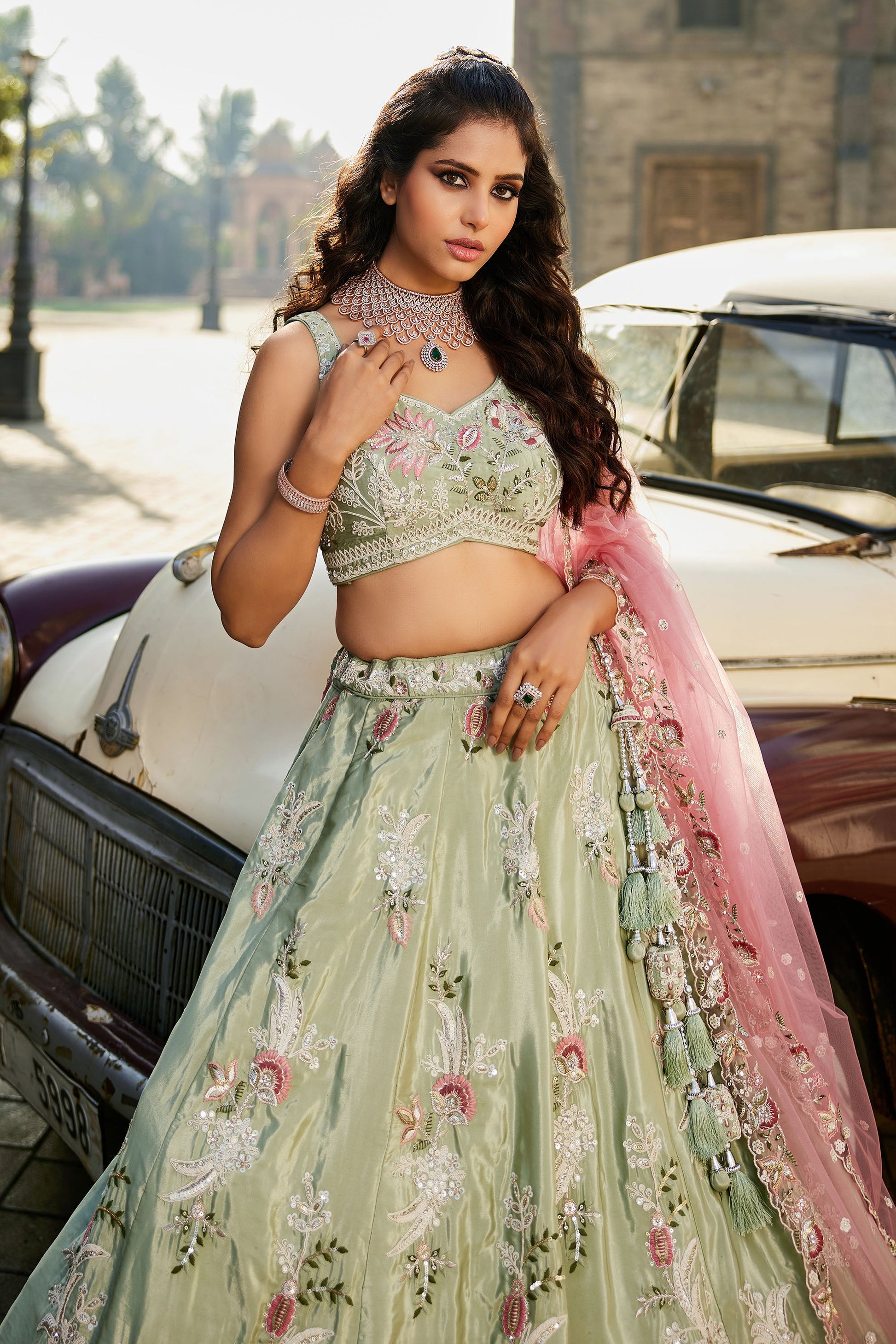 • Lehenga:- Made of premium quality Lime green Colour Pure Satin Silk fabric Full Flaire Lehenga With Sequins, moti, zarkan and Coding work has a thread Embroidery work. Has a thread work border on the hemline.