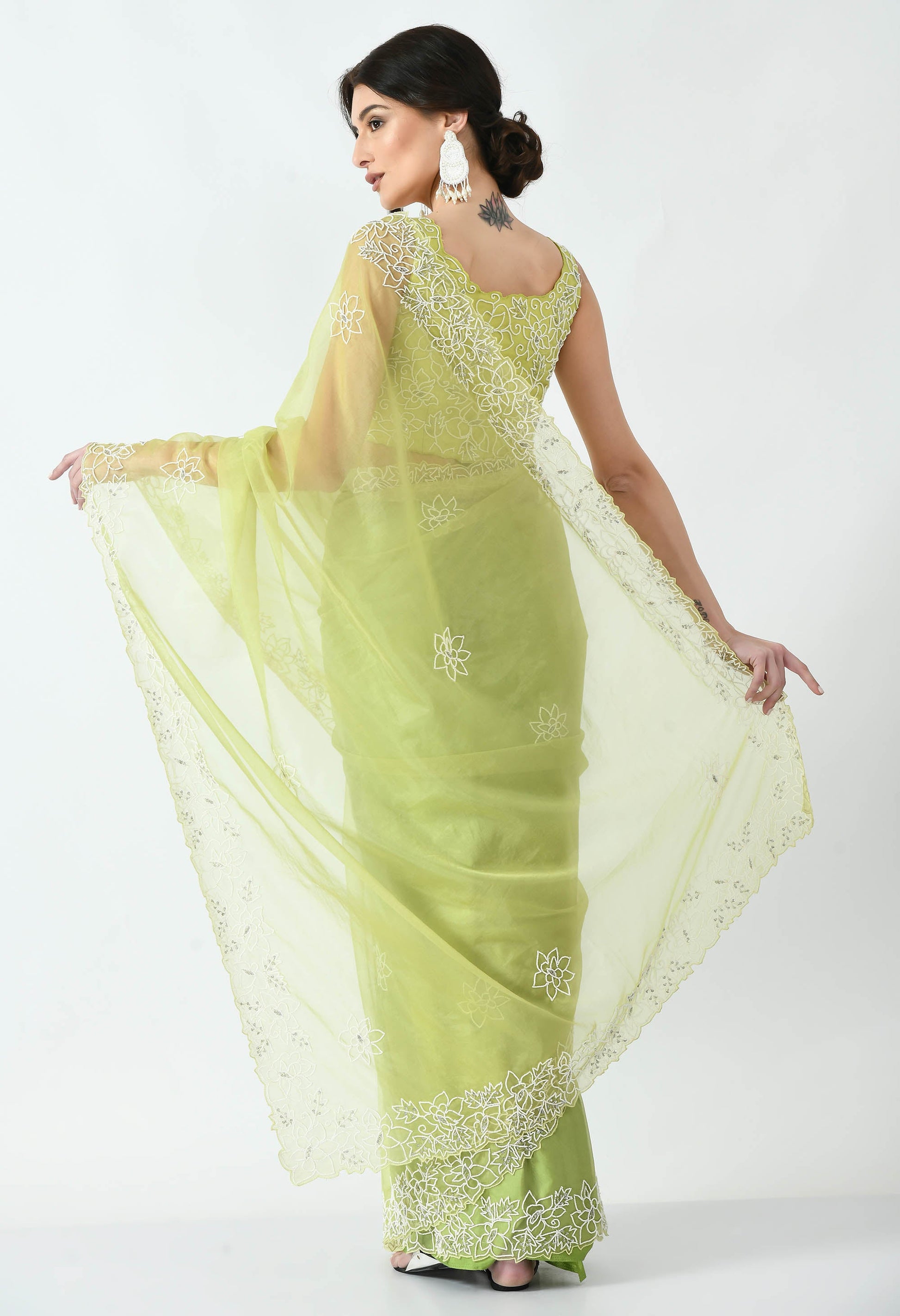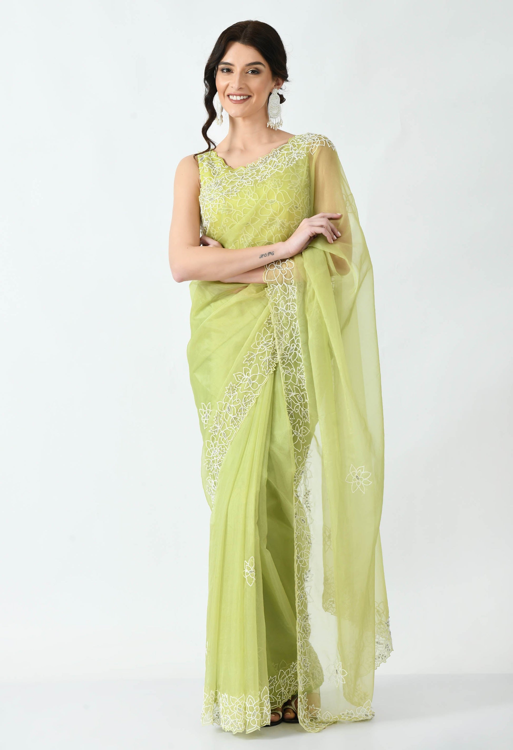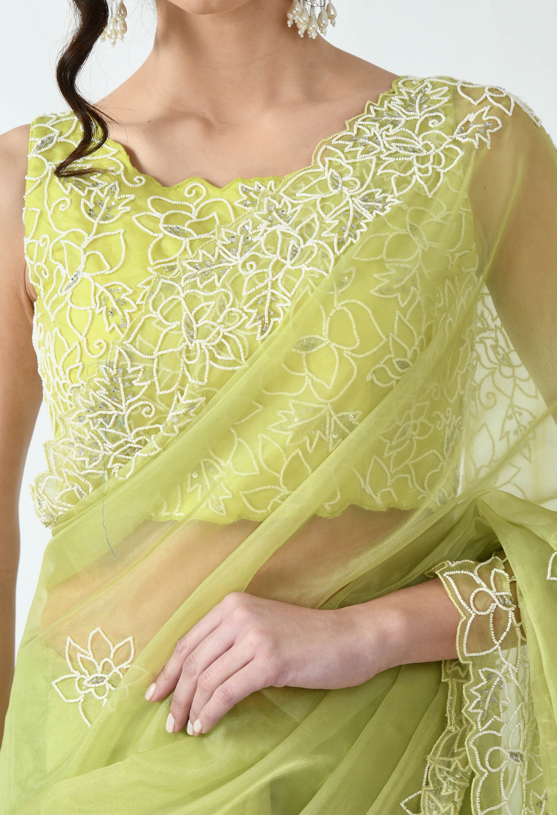 Gorgeous Lime Hand embroidered Organza Special Designer Saree with hand embroidery work motifs. This is a saree that is tailor made efficiently with perfect exquisite detailing. Handmade to Embrace your special moments. Suitable for Parties , family gatherings and Weddings. Perfect for a Wedding Guest.