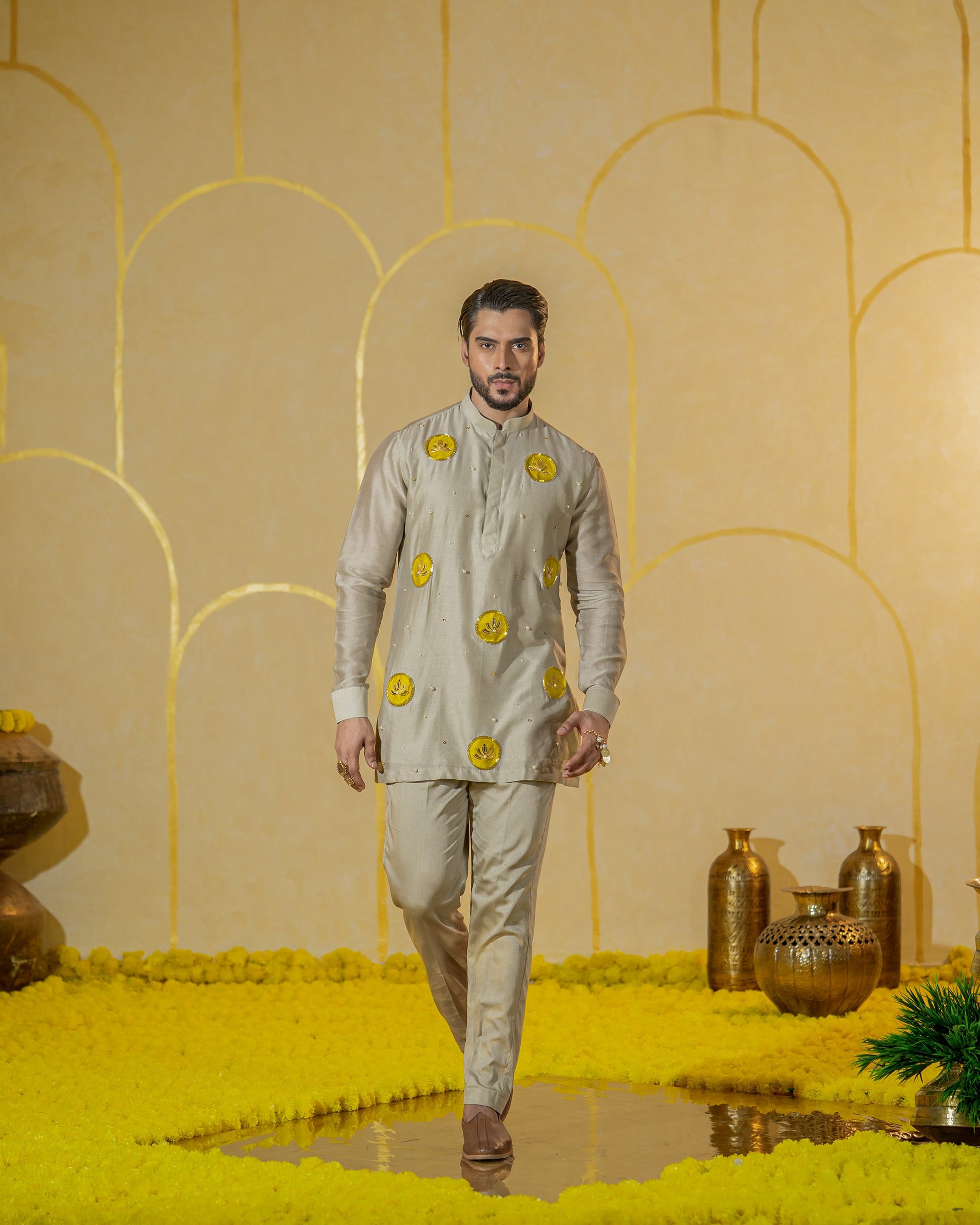 Every gathering has a certain rhythm, like the connections we form with our loved ones. This greenish grey kurta set embodies that rhythm with its applique circles, lotus motifs, and scattered pearls, making it perfect for festive occasions. Paired with monochrome vegan silk pant pajamas, this ensemble is a celebration of craftsmanship and connection, making it an ideal choice for festive occasions where every detail matters.