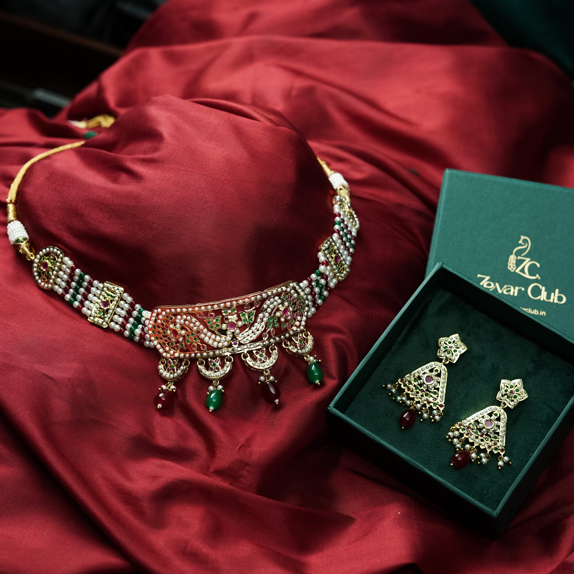 Embrace the essence of regal beauty with the Maitreyi Raga Polki Set by Zevar Club. This exquisite jewellery set features a stunning combination of uncut Polki stones, masterfully arranged to create a captivating symphony of light and elegance. The design draws inspiration from traditional motifs, with a modern twist that makes it perfect for the contemporary bride or any woman who seeks timeless sophistication.