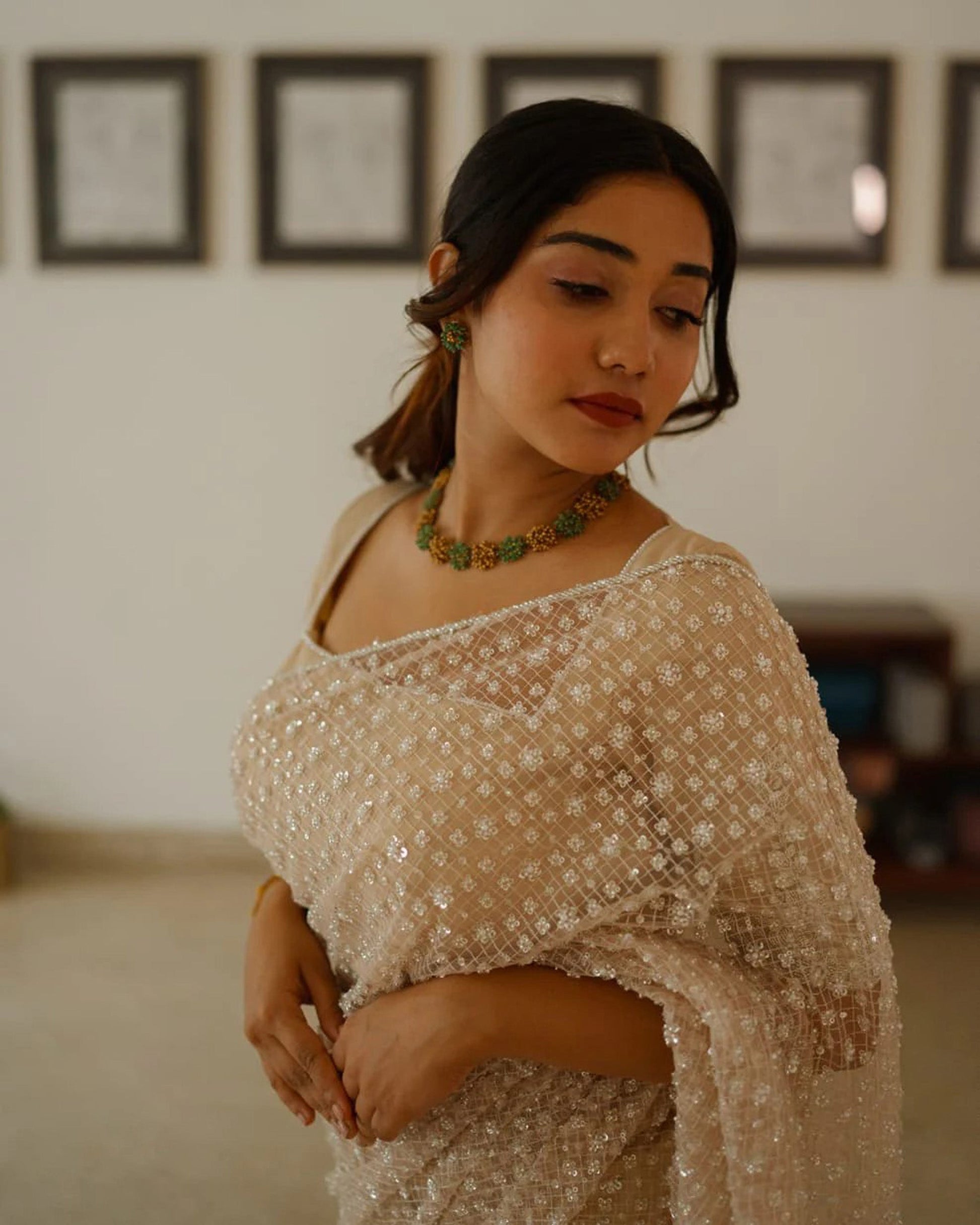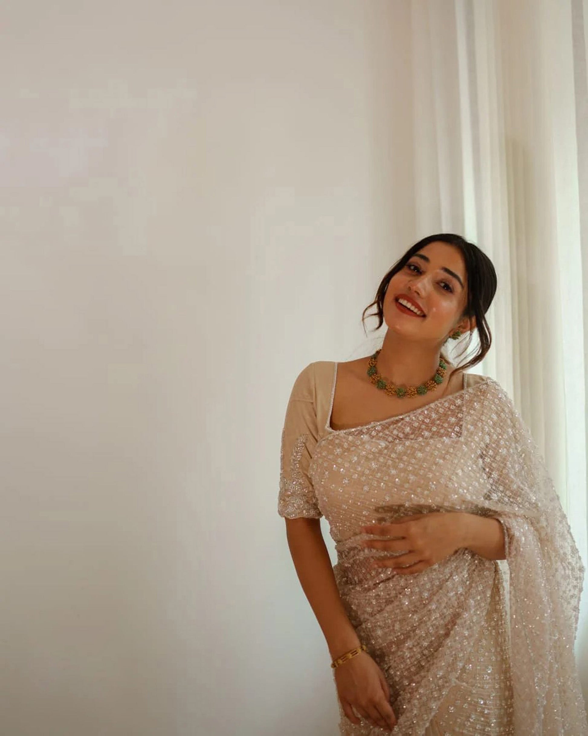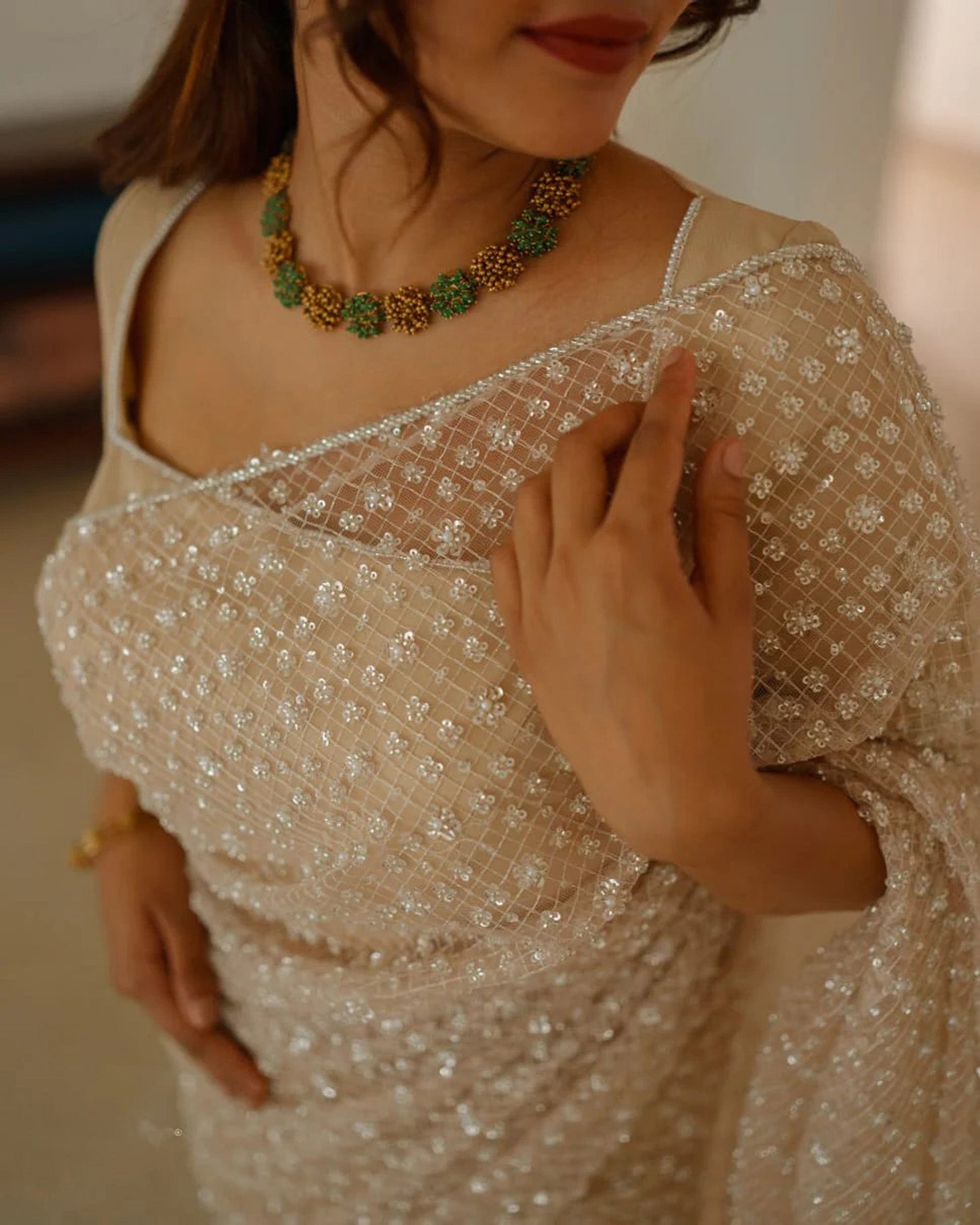 A vision of elegance and draped in majestic beige, rose, and nude net saree with intricate beaded work that shines brightly, Our bride with a true masterpiece, a work of art that will be etched in our hearts