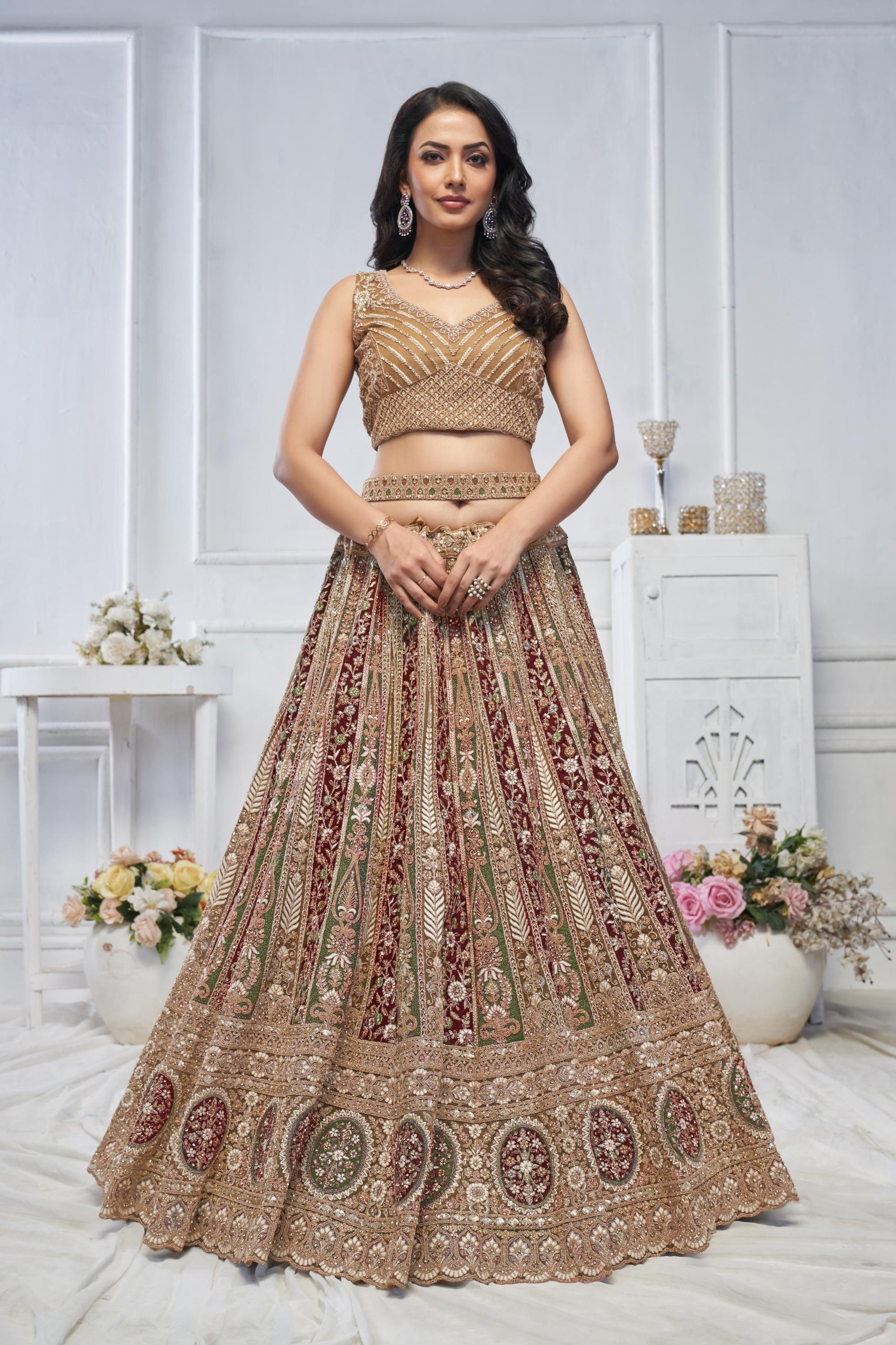Majestic Brown lehenga is adorned with an alluring mix of paisley, floral, and leaf patterns throughout its flowing skirt, intricately embellished with Zari, and thread work . It is paired with a V-neckline blouse that adds a touch of elegance and an embellished waist belt with square-trimmed latkans. The ensemble is completed with a delicate net dupatta, featuring embroidered floral buta motifs and a beautifully embroidered border. For styling, accessorize with gold or pearl drop earrings and a sleek, low bun to accentuate the neckline and detailed embroidery, perfect for a festive or wedding occasion.