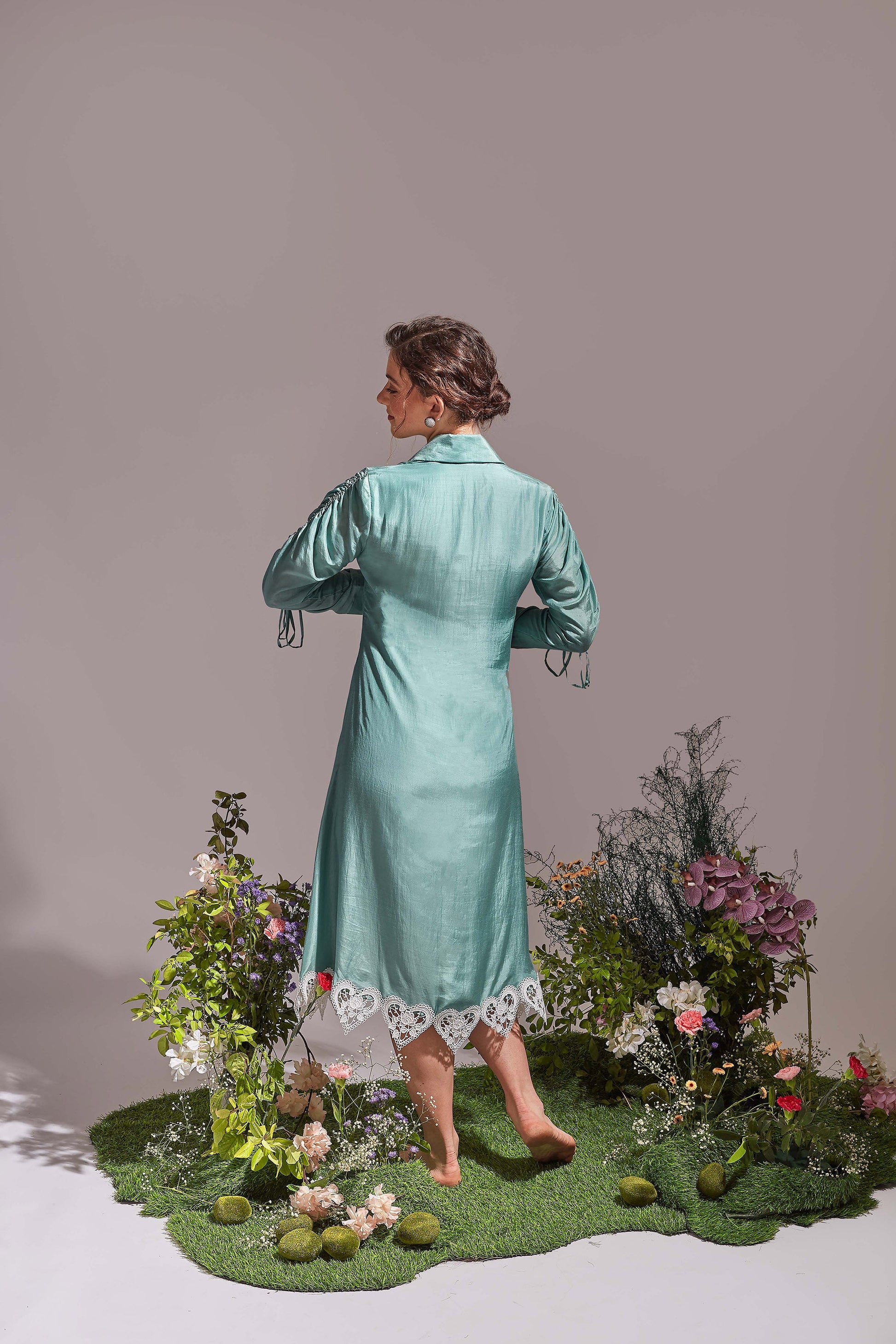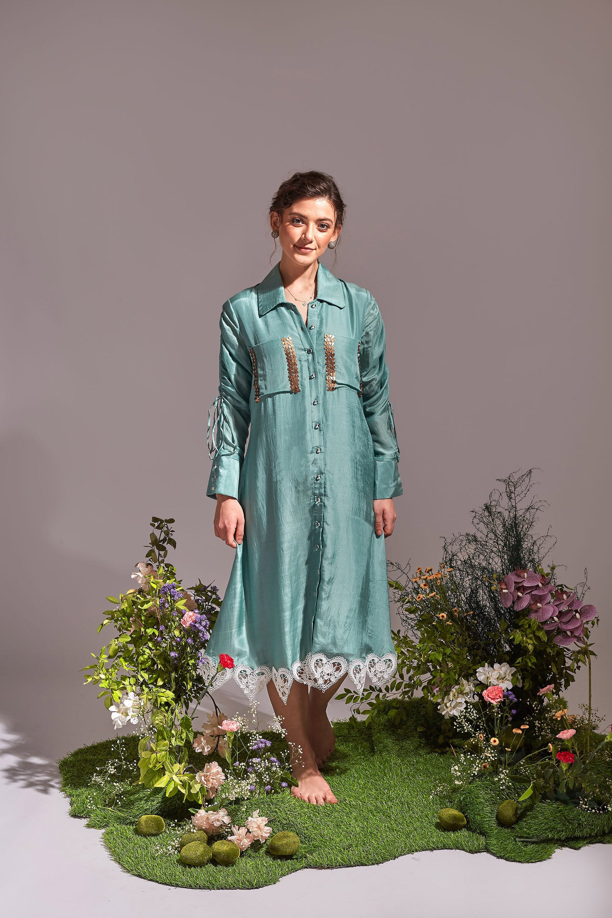 Elevate your style with our relaxed fit shirt dress comes with ruched sleeves detailing and lace accentuate hem.the droplet button closures add a touch of elegance, making it a must have addition to your wardrobe.