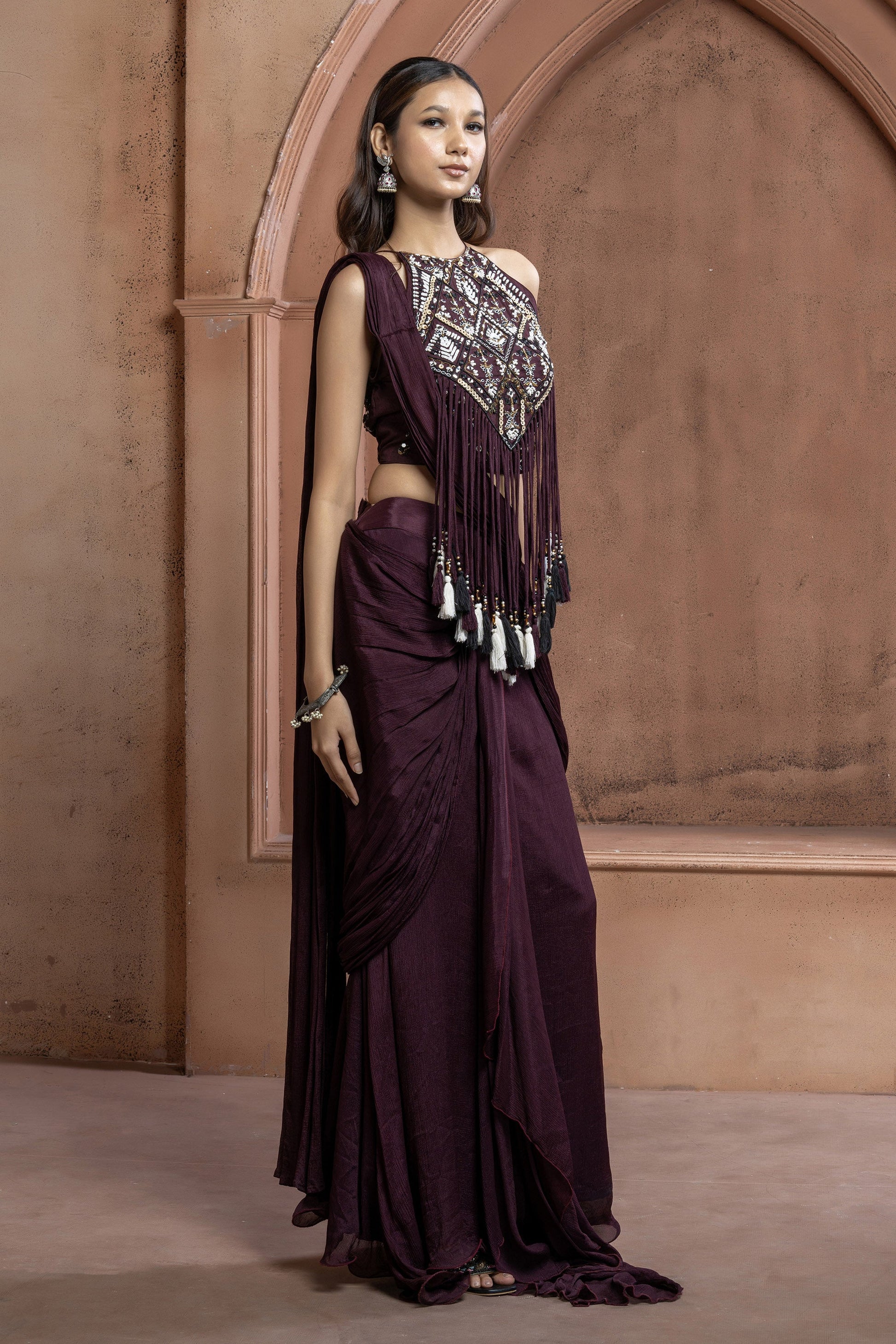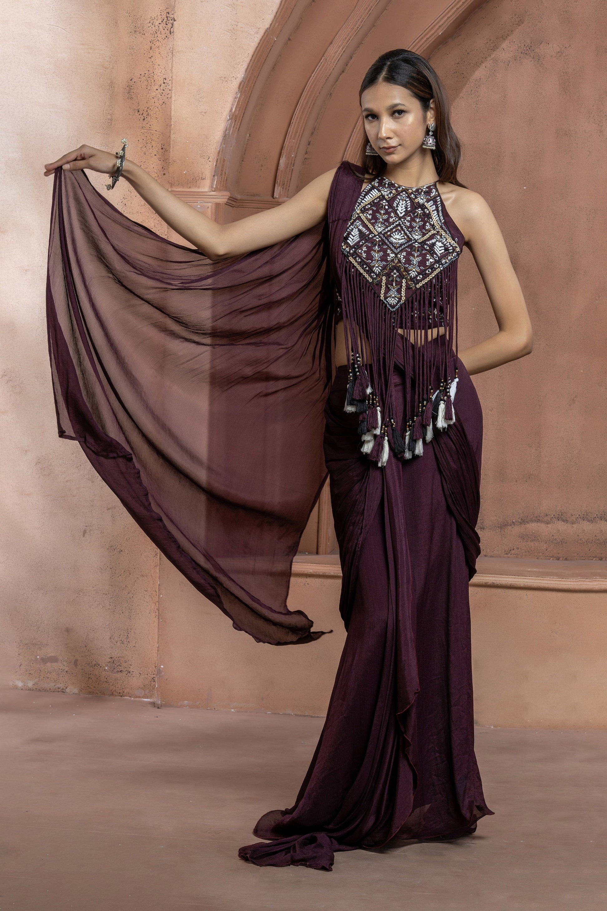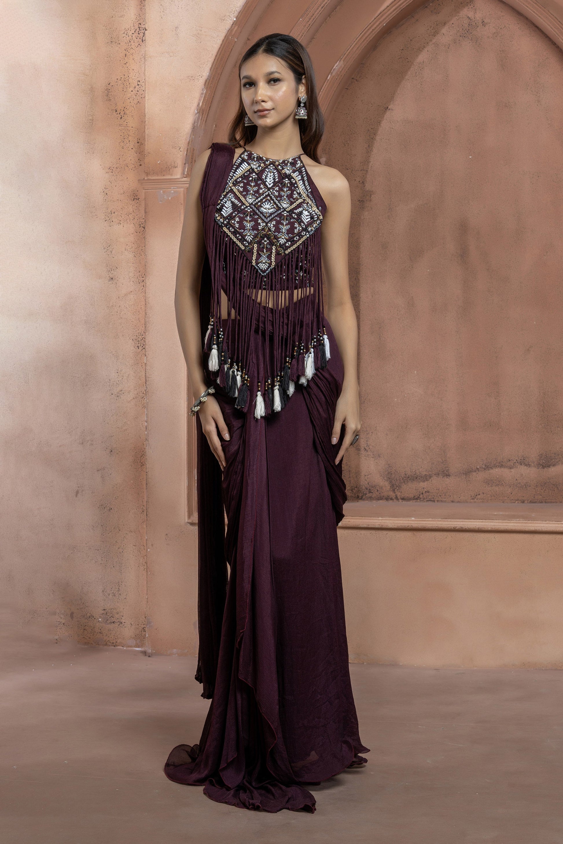 Maroon Chinnon Geometric mirror work Fringe Saree