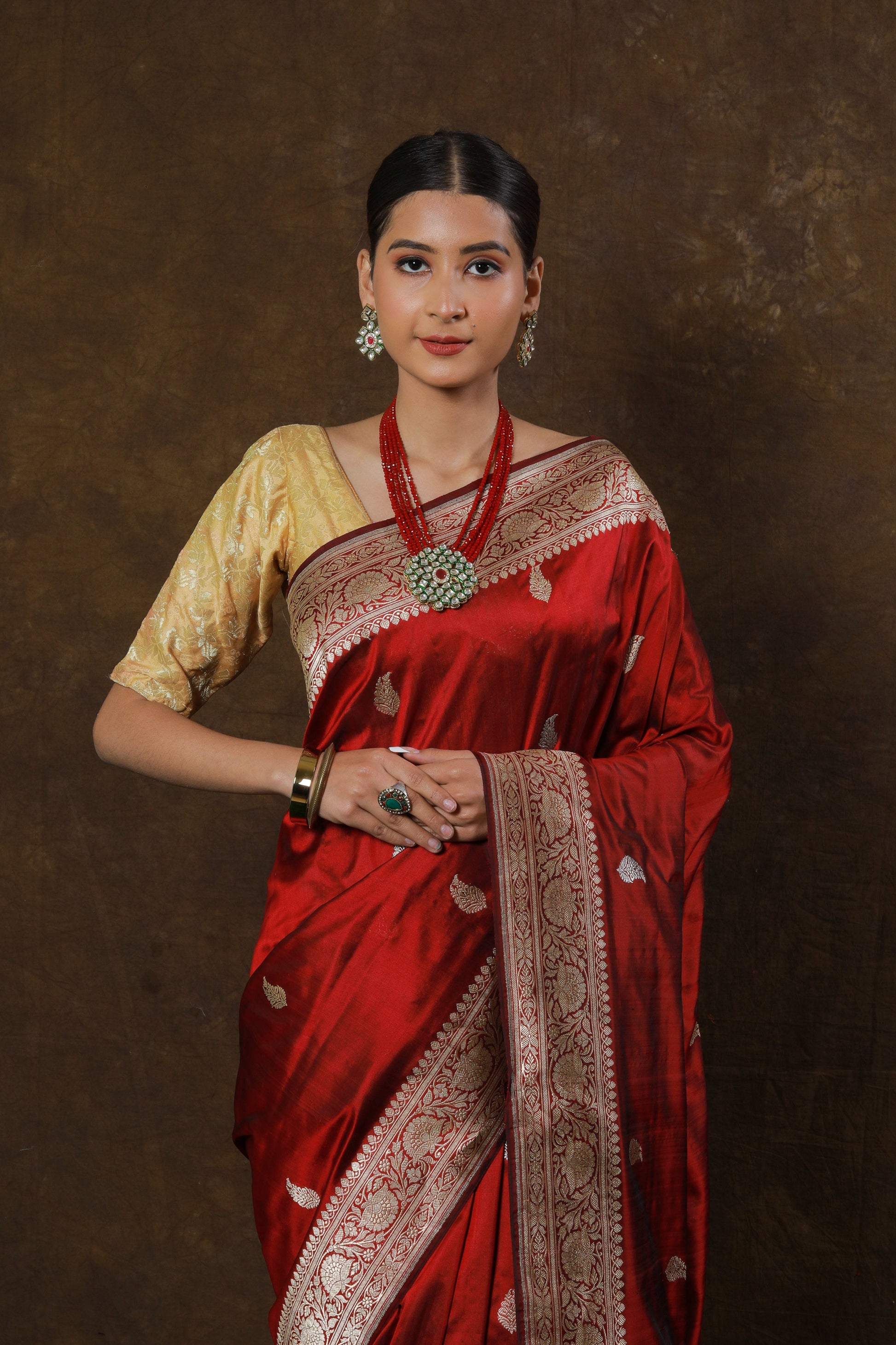 Product Description: The Maroon Handwoven Kadwa Katan Silk Saree is a testament to the timeless traditions of Banaras. It features a charming paisley booti in gold zari, accentuated by a border and aachal. This saree embodies the artistry of handloom Banarasi weaving and is a symbol of elegant and sustainable fashion.