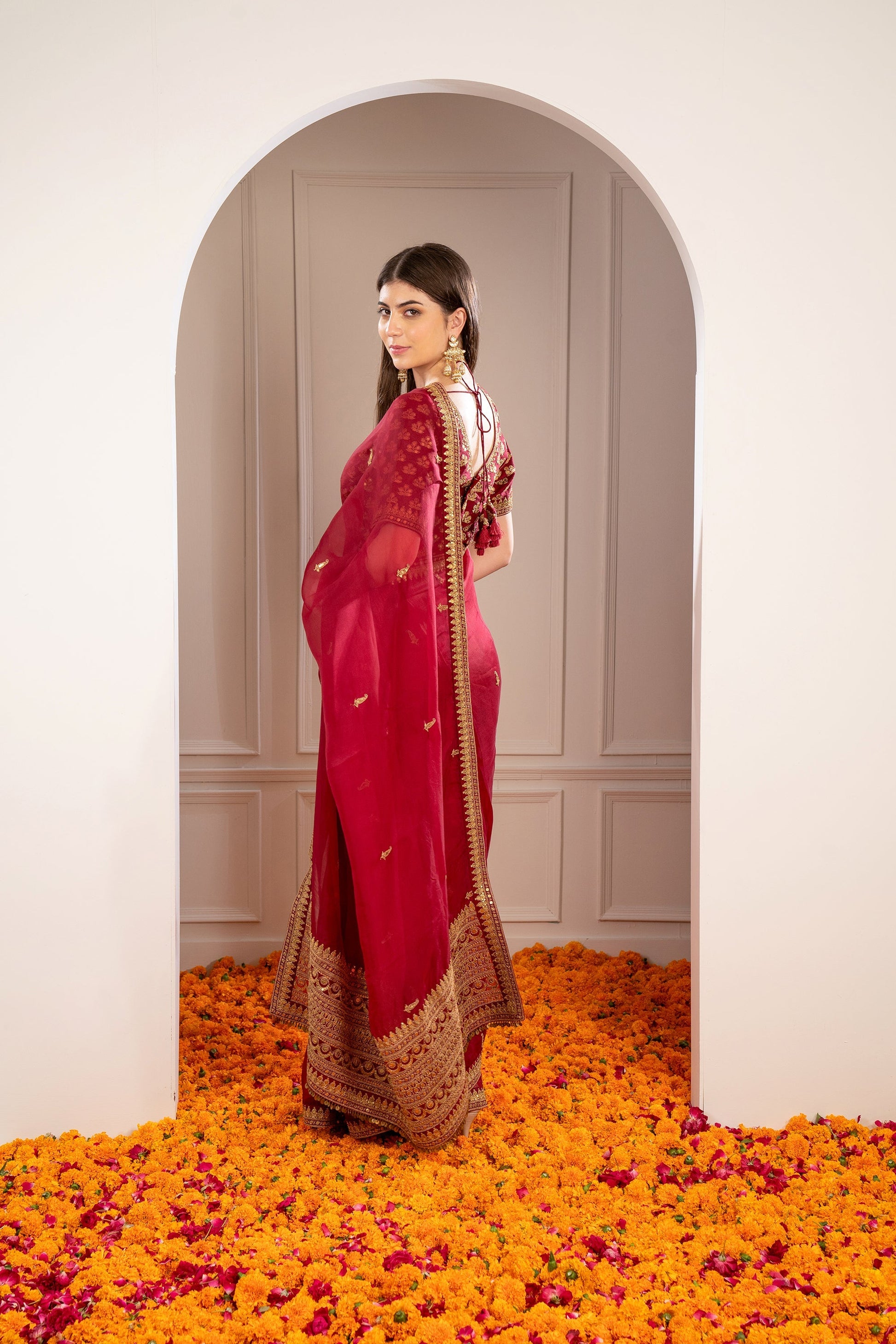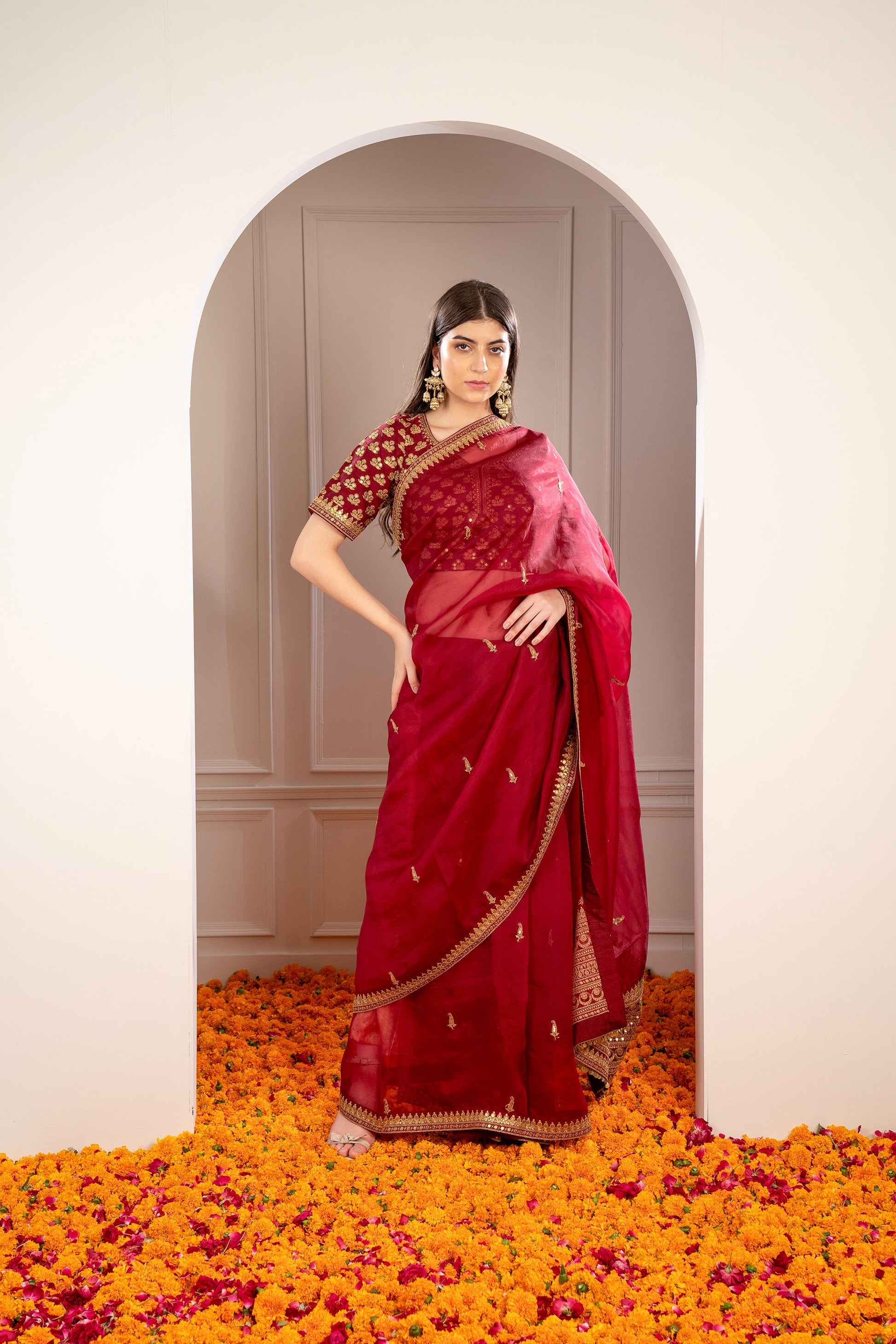 Pine green semi silk saree with pita work and sequins. 2) Paired with matching padded blouse.