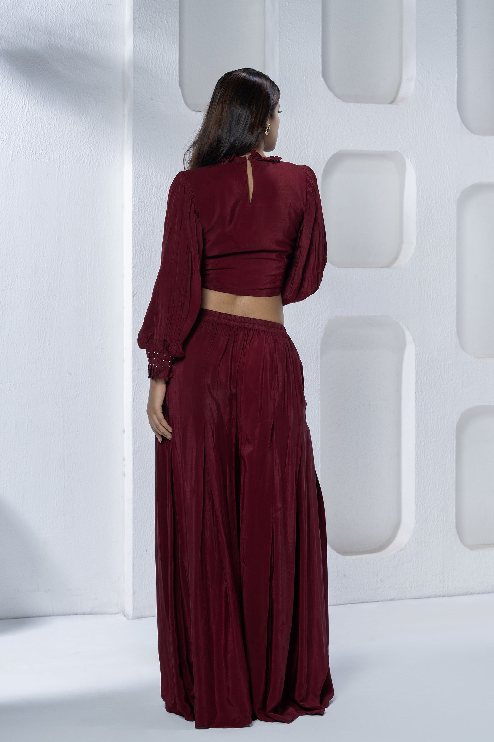Maroon Pleated Croptop and Palazzo Pant Set