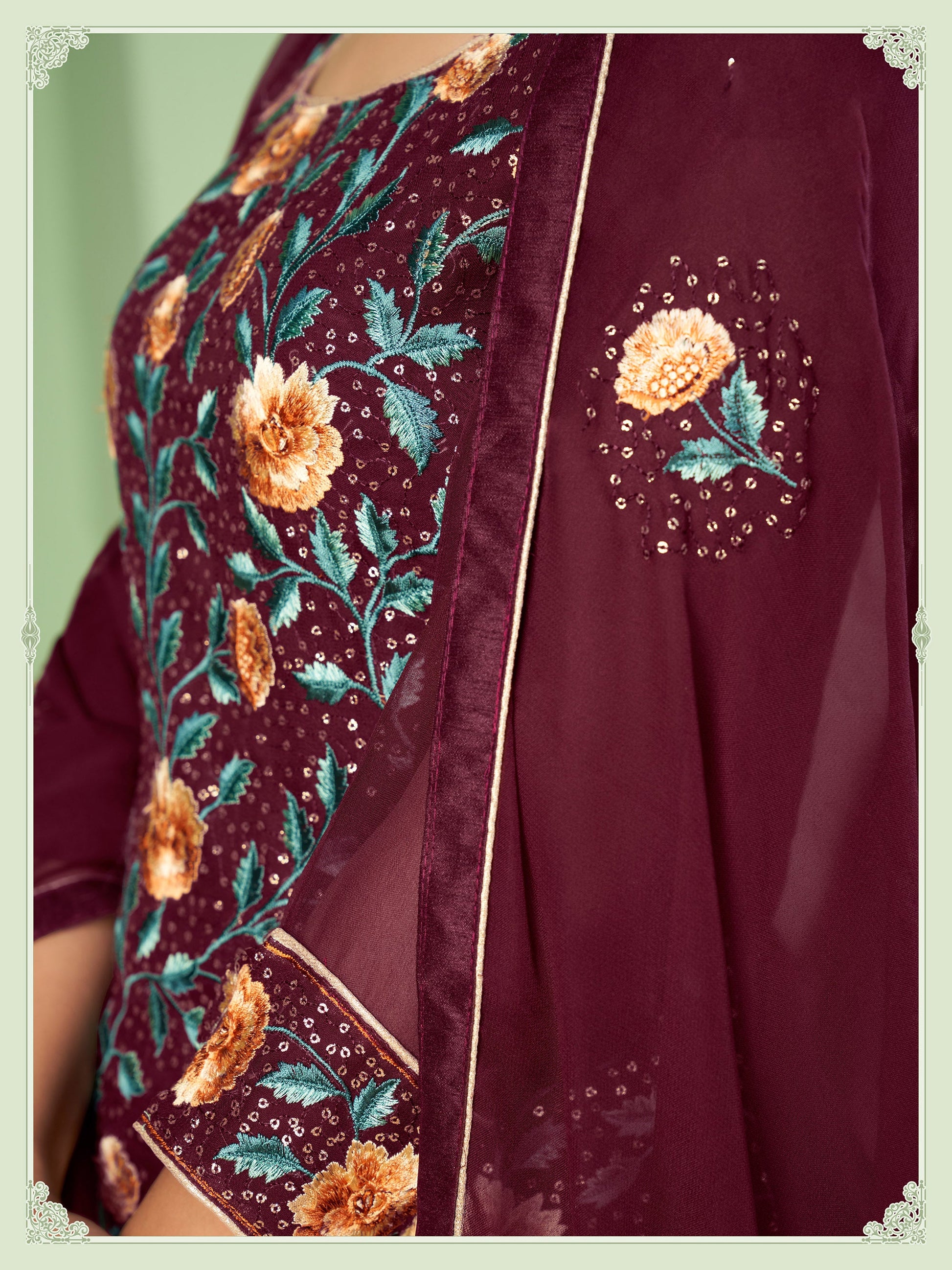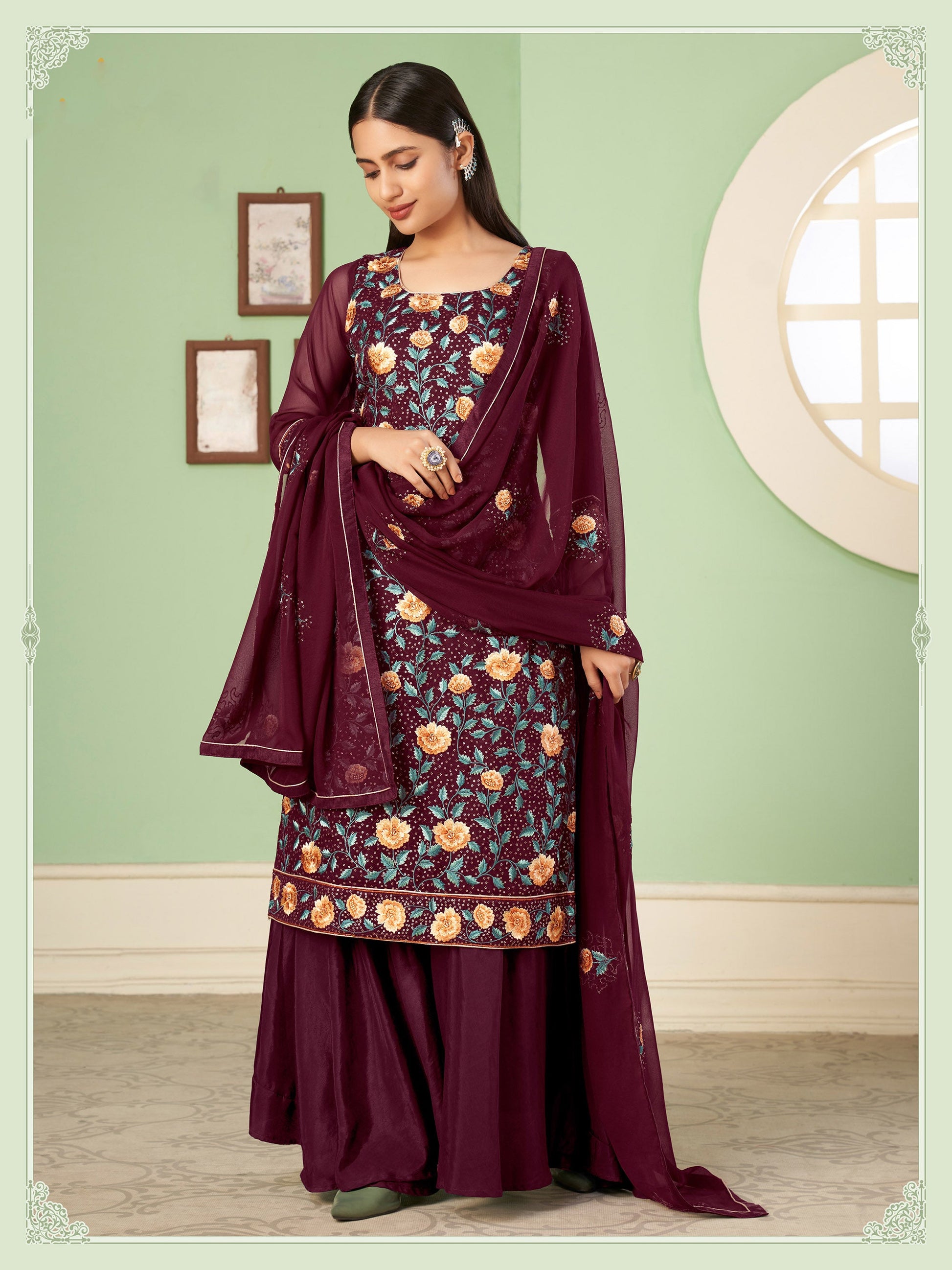 Maroon Thread Embroidered Straight Cut Sangeet Sharara