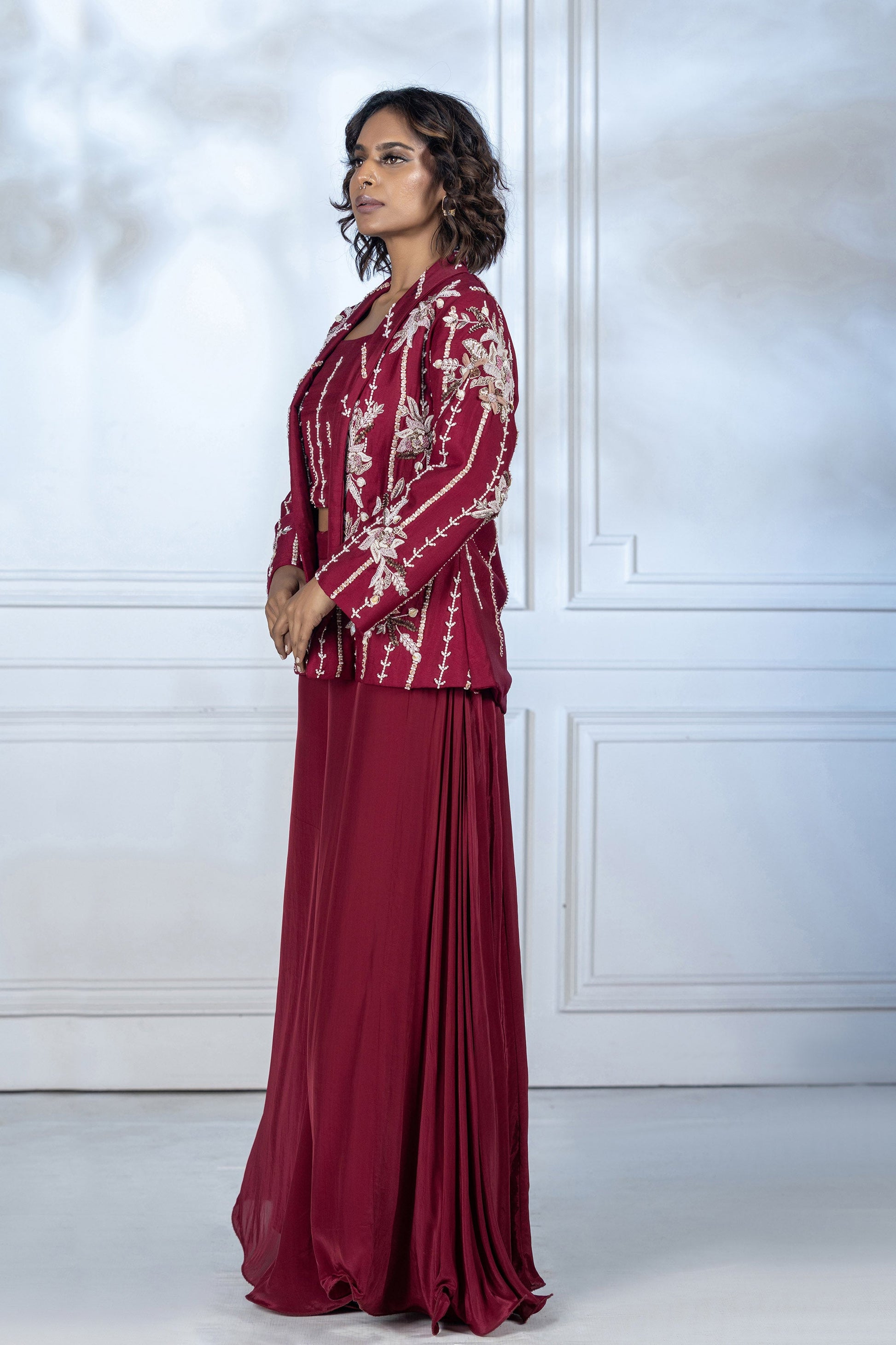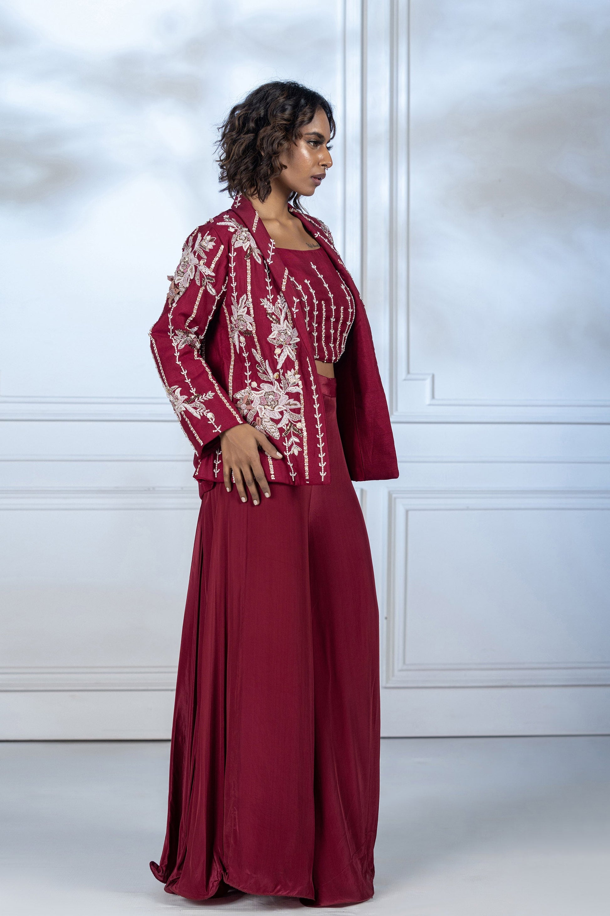 Maroon Upada Silk Embroidered Applique 3 Piece Set