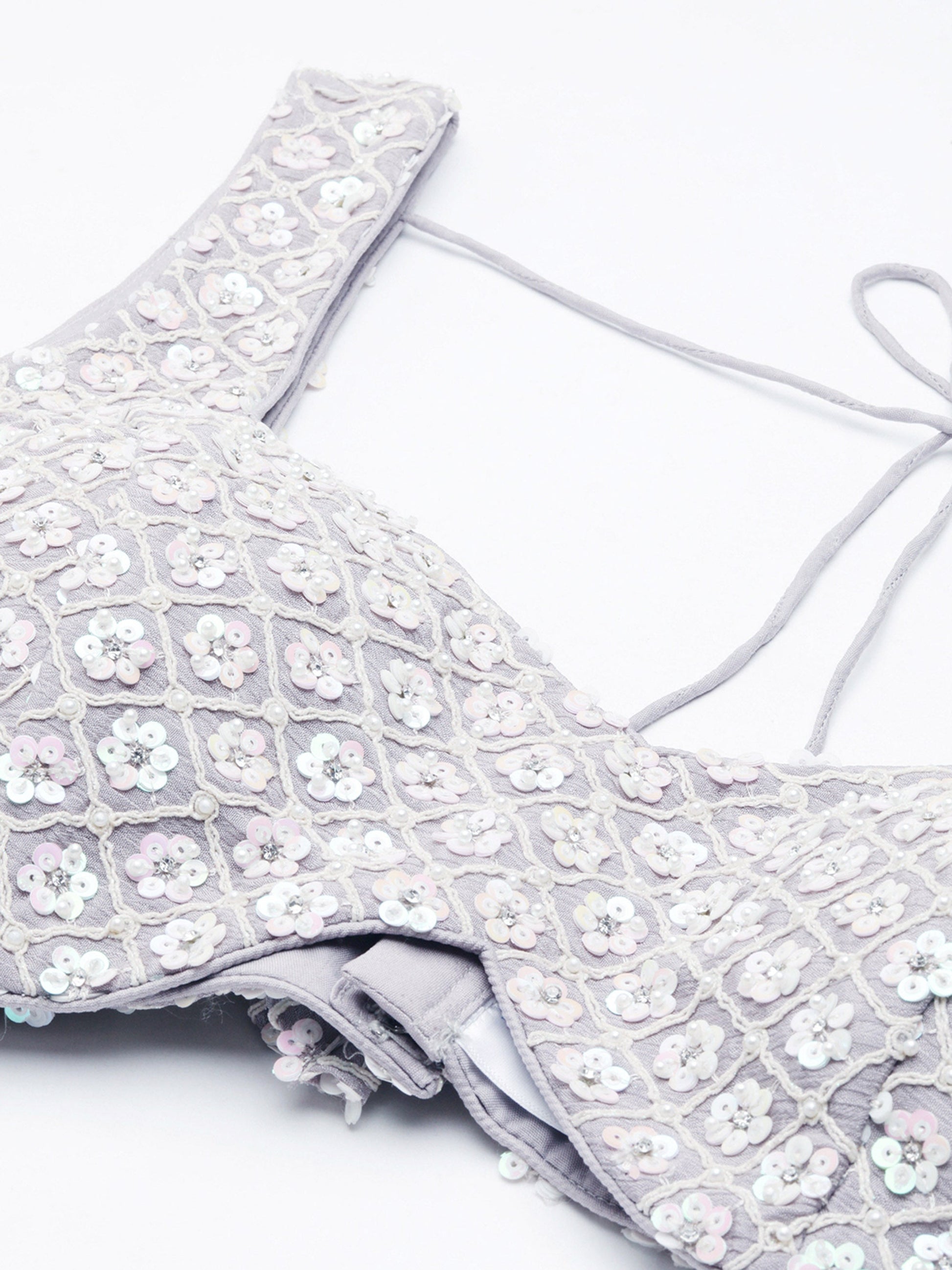 • Blouse:- Mauve Chinon all over material With Heavy Sequins, Moti, Zarkan and thread Embroidery work. Has a shantoon inner attached.