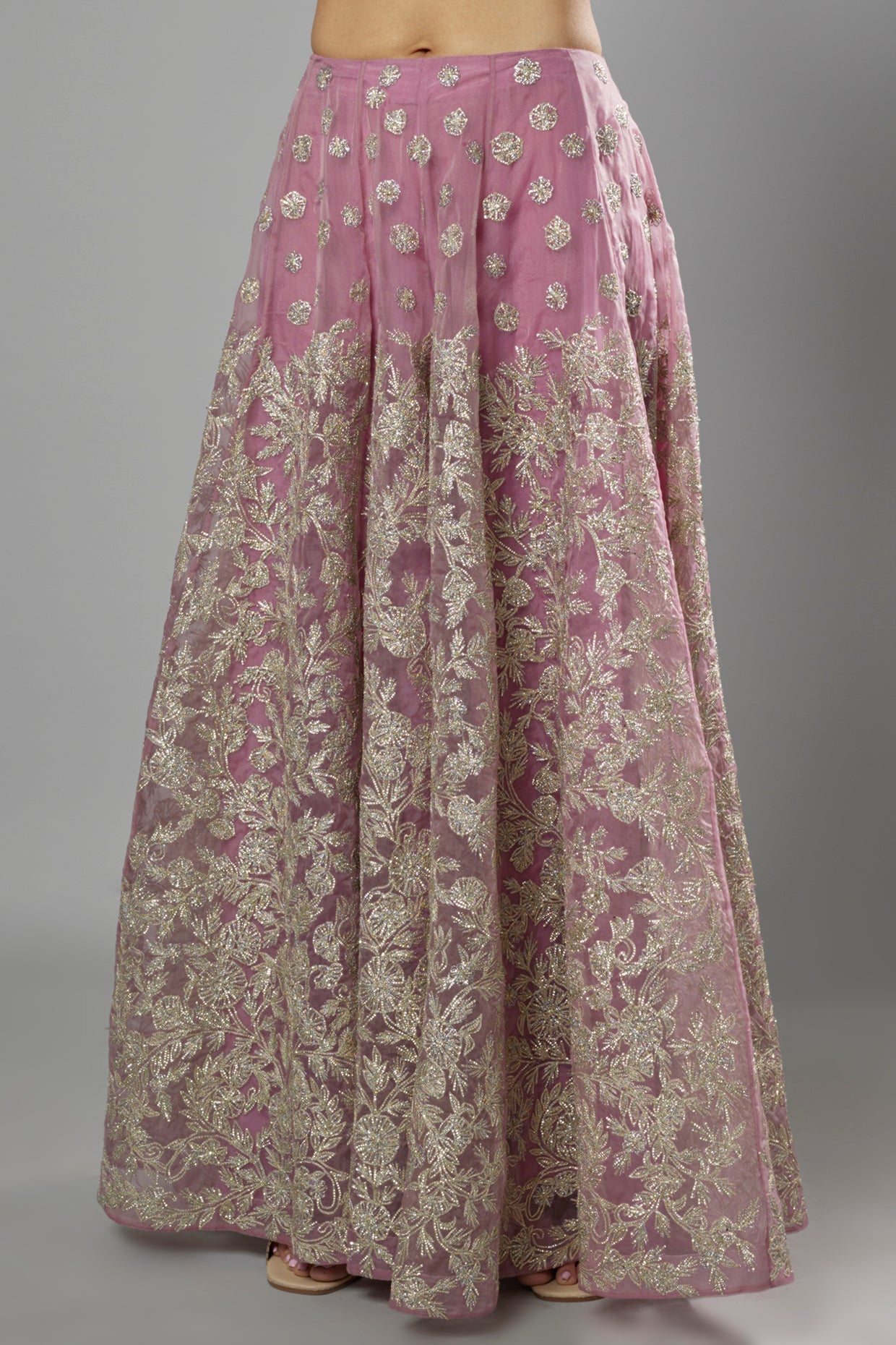 Featuring A Mauve Kurta In Organza Base With Lace And Sequins Embellishments. It Is Paired With Matching Machine Embroidered Sharara Pants And A Dupatta. Perfect For Festive Occasions Or Pre-Wedding Ceremonies.