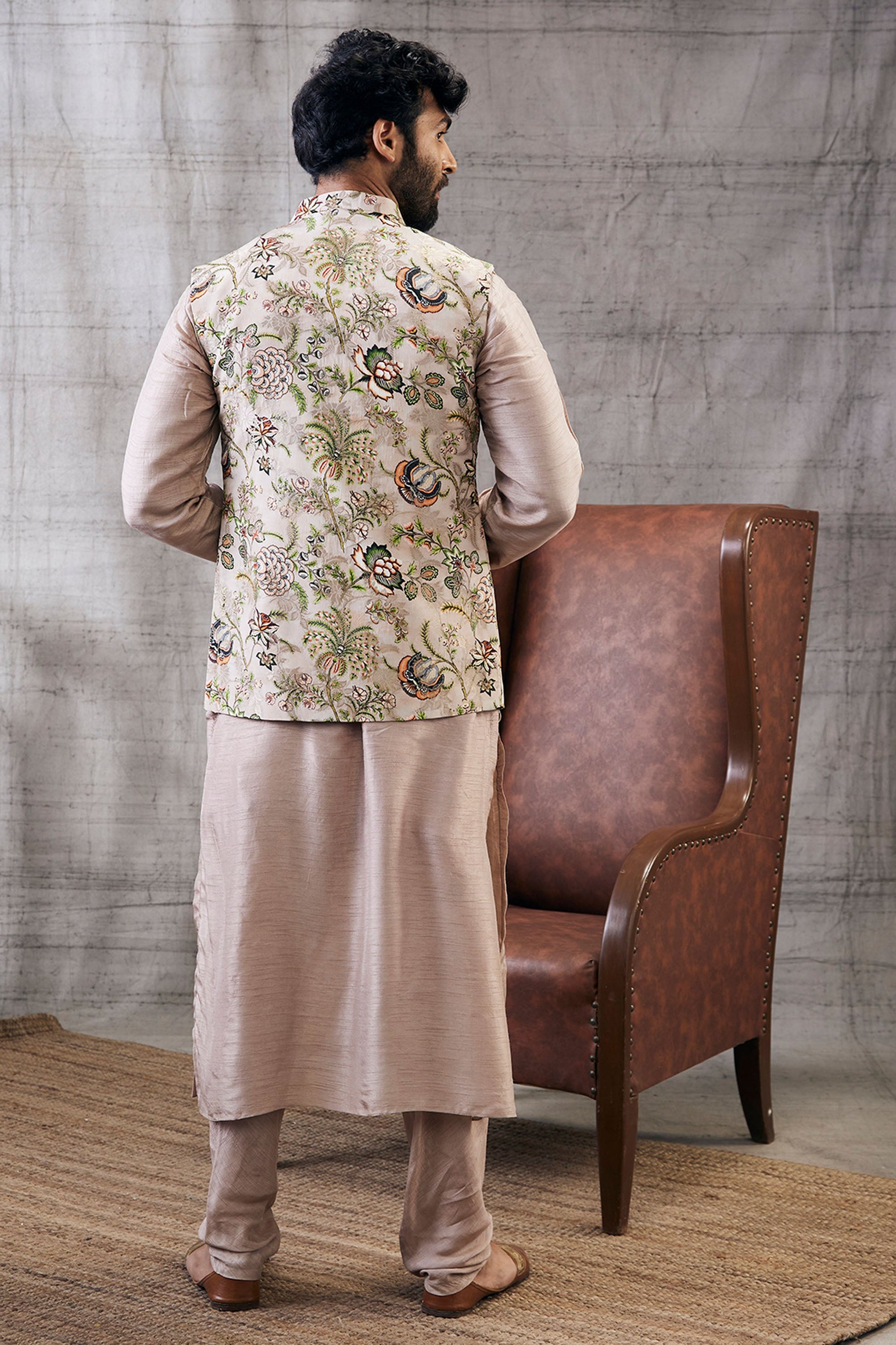 Beige Brocade, Malaysian Silk Mehr Printed Jacket With Kurta Set