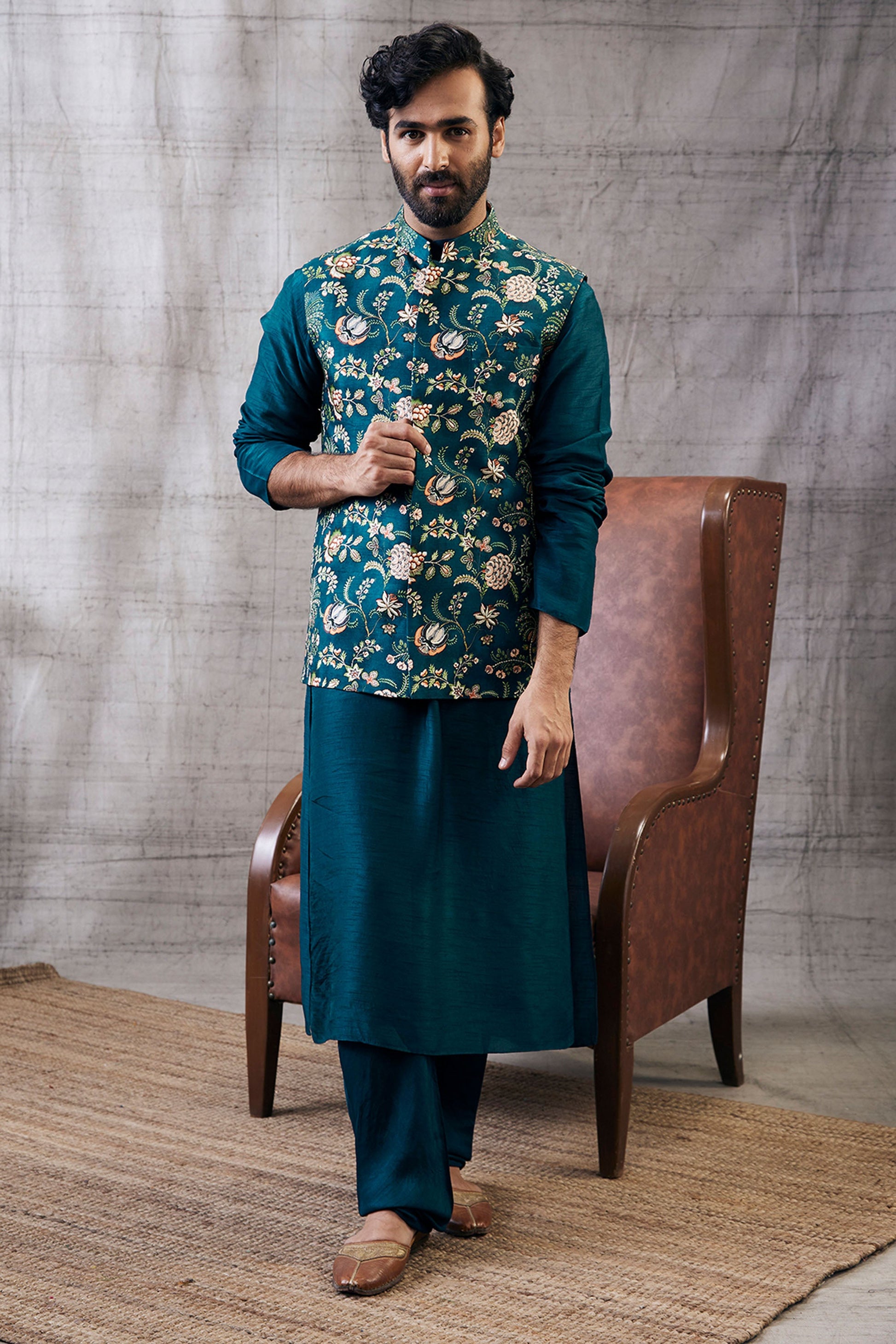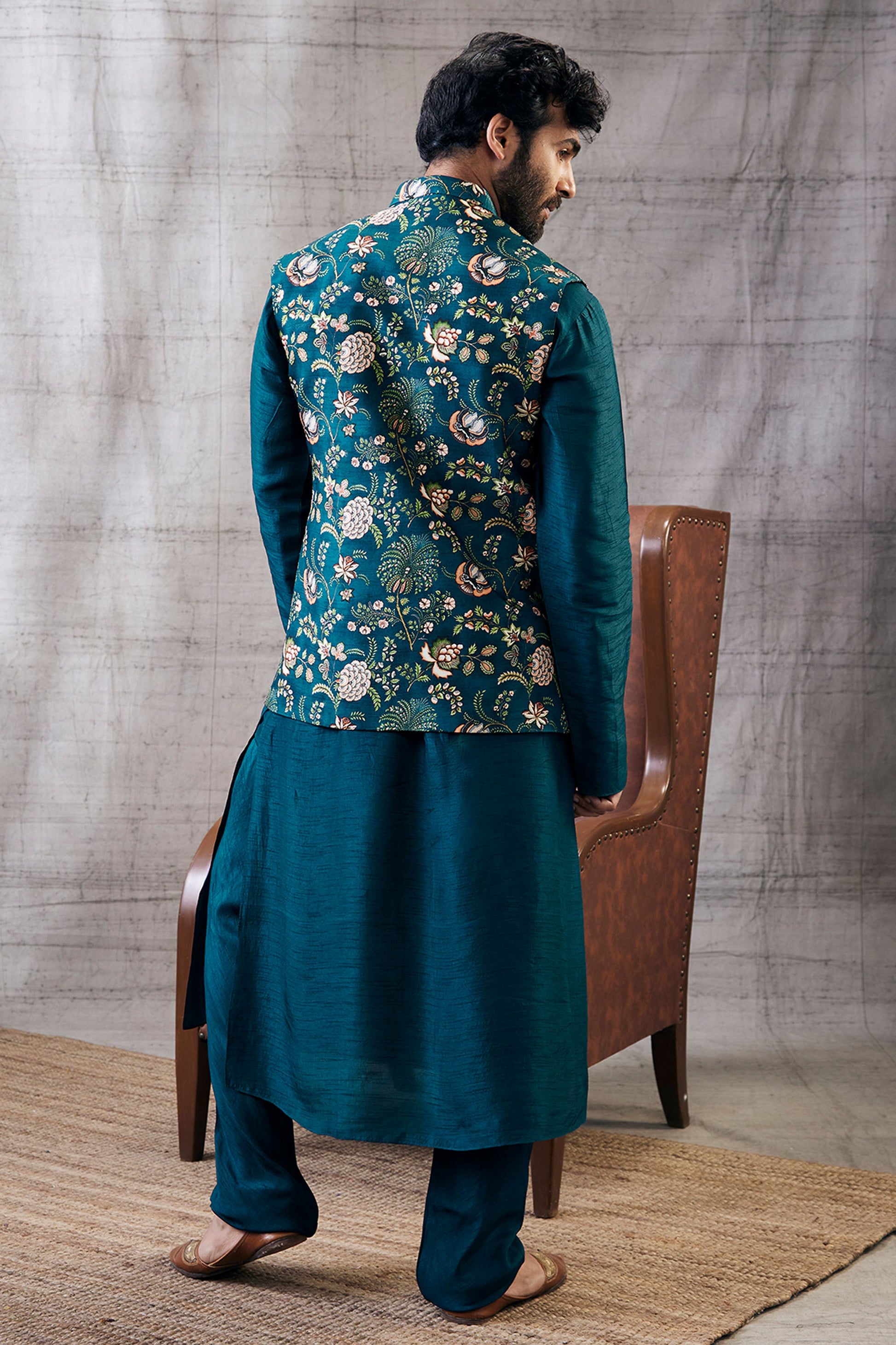 Green Malaysian Silk Mehr Printed Bundi With Kurta Set