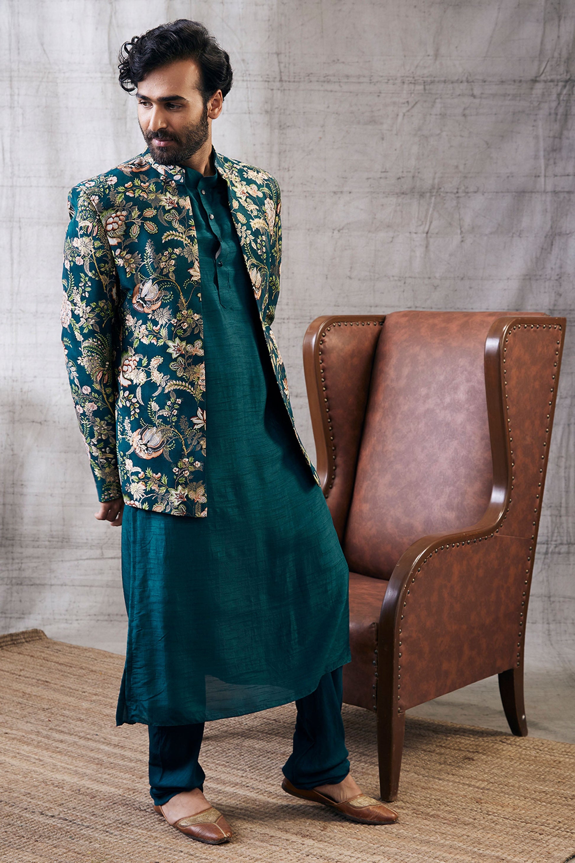 Green Malaysian Silk, Brocade Mehr Printed Jacket with kurta set