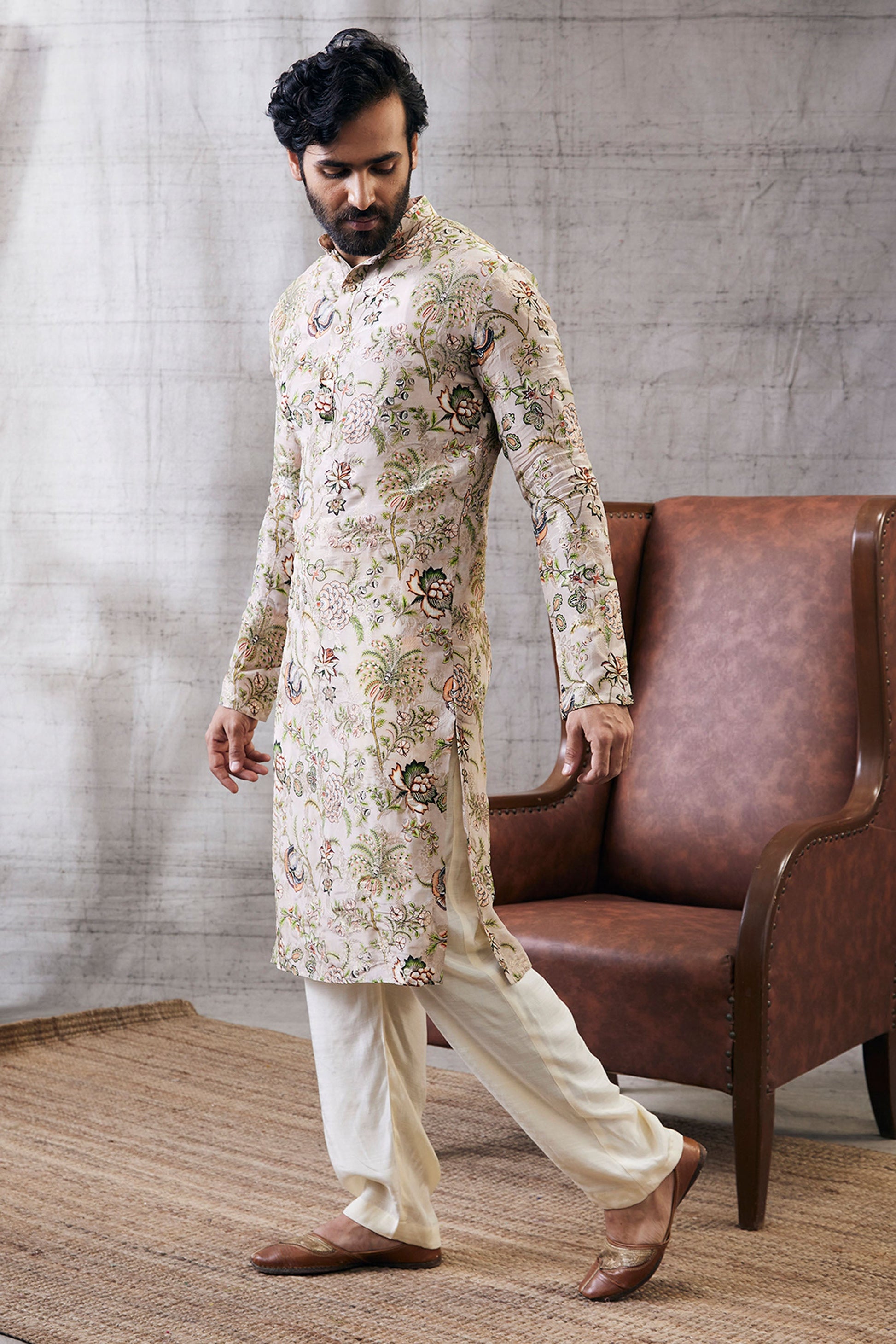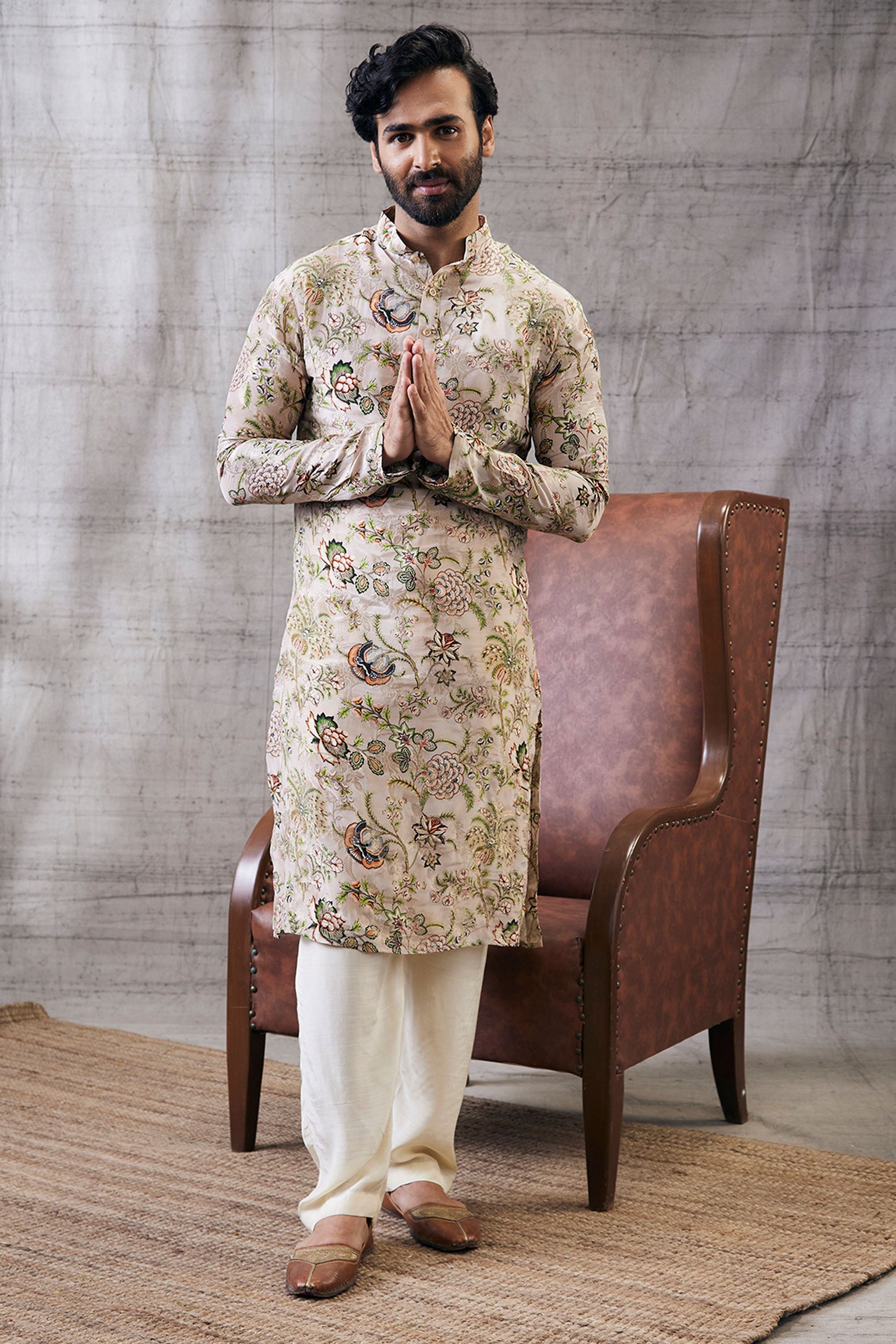 Beige Brocade, Malaysian Silk Mehr Printed Kurta Set