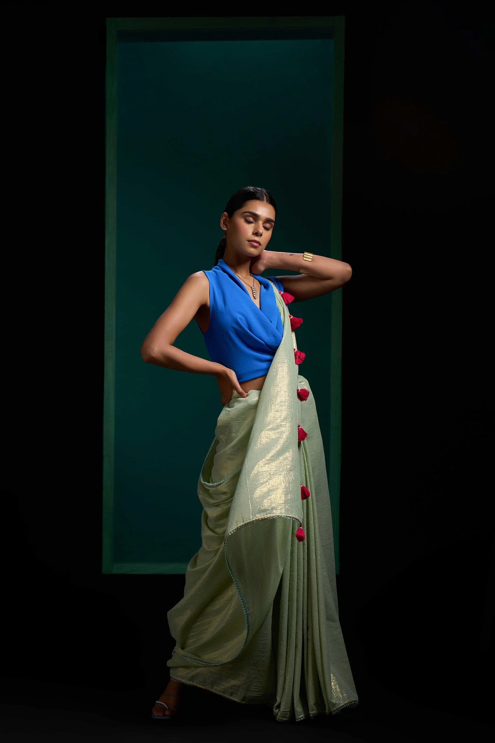This is in cotton zari fabric with pink color tassles at the pallu, saree fabric is soft and easy to drape. Mint and gold zari combination is perfect for any occasion.