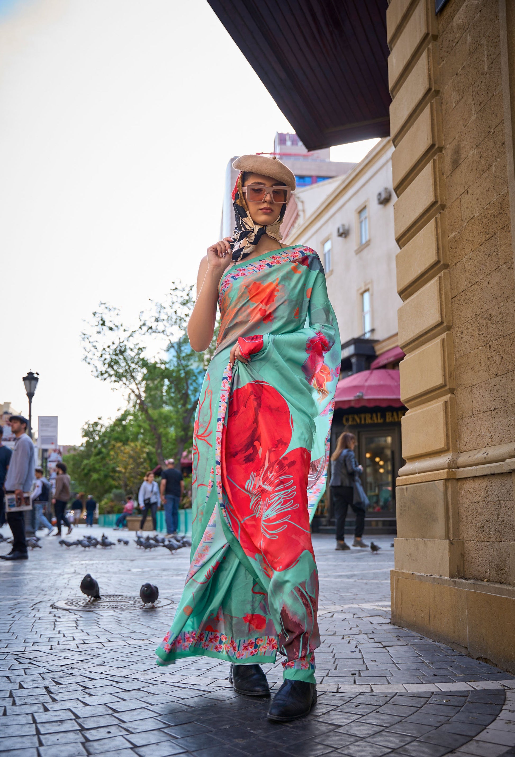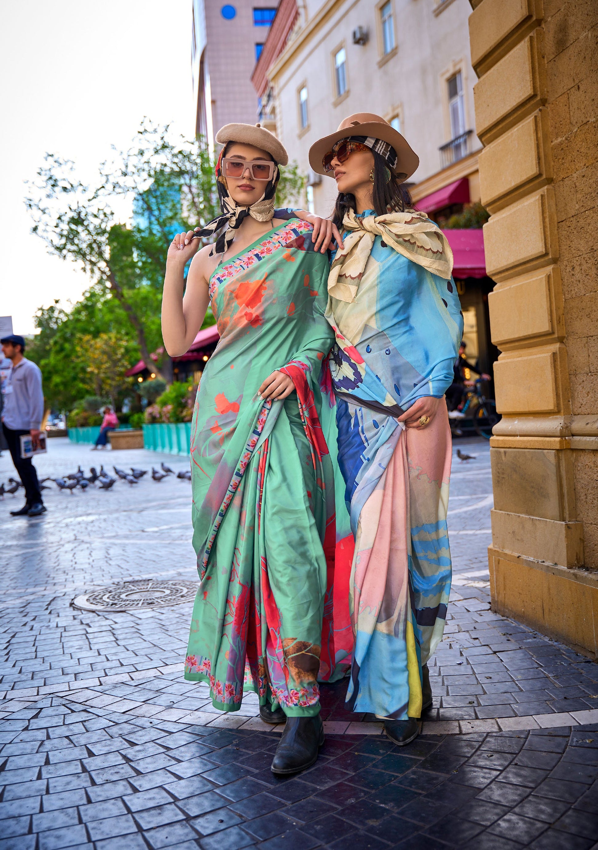Mint Green Krayon Pure Silk Crepe Print Saree