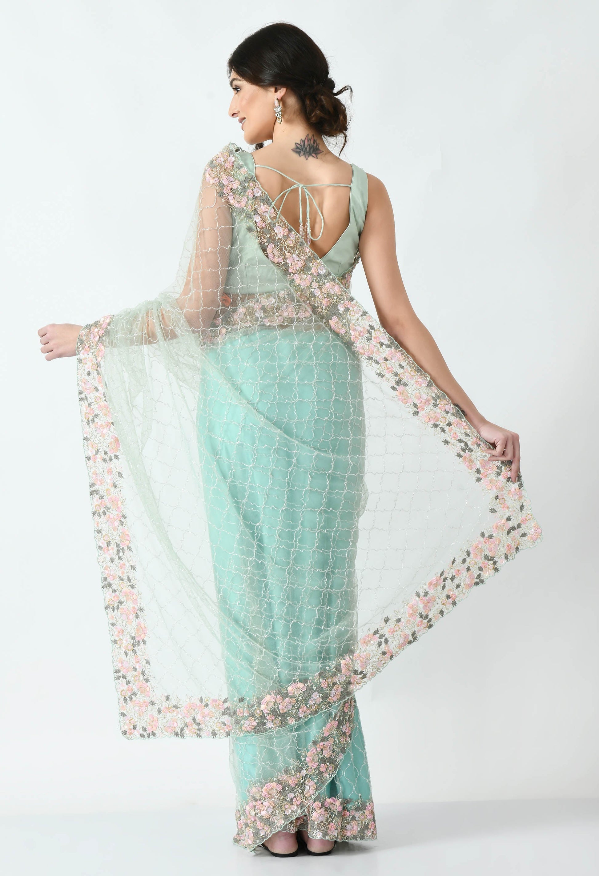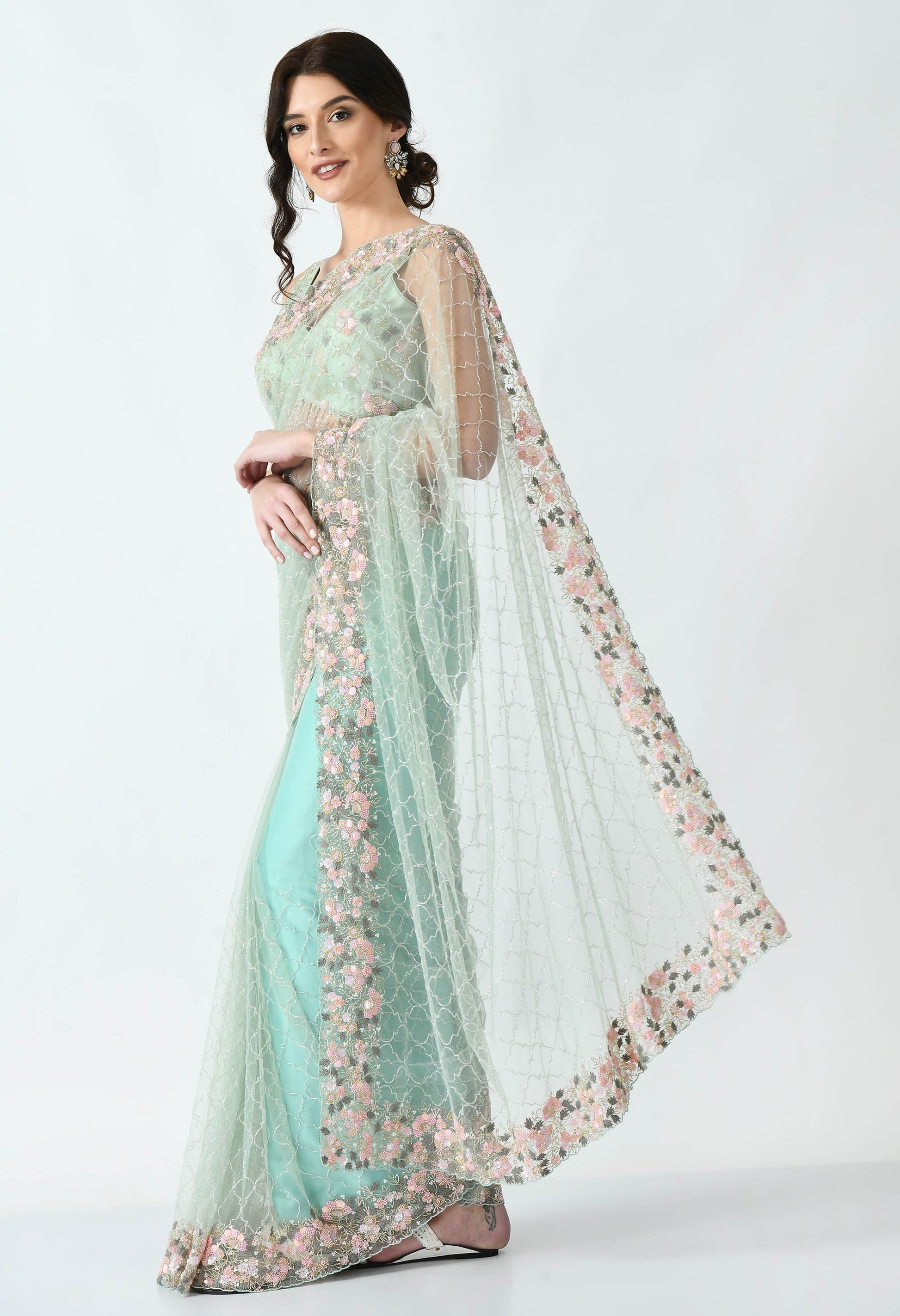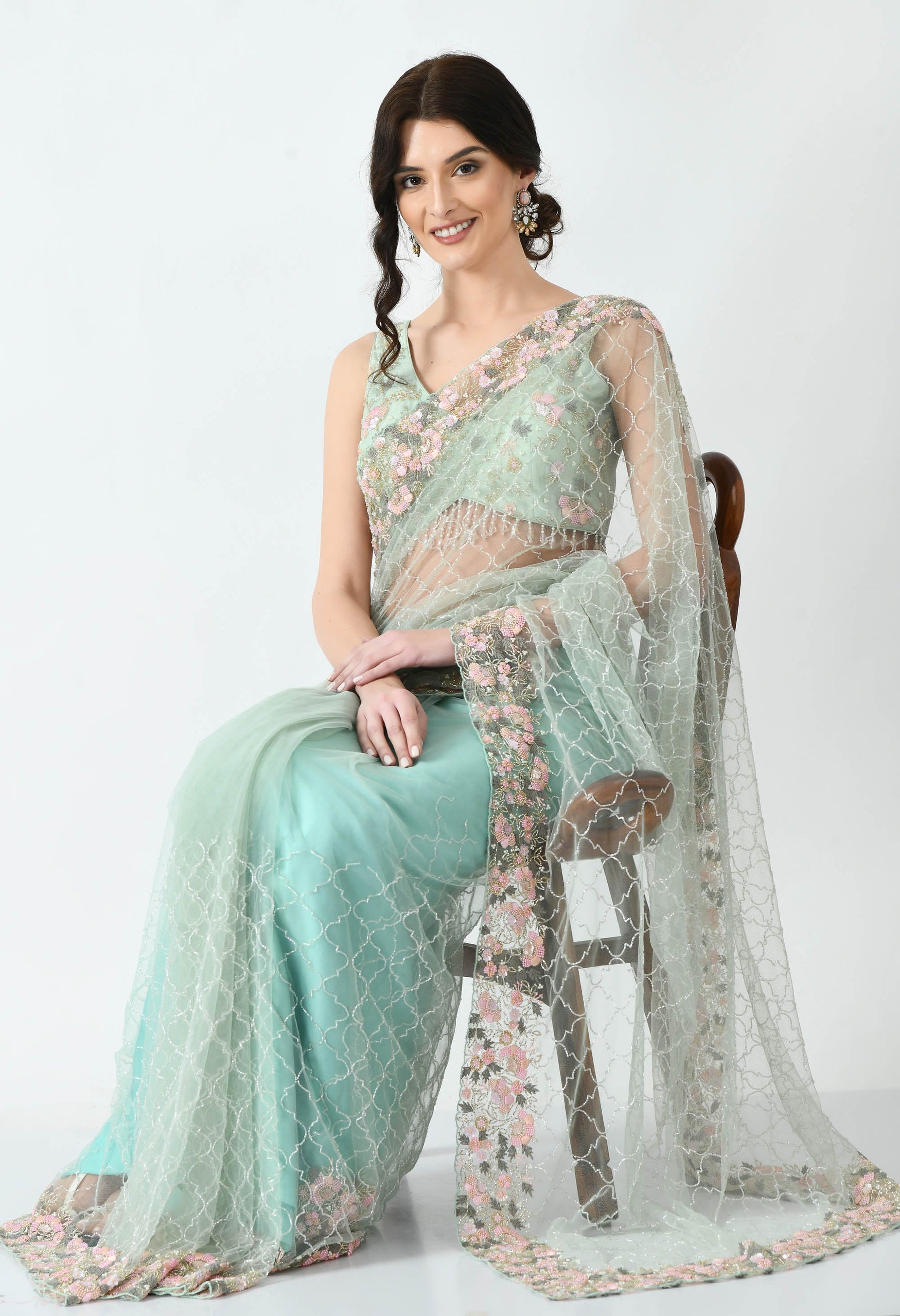 Gorgeous Mint Hand embroidered Net Special Designer Saree with hand embroidery floral work motifs. This is a saree that is tailor made efficiently with perfect exquisite detailing. Handmade to Embrace your special moments. Suitable for Parties , family gatherings and Weddings. Perfect for a Bride.