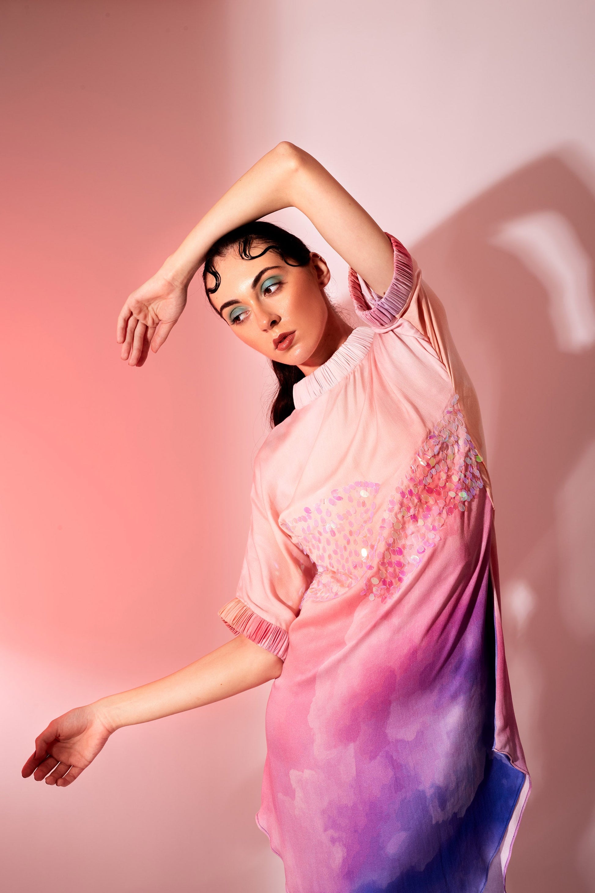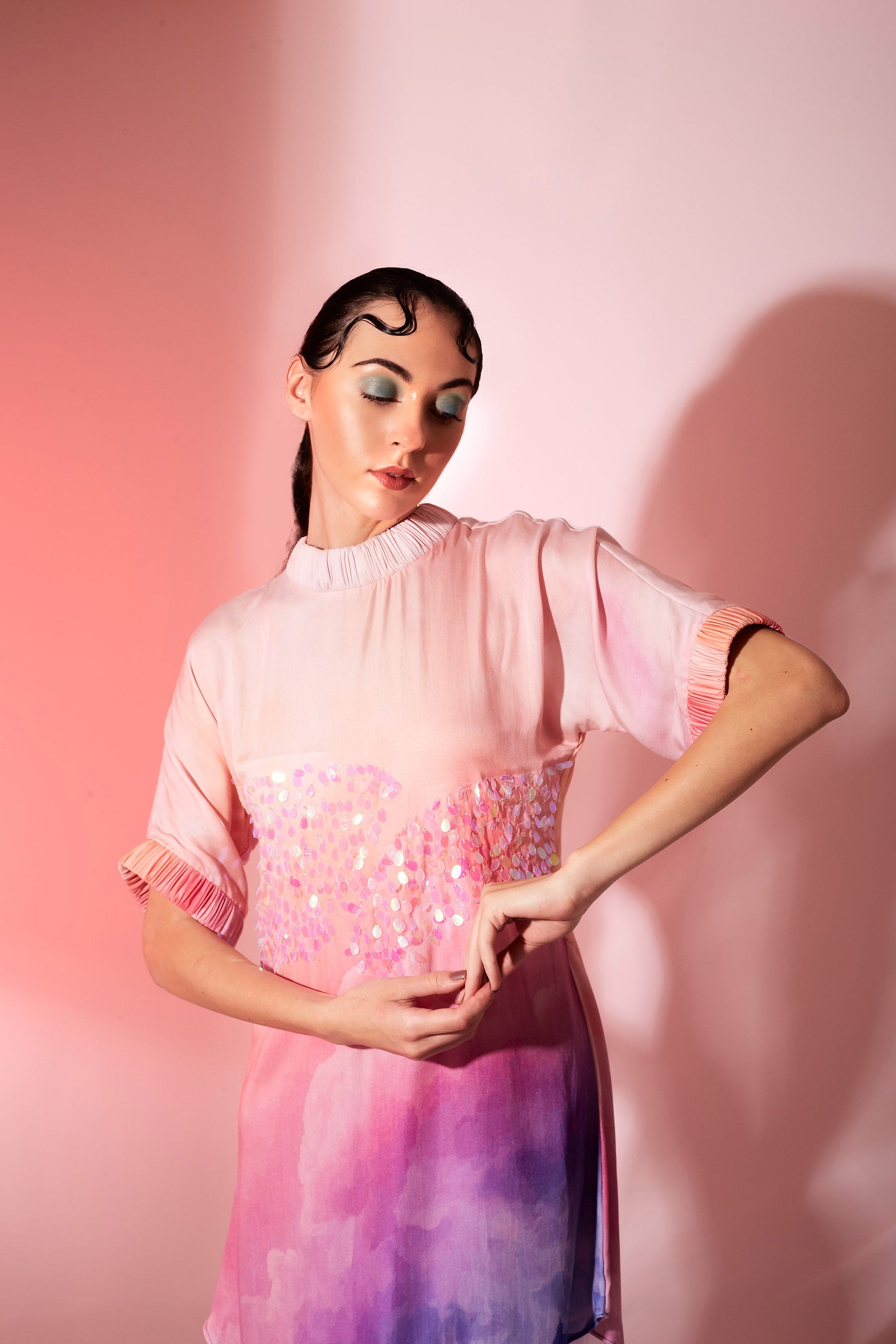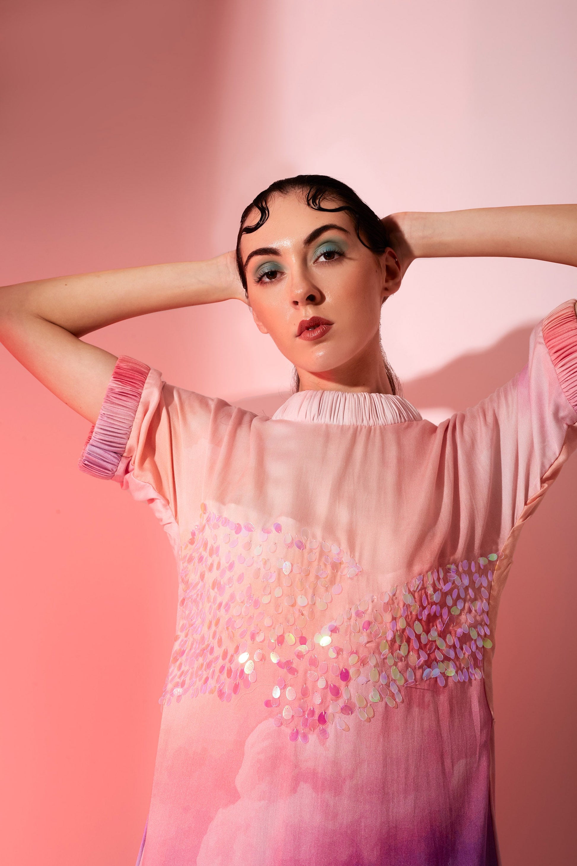 A holographic sequin embellished reiteration of a T-shirt into a dress for a relaxed day to night affair.