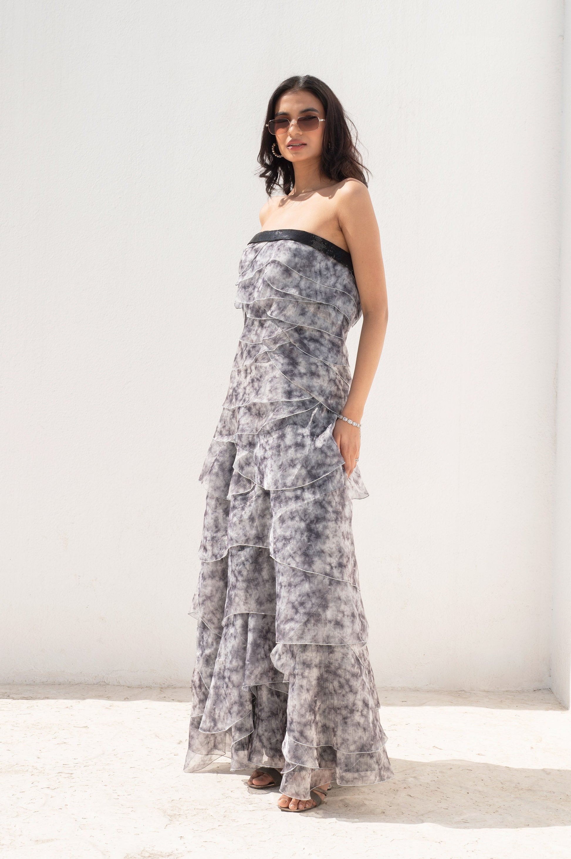 Crafted in airy organza, a strapless, layered ruffle gown in a stormy marble-dye print.