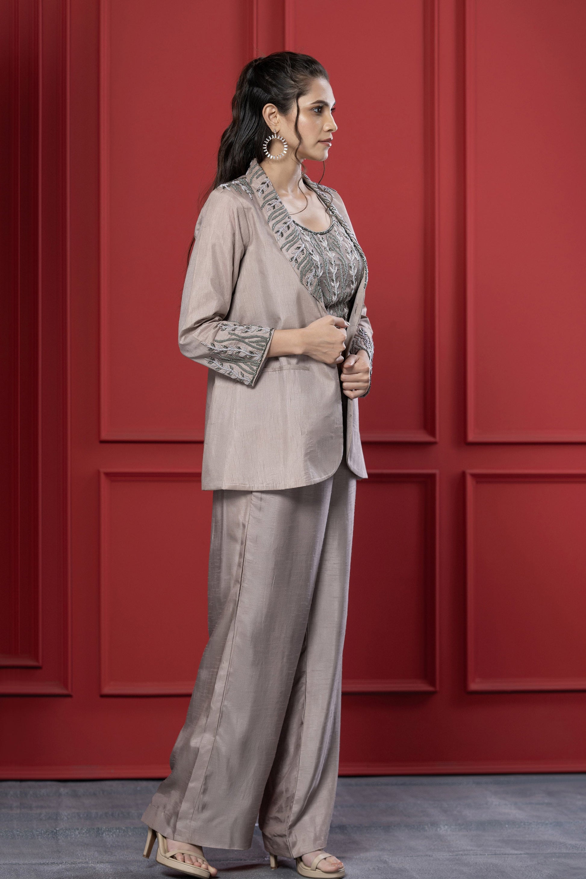 Monochrome Mauve Dola Silk cutdana Blazer Set